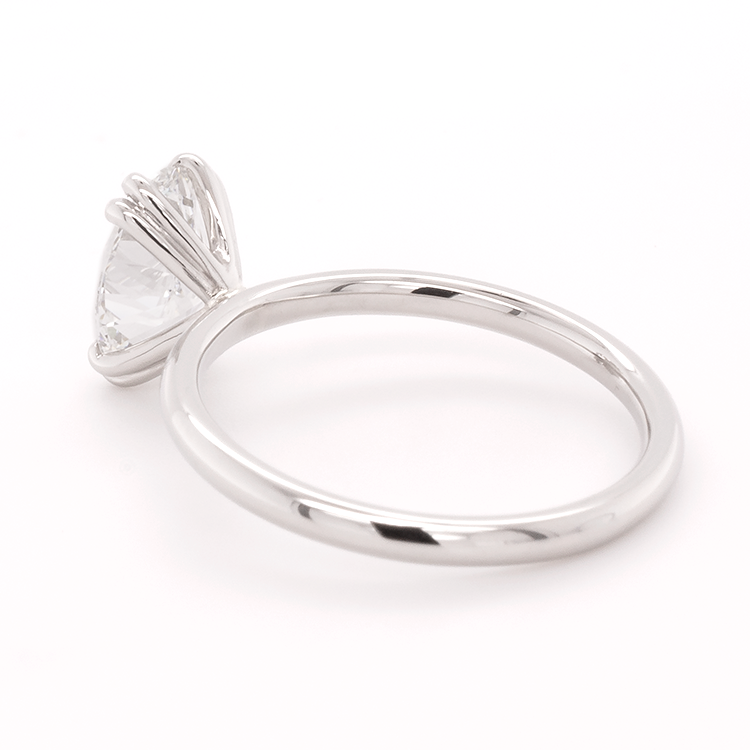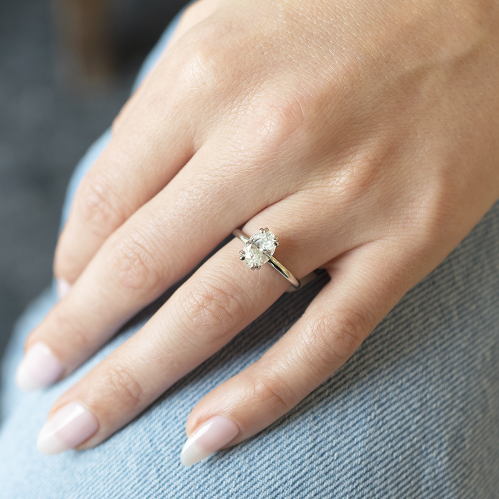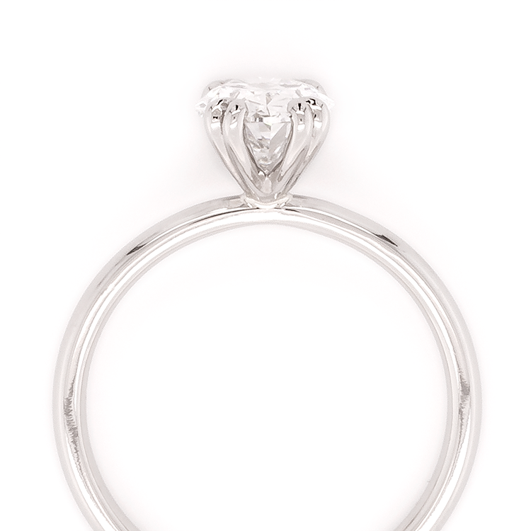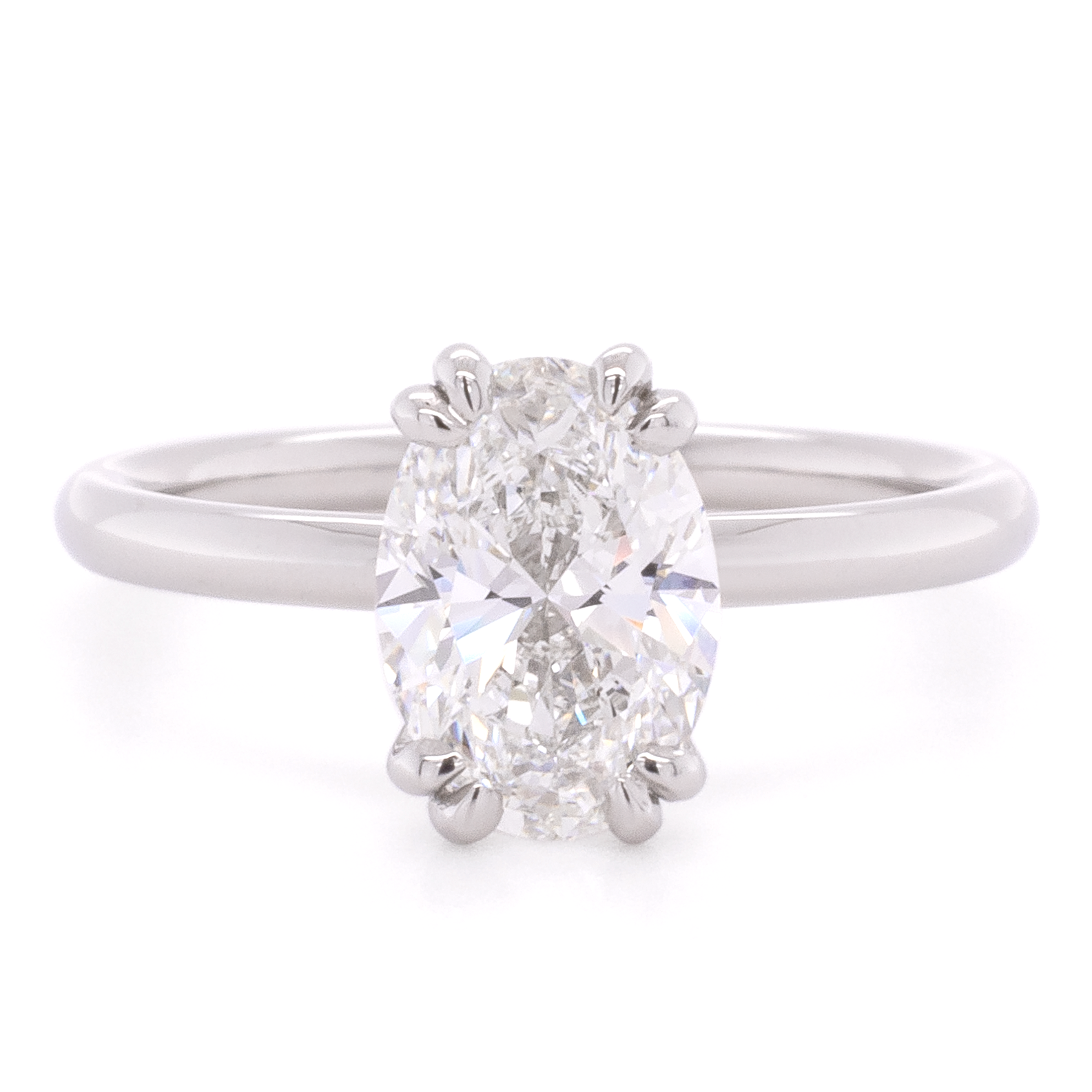 A beautiful oval diamond solitaire with delicate double prongs shaped in an open gallery for an extra lovely side profile. Will stack perfectly with all our bands.