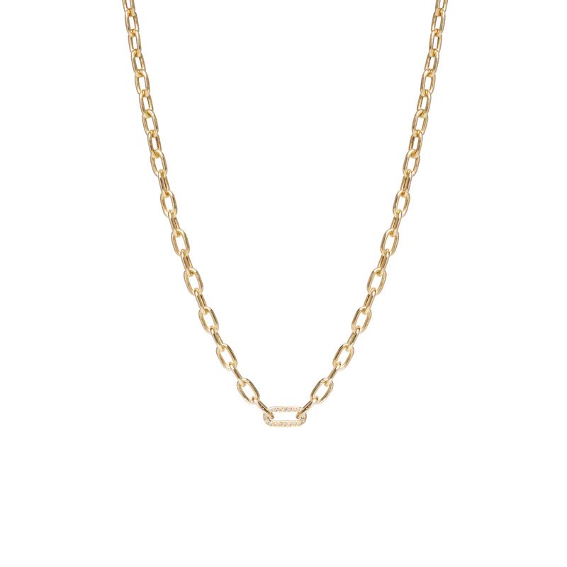 14k gold medium hollow square oval link chain necklace with a single pavé diamond covered link in the center with diamonds on both sides.