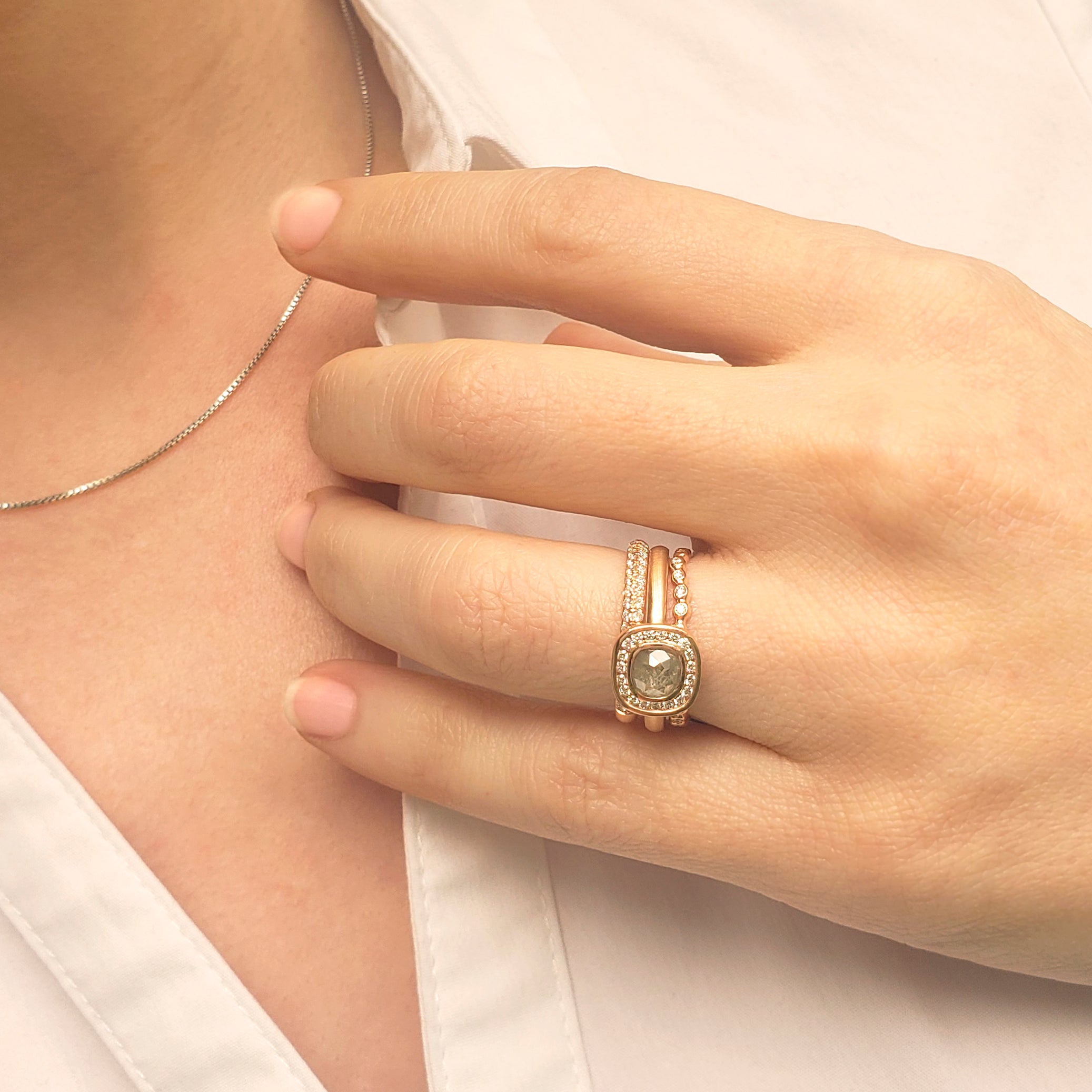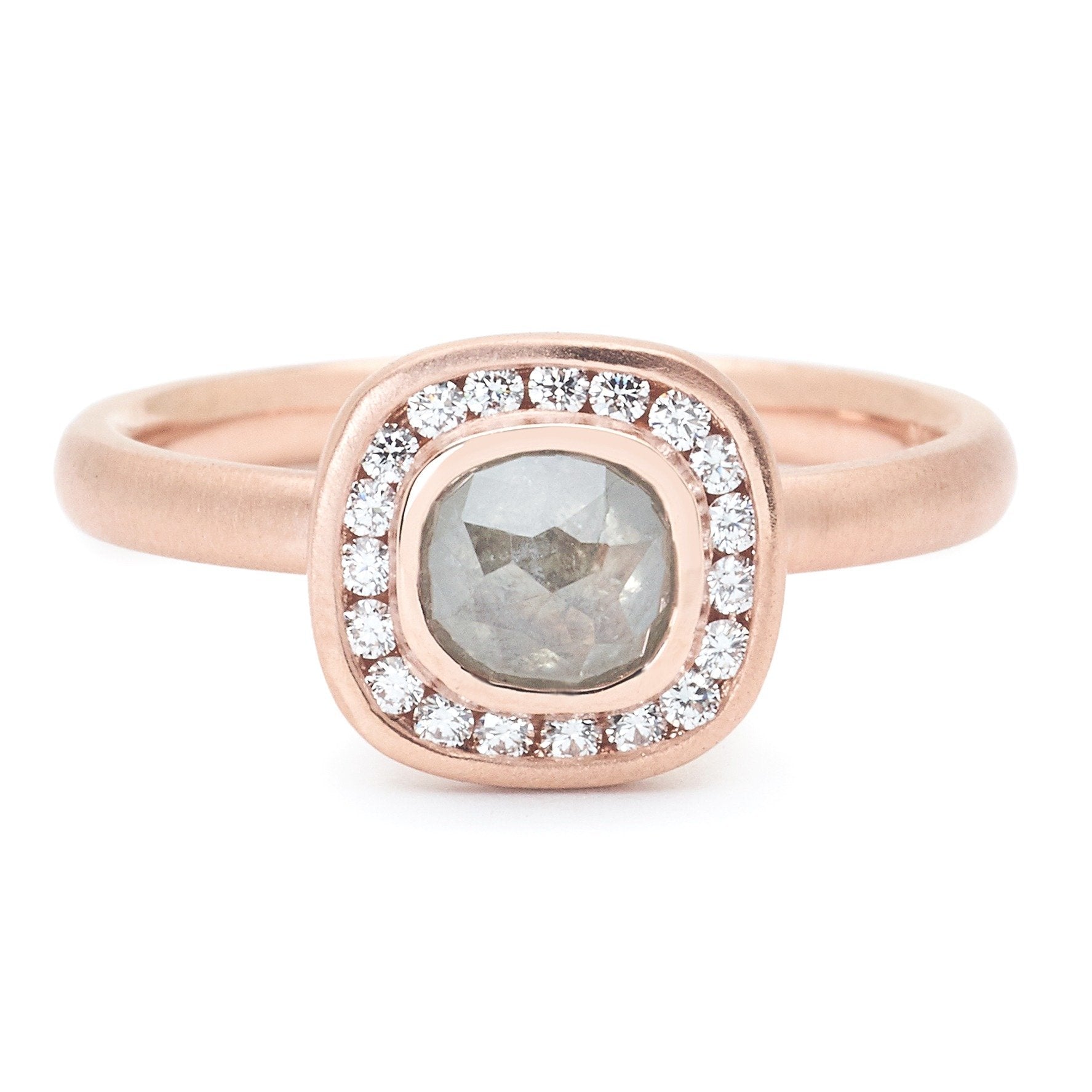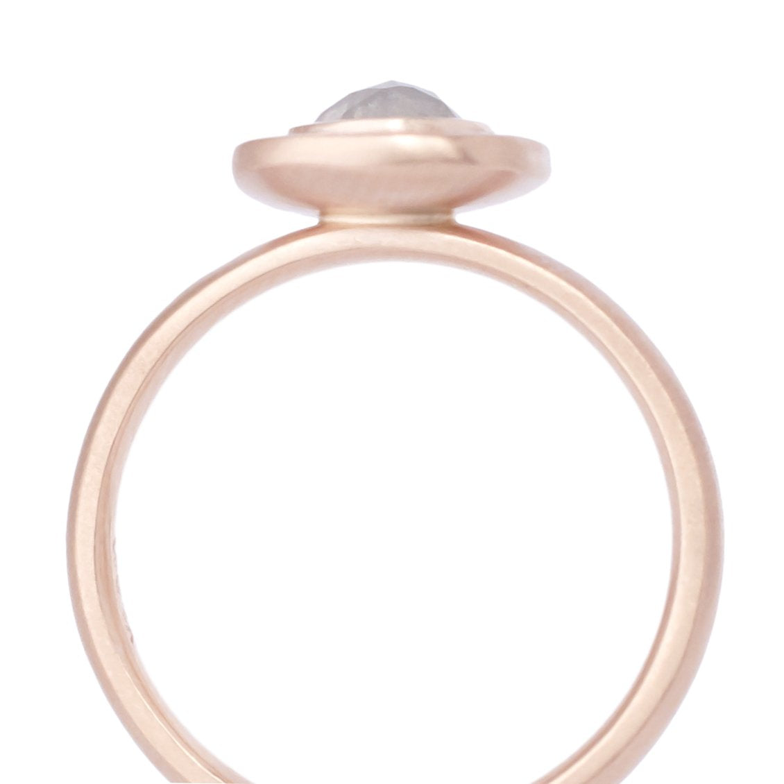 One of a Kind 14k rose gold ring with a bezel set 0.56ct clear/milky cushion rose cut diamond, surrounded by channel set white diamonds,