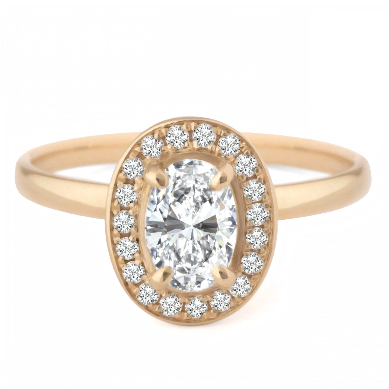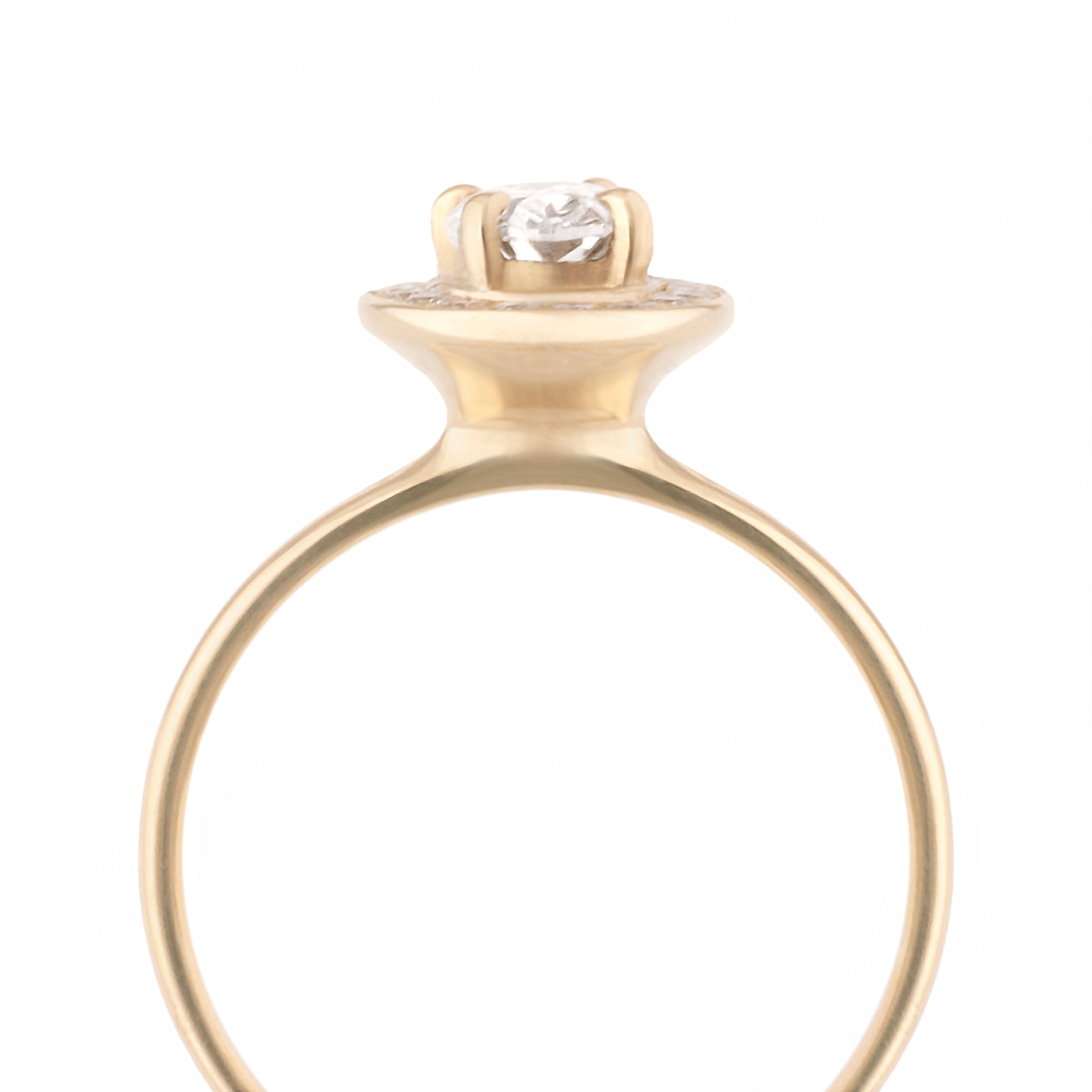 One of a Kind 18kt yellow gold ring with a .54ct brilliant cut oval diamond (F colour, VVS clarity), pave halo of 19x.005ct round brilliant cut diamonds. Band ~1.66mm. Approximate ring dimensions ~10.5mm height, 8.2mm width, 6.1mm depth.
