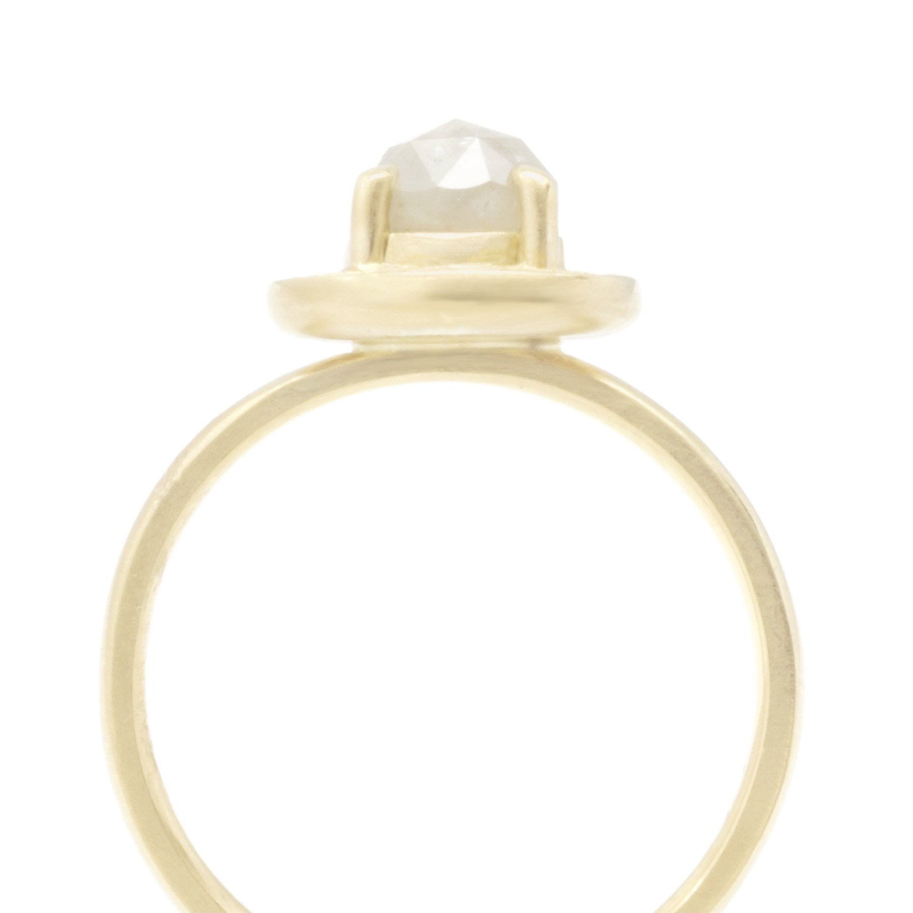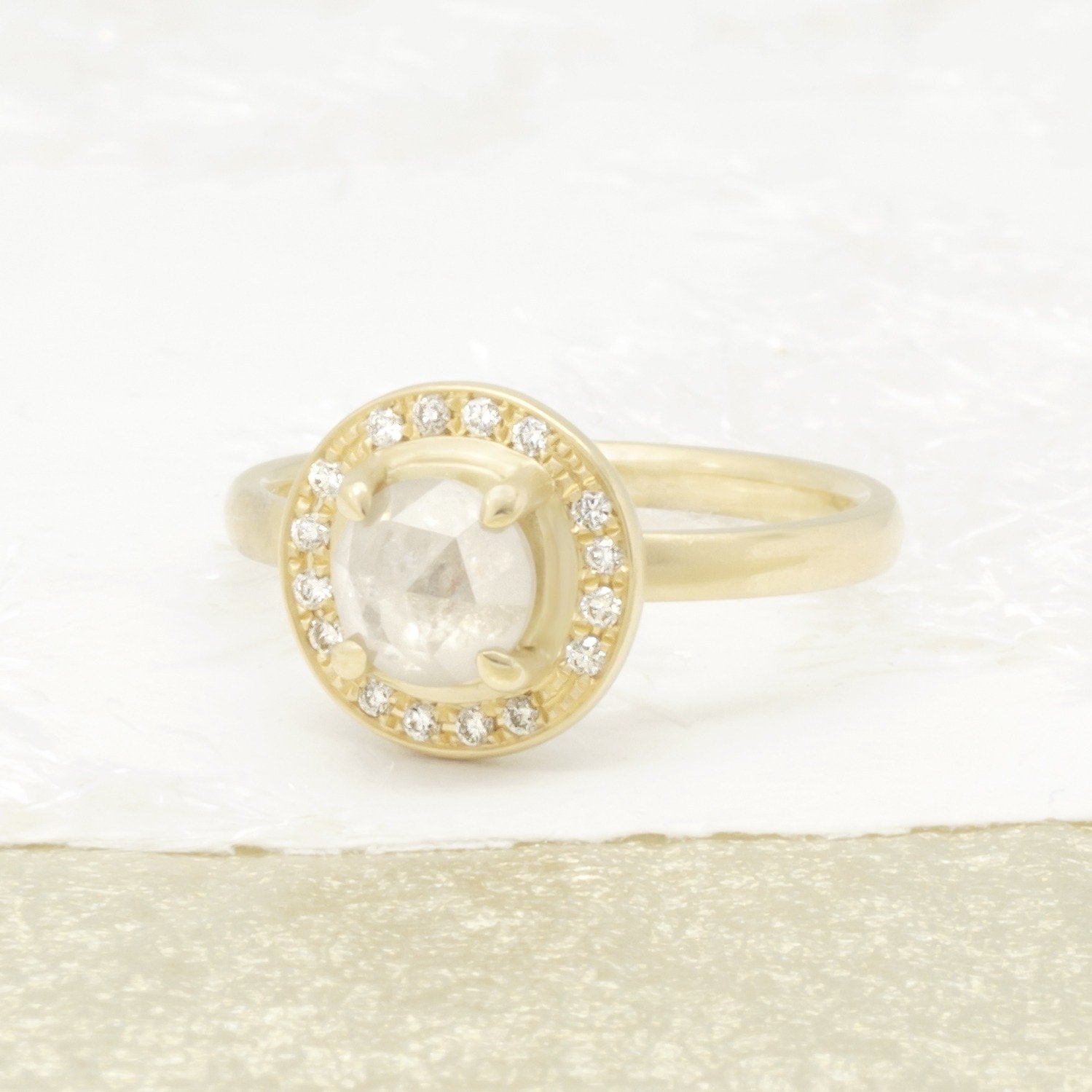 1.04ct round clear/white rosecut diamond (5.8mm)haloed by 16x0.005ct single row pave white diamonds in 18ky gold.