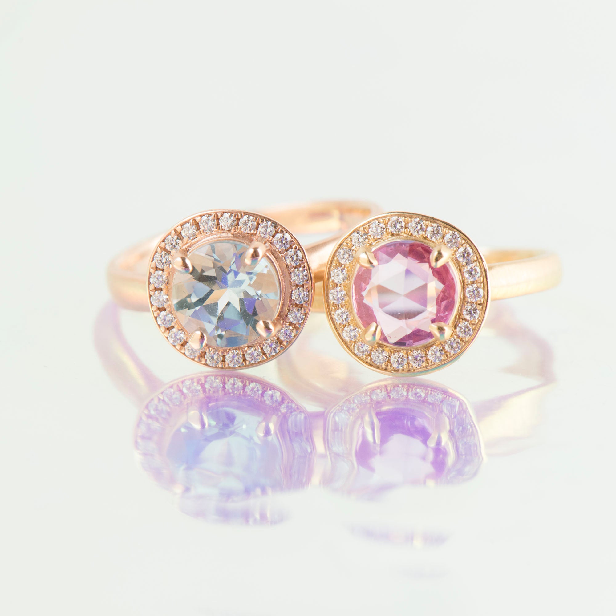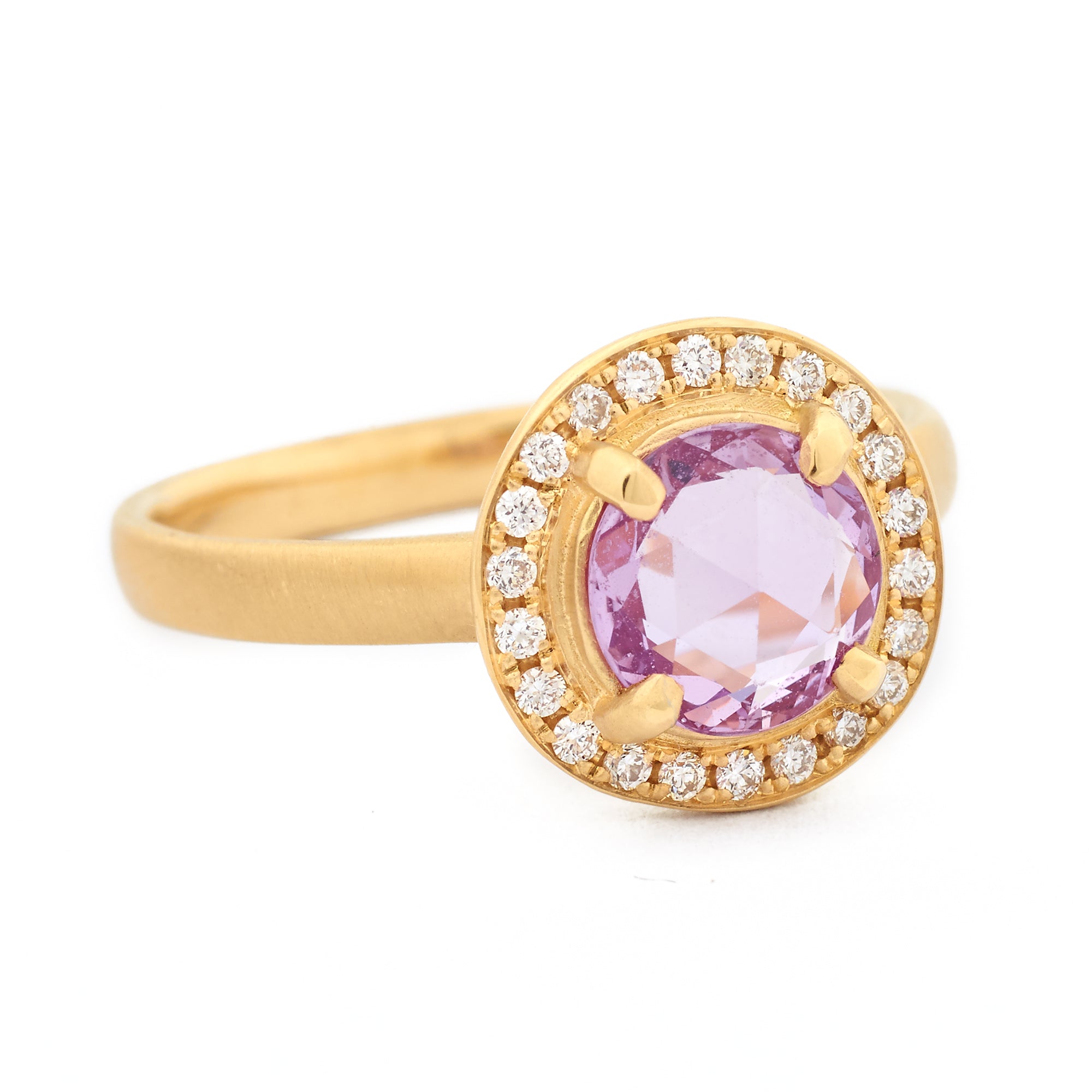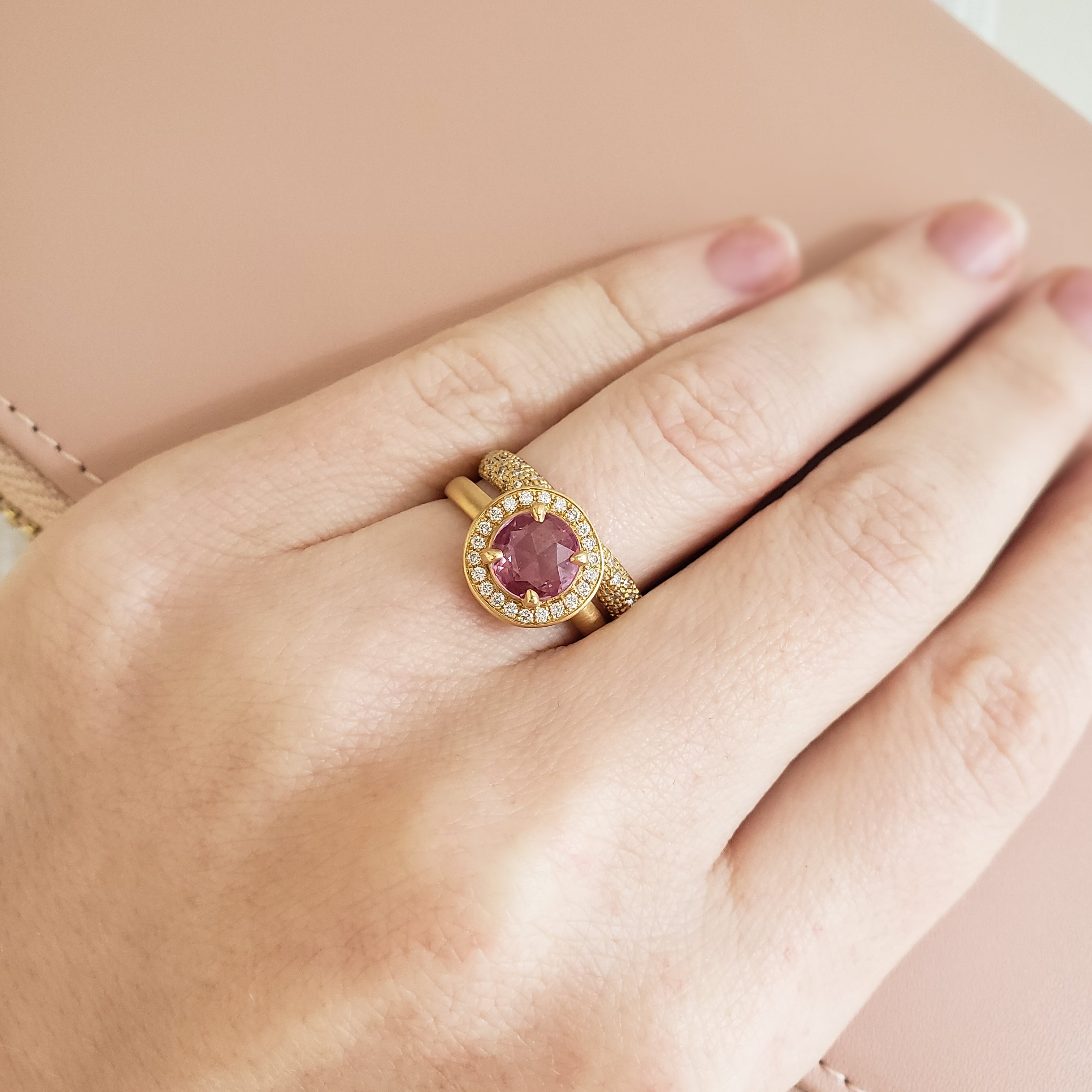Beautiful rose cut pink sapphire set in gold ring with a claw set circled by white round brilliant cut diamonds