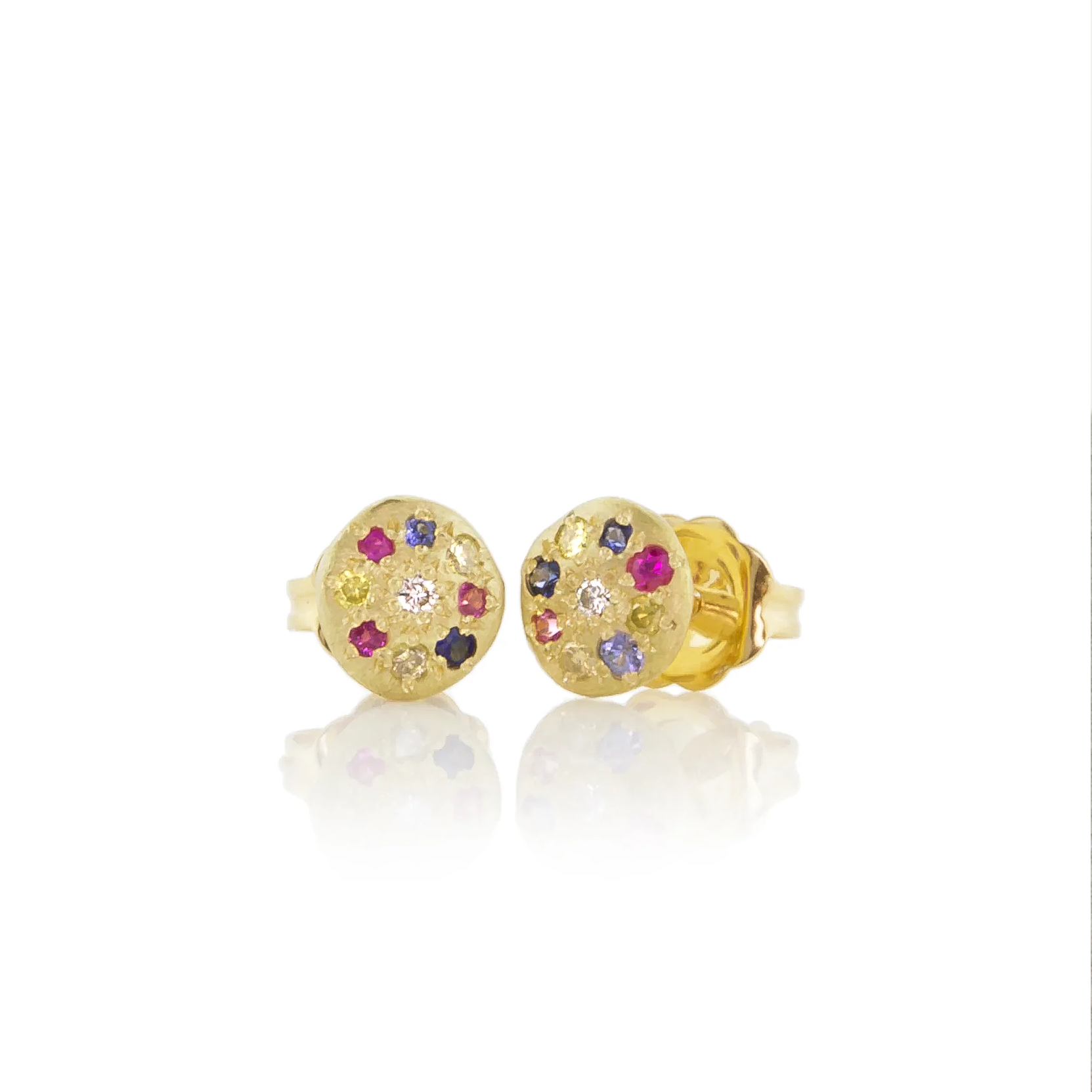 Brilliant and dazzling, the Charm Stud Earrings are petite and perfect for everyday wear. Rainbow sapphires and diamonds make these handcrafted, 18K gold stunners with a satin finish a lovely cluster of sparkles.