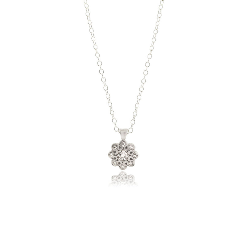 The silver rendition of our Moonflower charm pendant shimmers with celestial grace, cradling precious gemstones like dewdrops caught in moonlight. A timeless bloom forged in starlight, it whispers elegance and mystery, echoing nature’s quiet enchantment in every delicate curve.