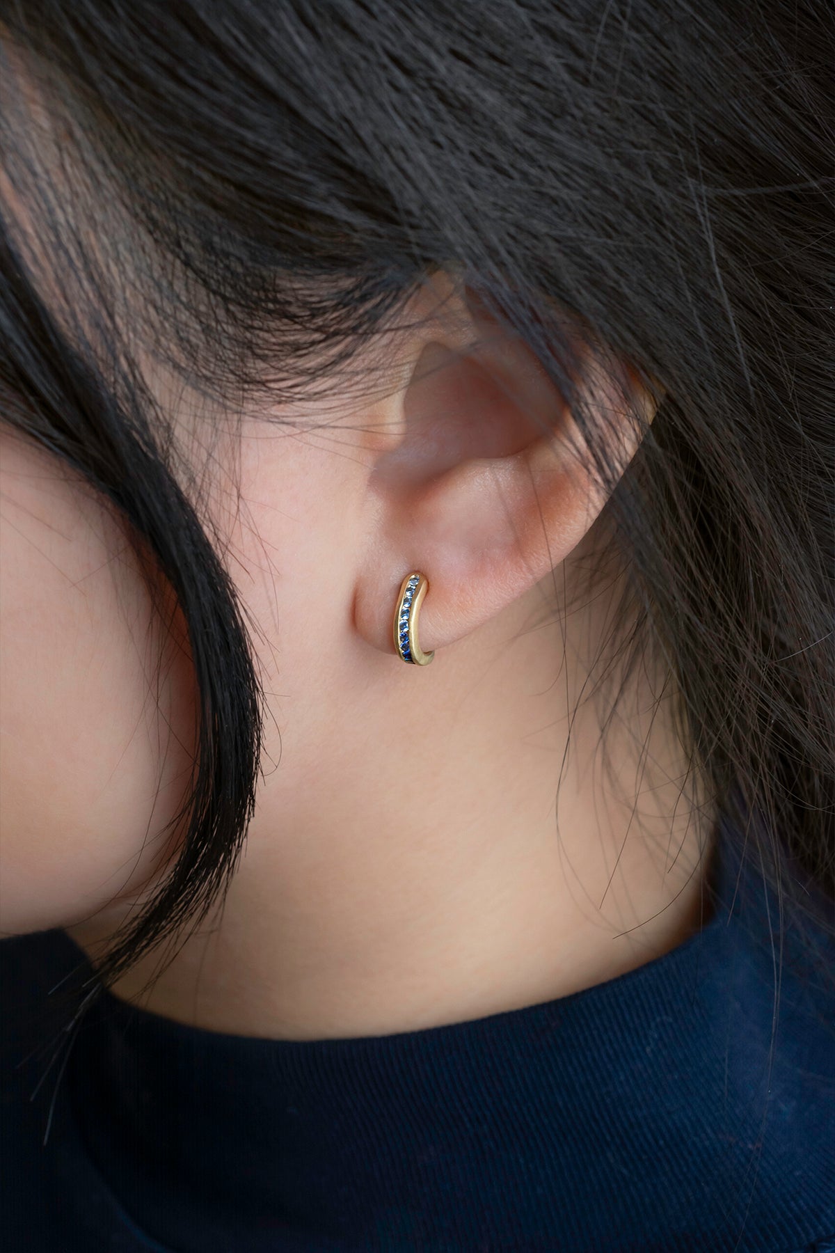 Enchanting ombre blue sapphires glimmer in our "Cove" open huggie hoop earrings.