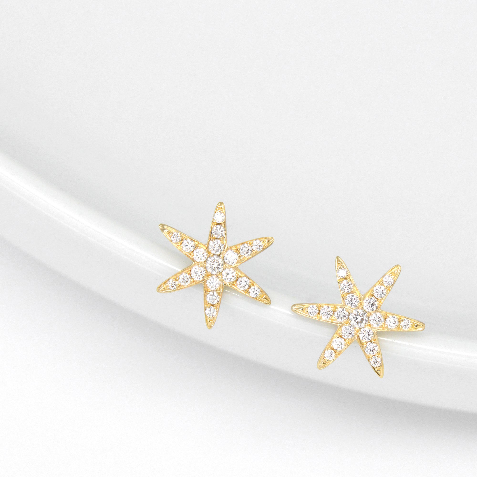 Diamond gold 'Celestial' star stud earrings with graduating diamonds paved on one side.