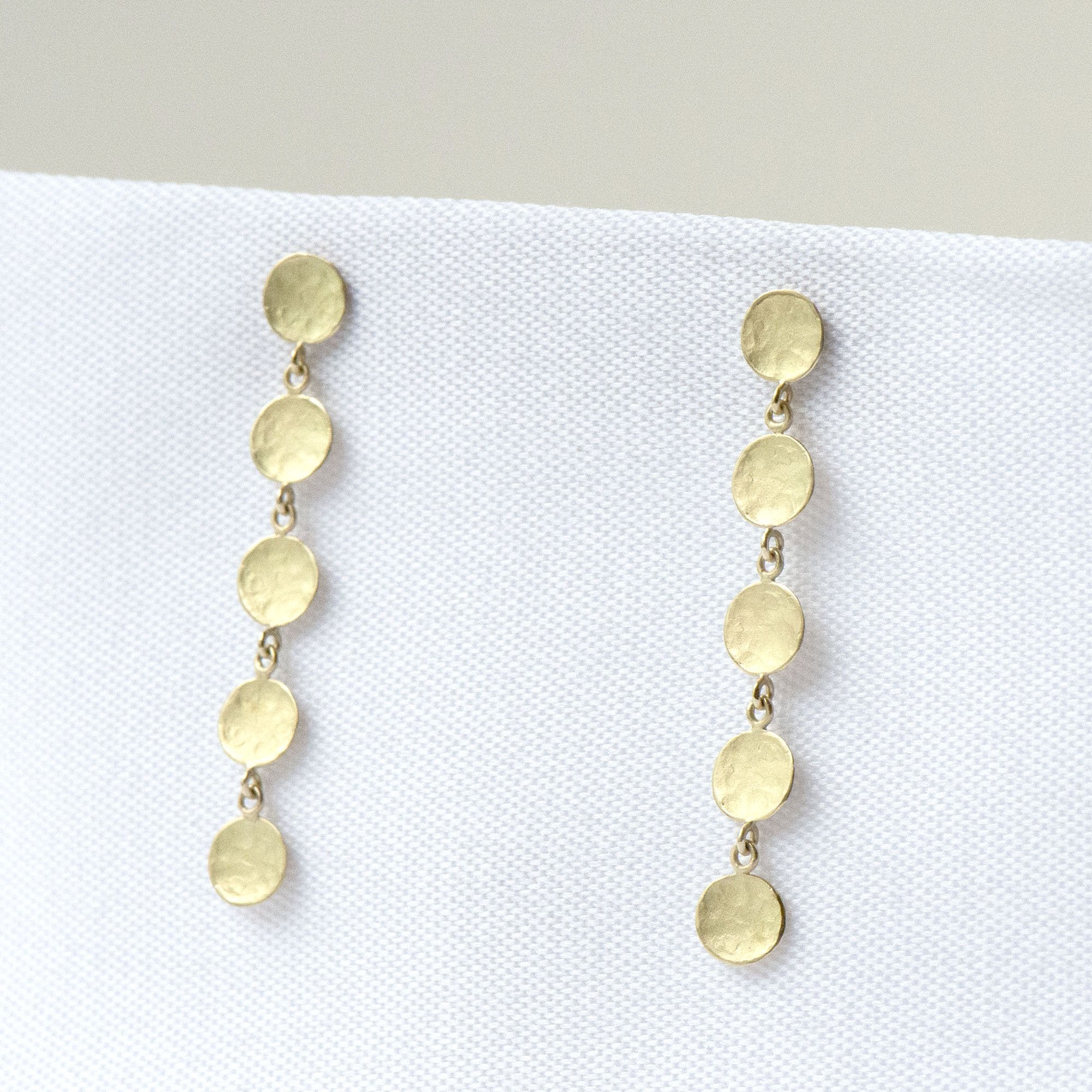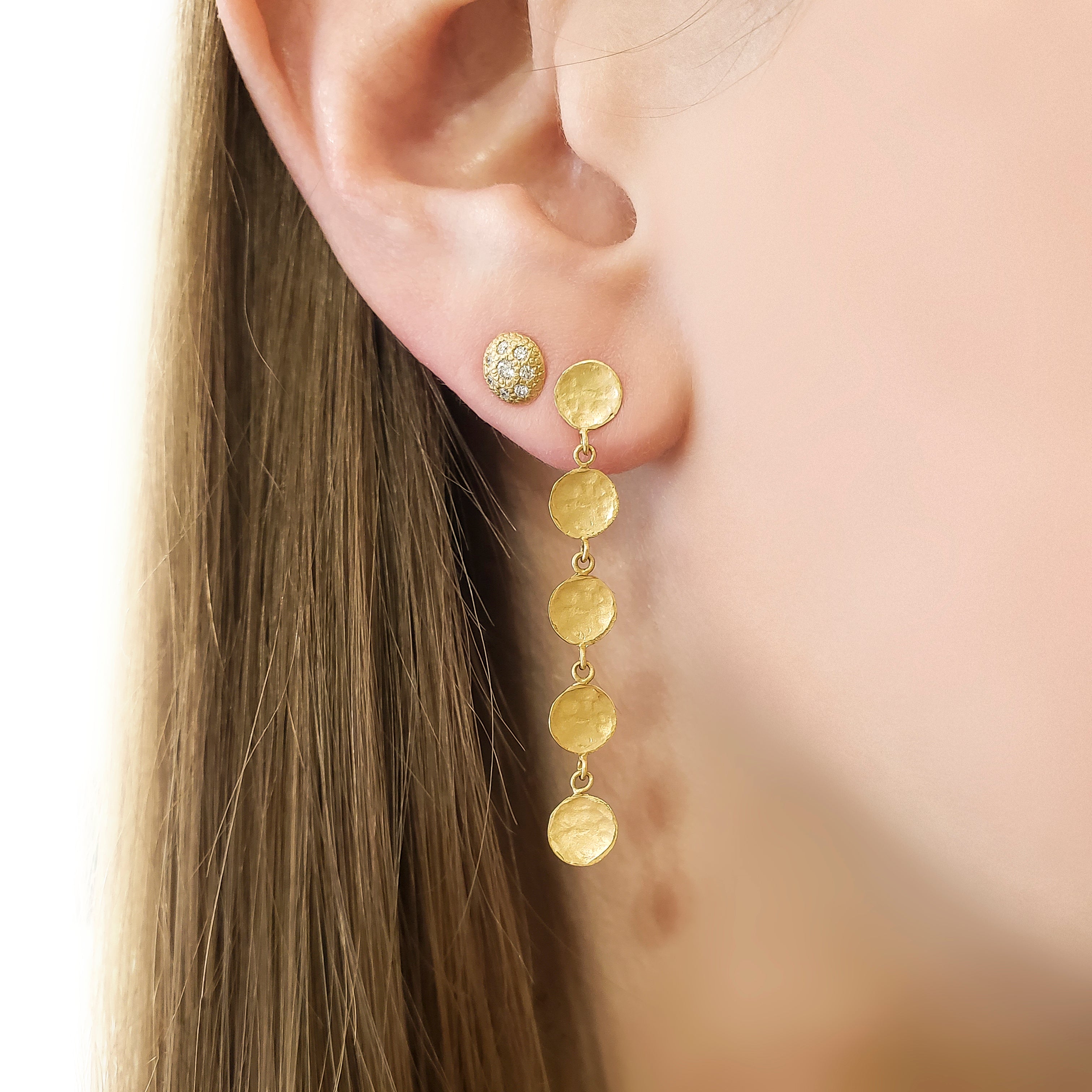 A cascade of our mini gold hammered discs falls from the perfect stud to keep them secure.