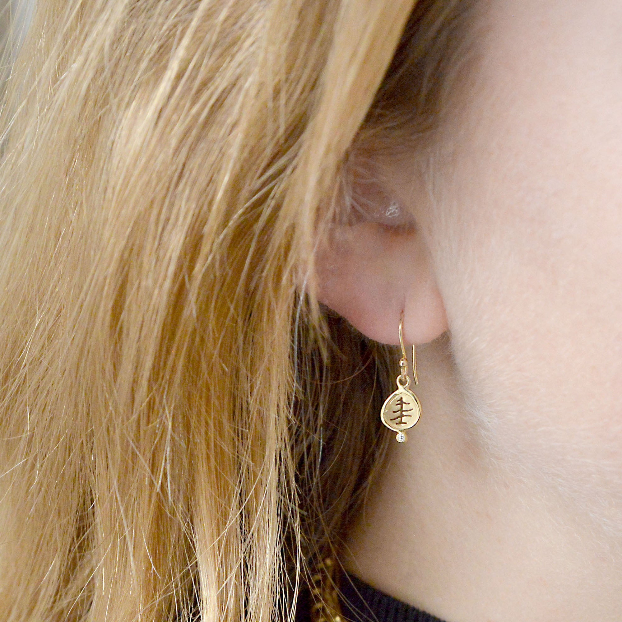 Gold hook tree earrings with 1 x 0.01ct round brilliant cut G/VS diamonds, ~0.02 total carat weight.