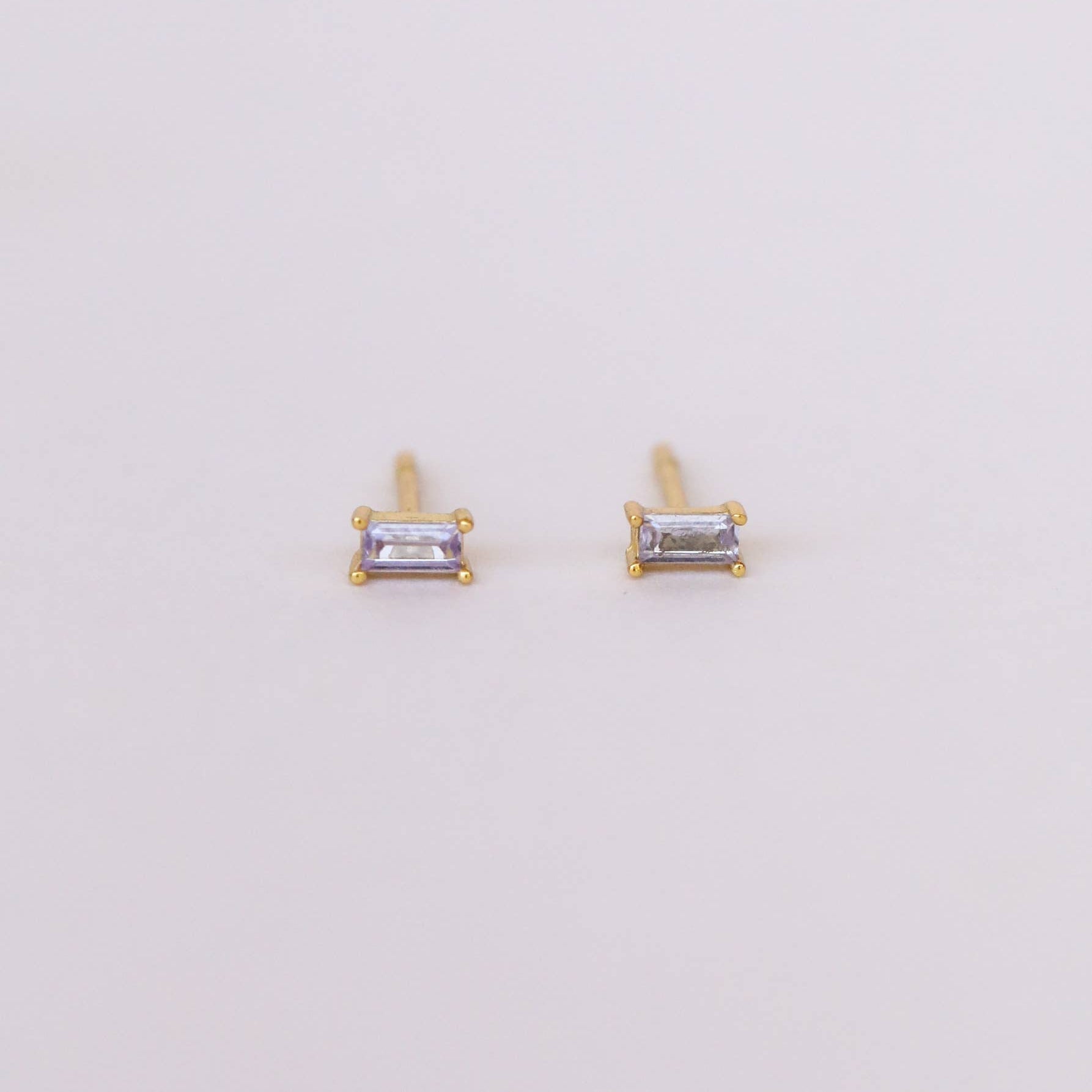 A pair of classic baguette stud earrings designed to add a pop of color. Made for stacking, layer in this classic shape for a fresh new look. Sterling Silver Posts – 18K gold plating over brass Hypoallergenic – Lead Free Lilac purple-colored CZ stone 5mm x 2mm