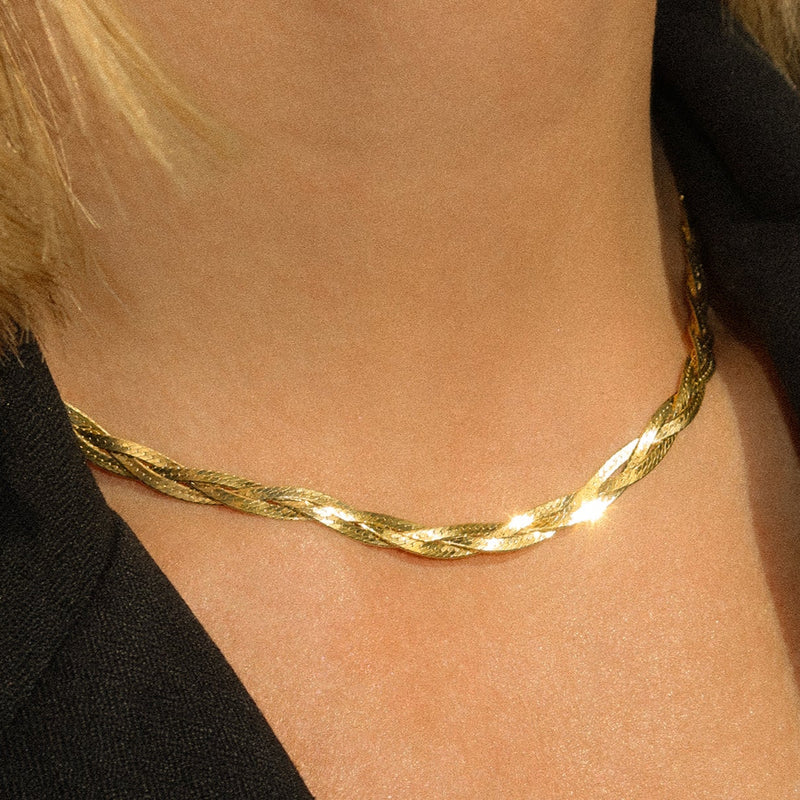 This intricately woven braided gold chain sits flush against your skin and knows how to catch the light just right with three times the shine of our Herringbone Mother Necklace.