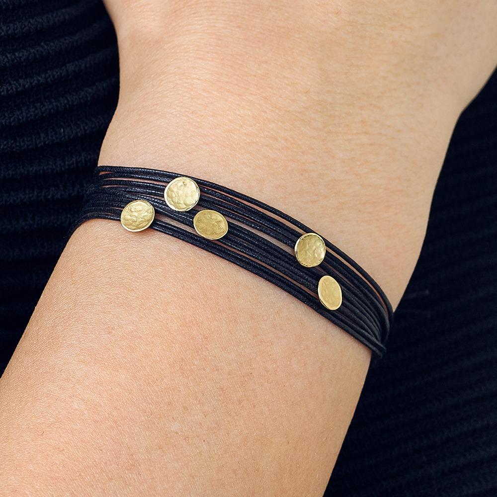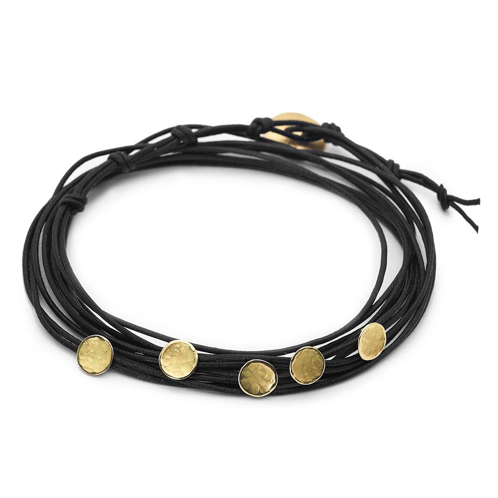 Long linen cord "Hammered Disc" with 5 x 5.60mm gold round organic concave hammered discs and gold button clasp.