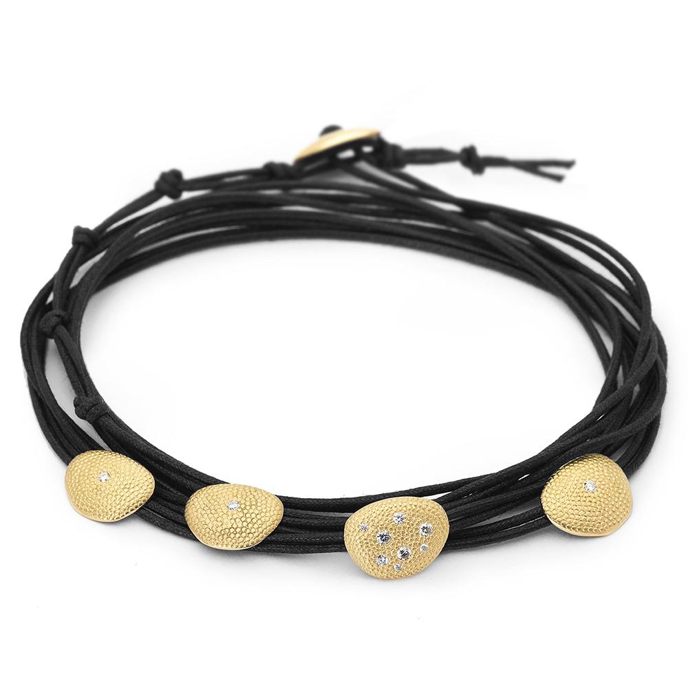 Long linen cord "Petal" bracelet with 4 x gold convex organic petal (~10x7.90mm) with stardust texture, 3 set with 0.01ct round brilliant cut diamonds, 1 set with multiple varying size diamonds and gold polished button clasp.