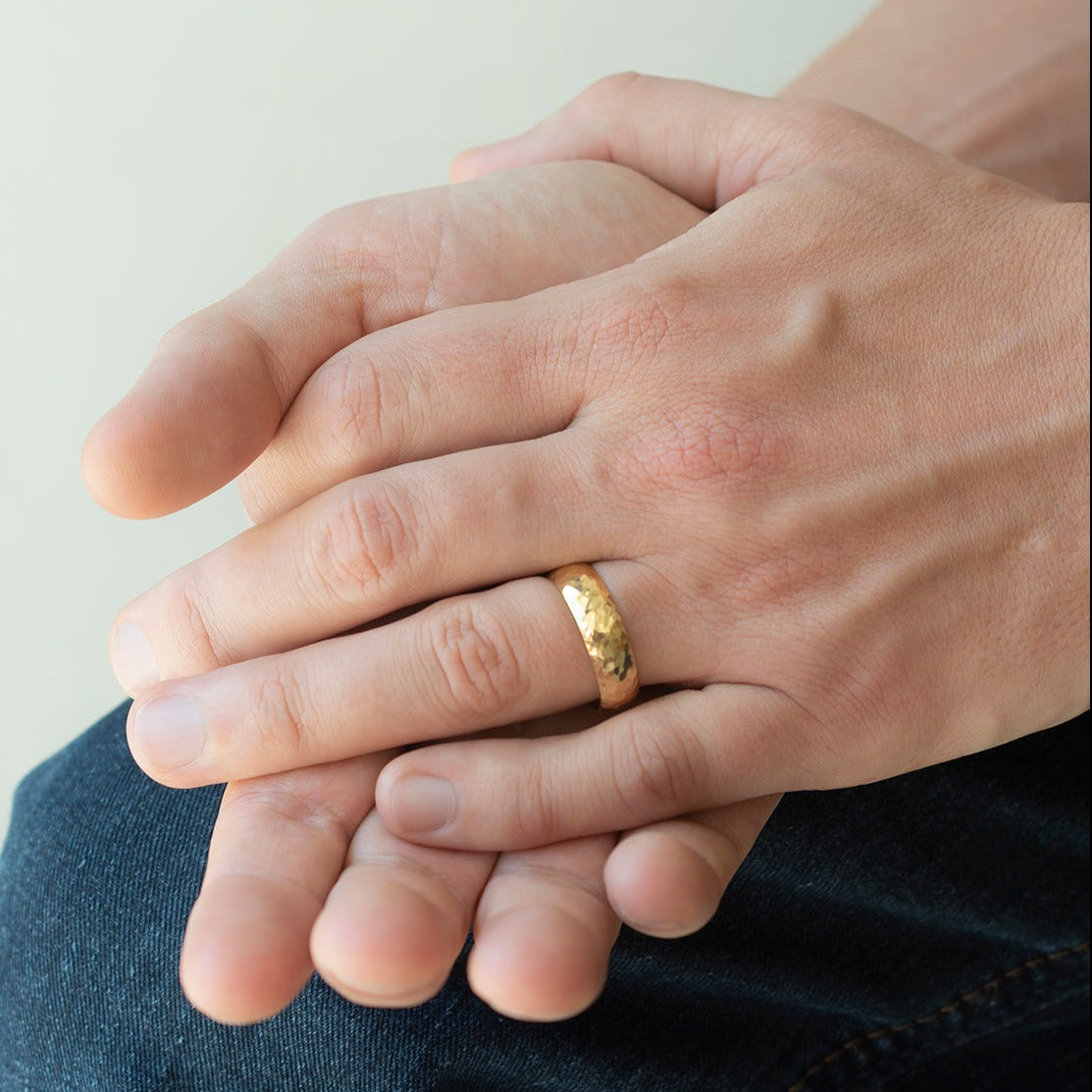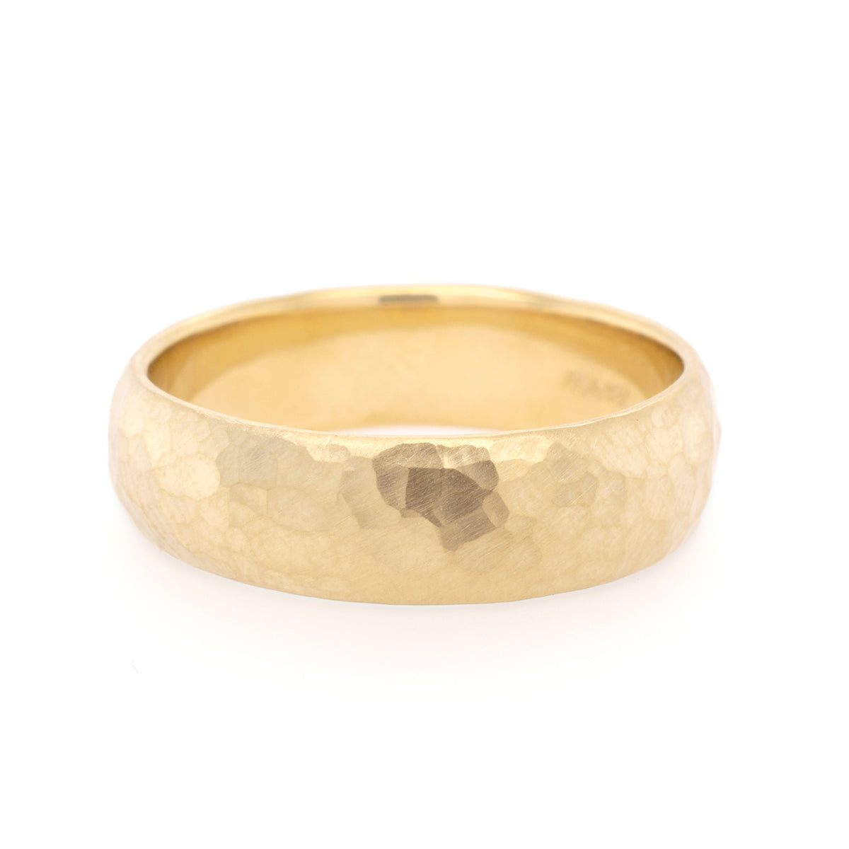 Gold hammered texture, comfort fit band, ~6mm wide.