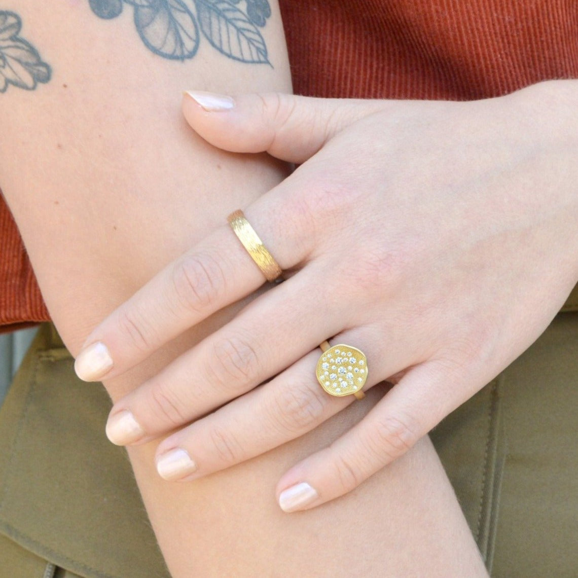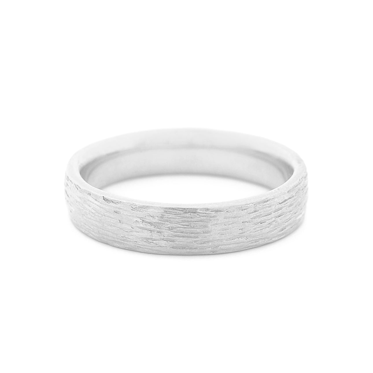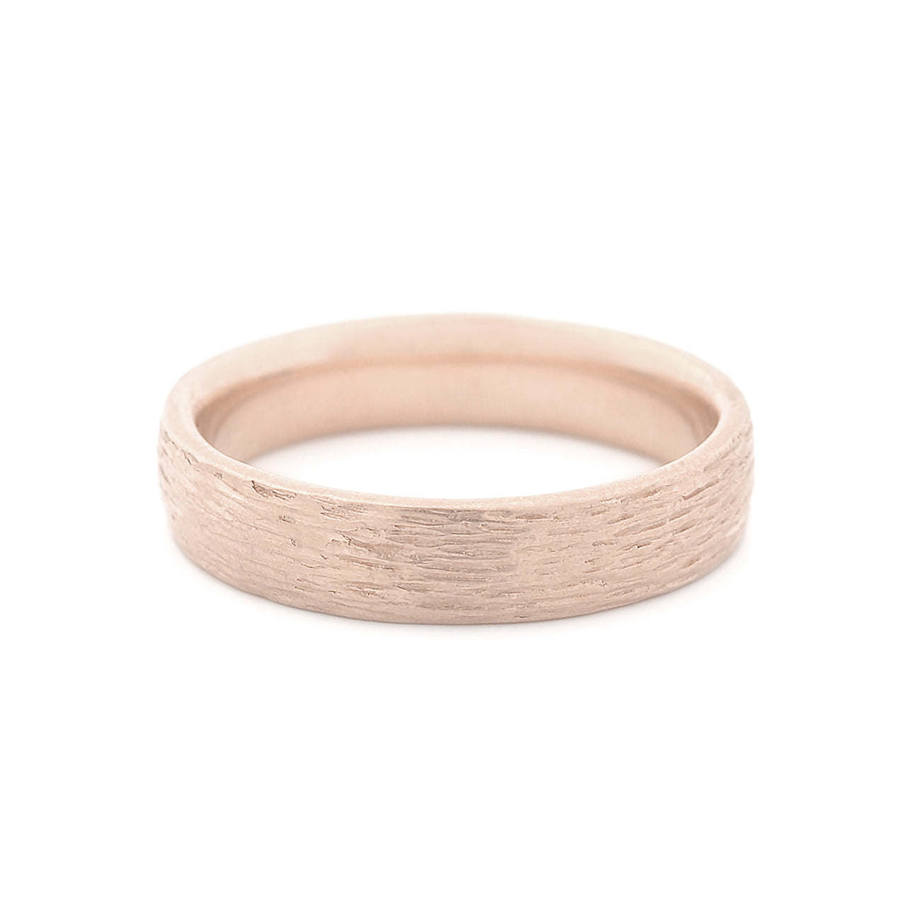 Speak to your love of nature with the bark texture finish gold band. Comfort fit ~5mm wide.