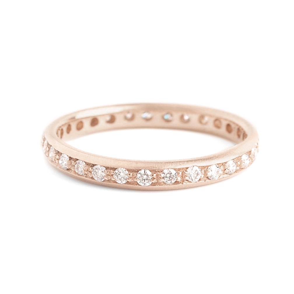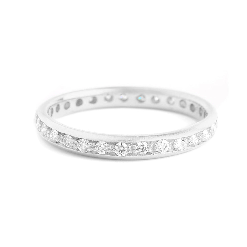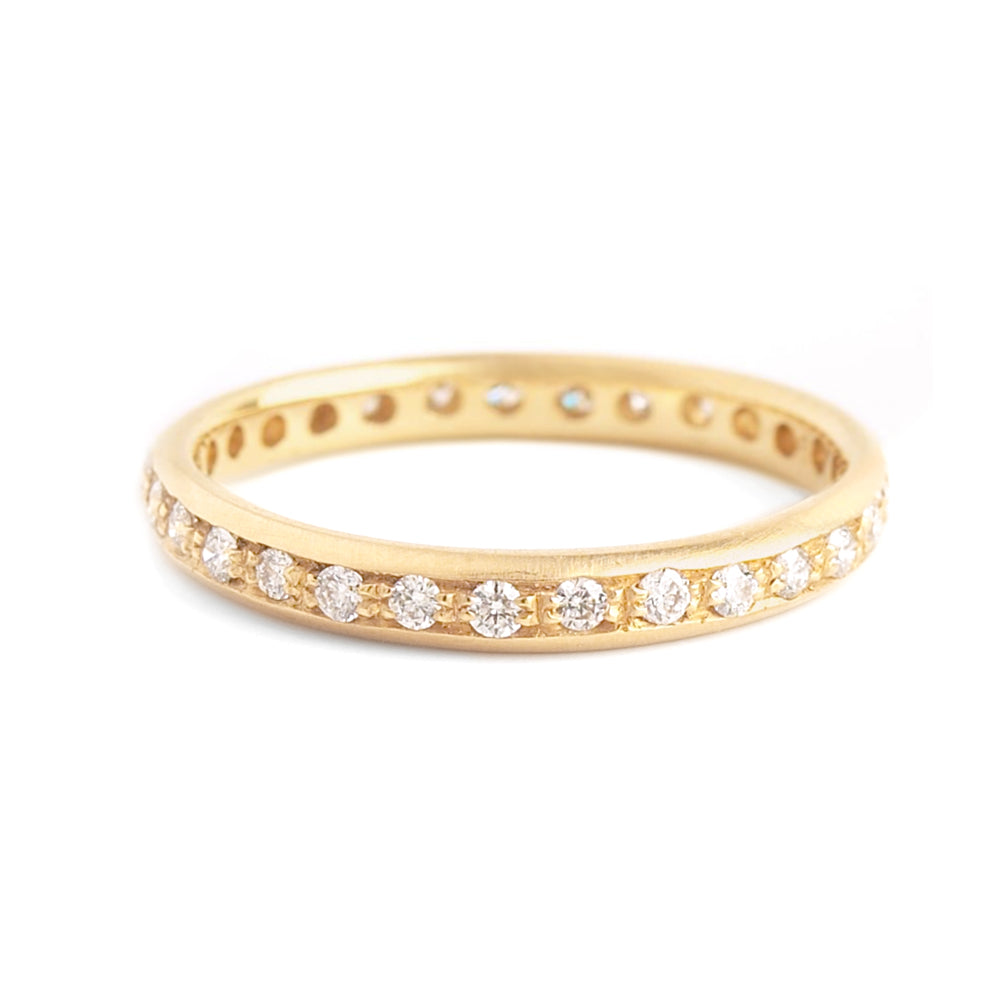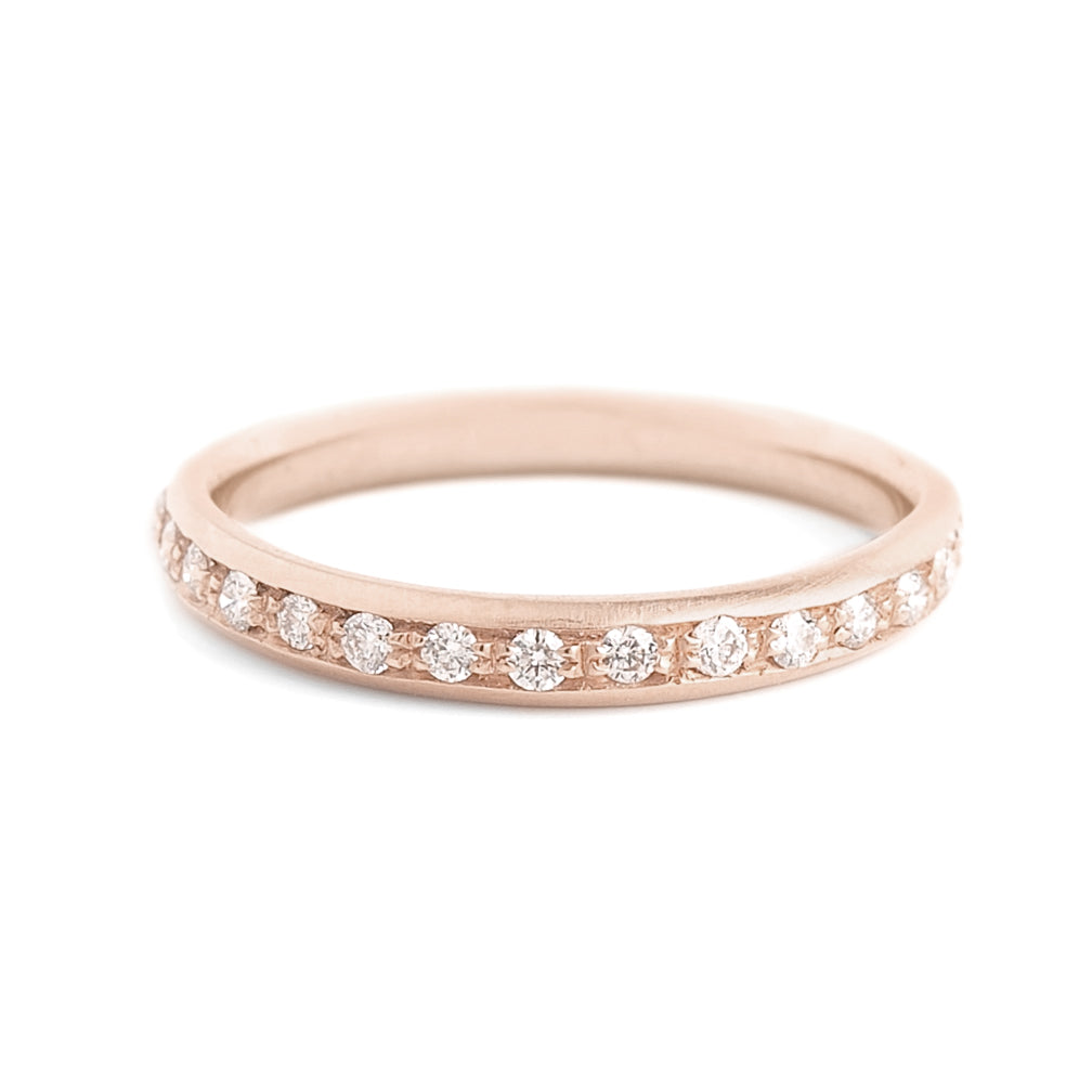 Gold band, 2.5mm wide, half set or full set with 0.01ct round brilliant diamonds in a single row.