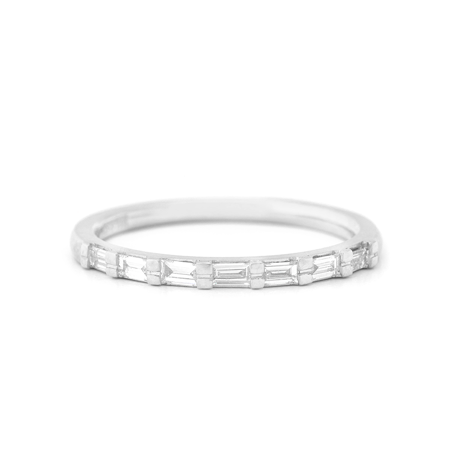 Gold ring claw set with 7 x ~2.7x1.4mm white baguette diamonds, ~0.21 total carat weight, band ~1.85mm wide.