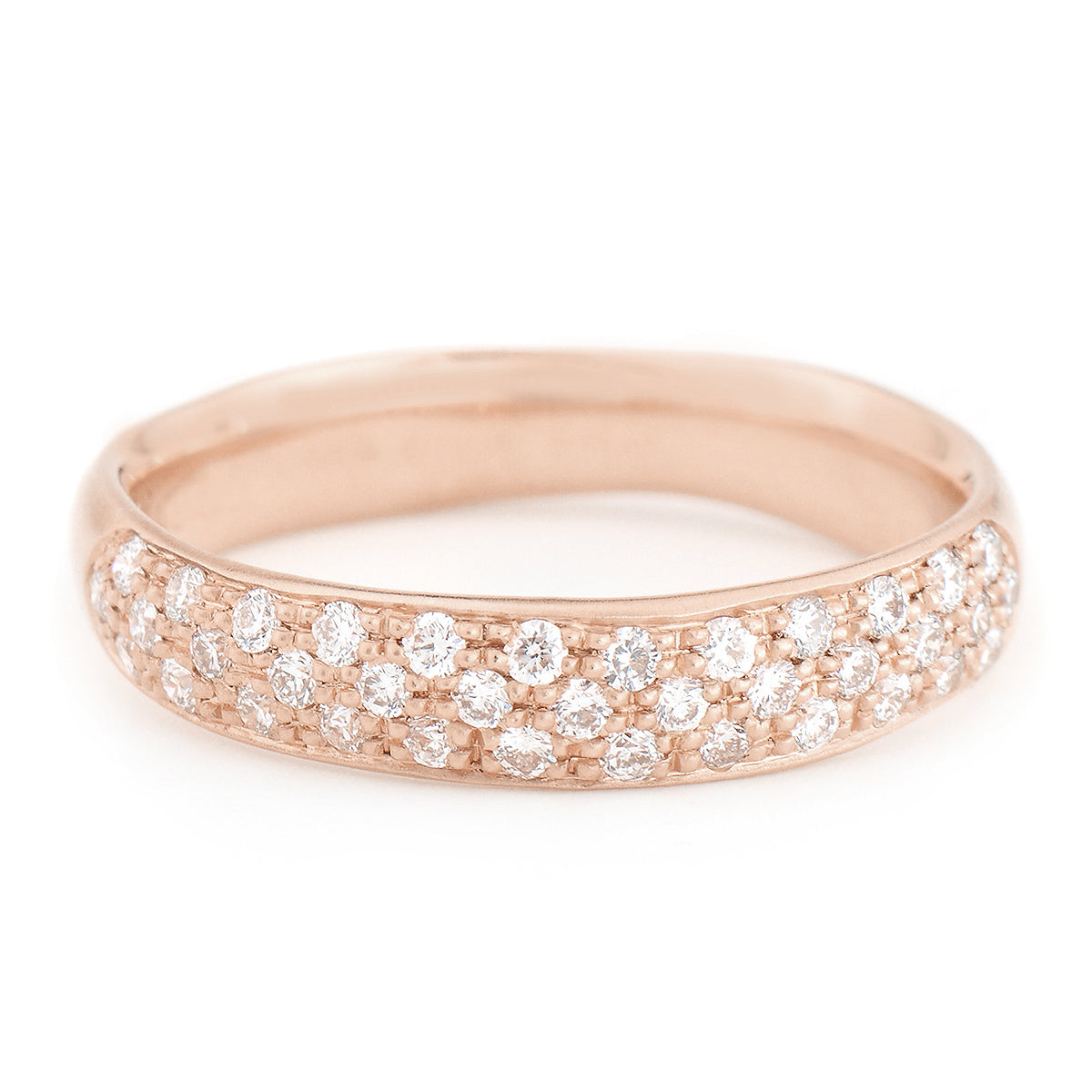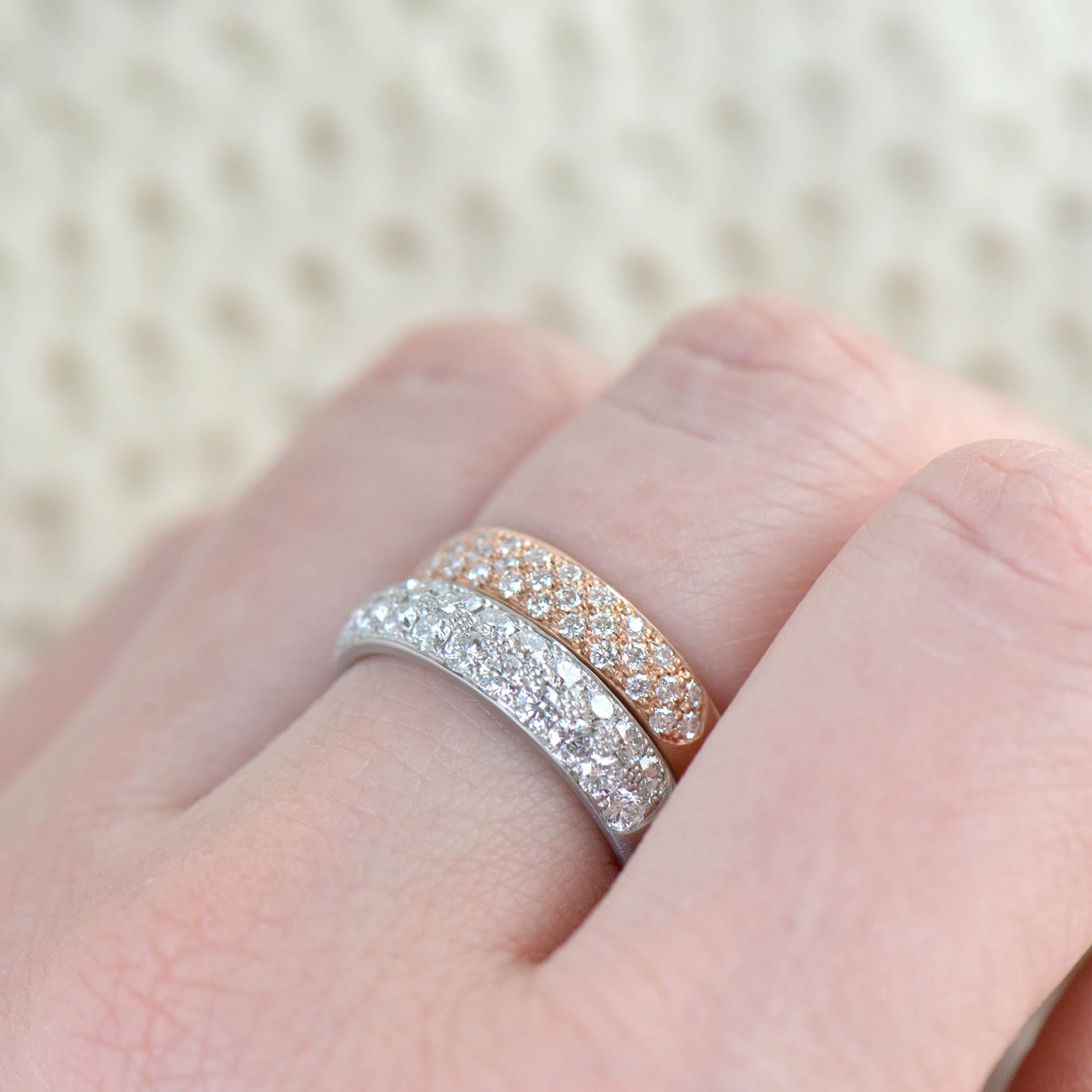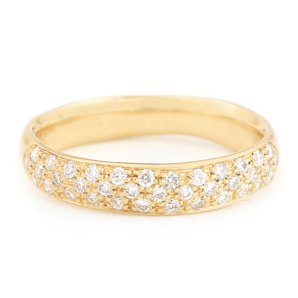 Gold band pave set half way around, or full way around with 3 rows of round brilliant cut G/VS diamonds.