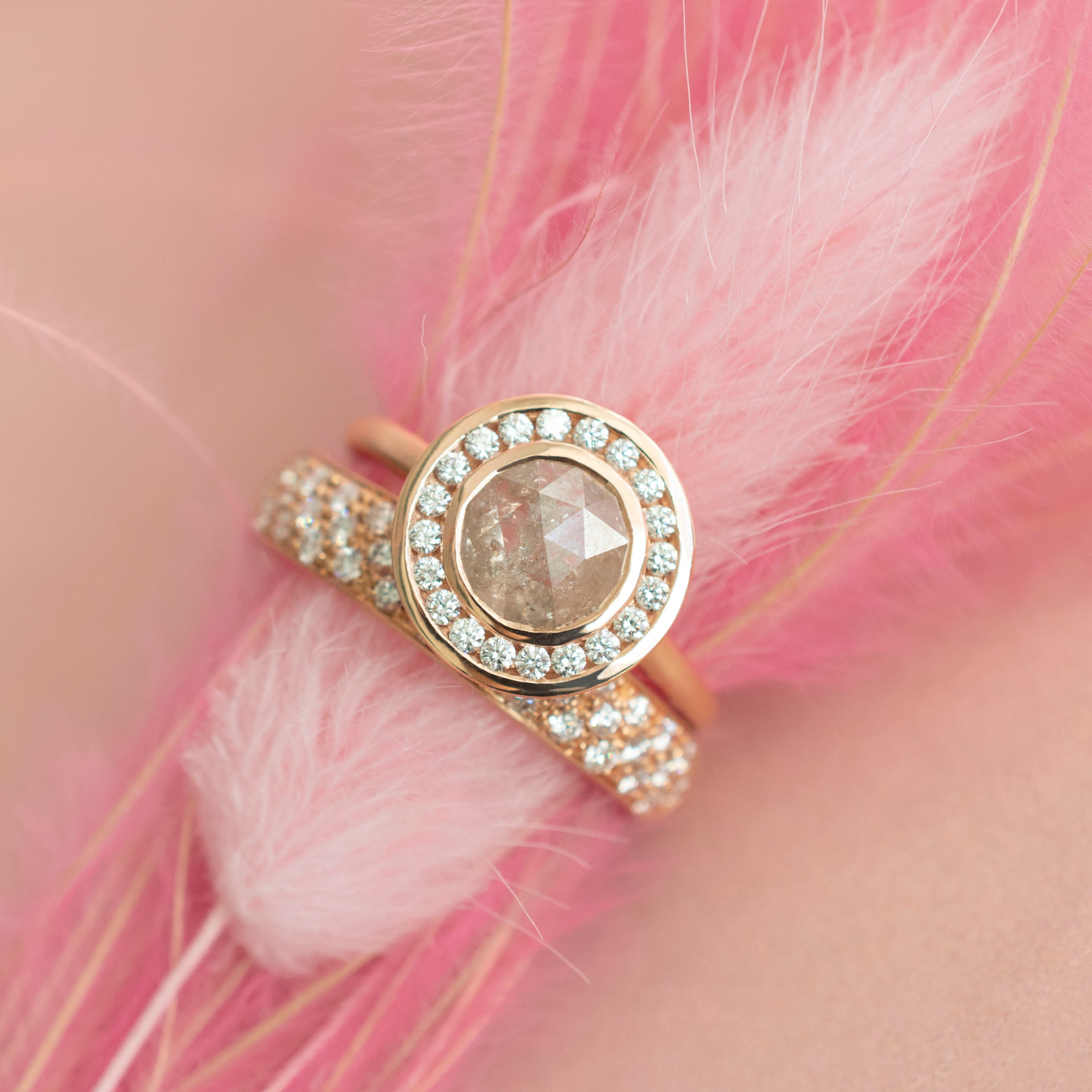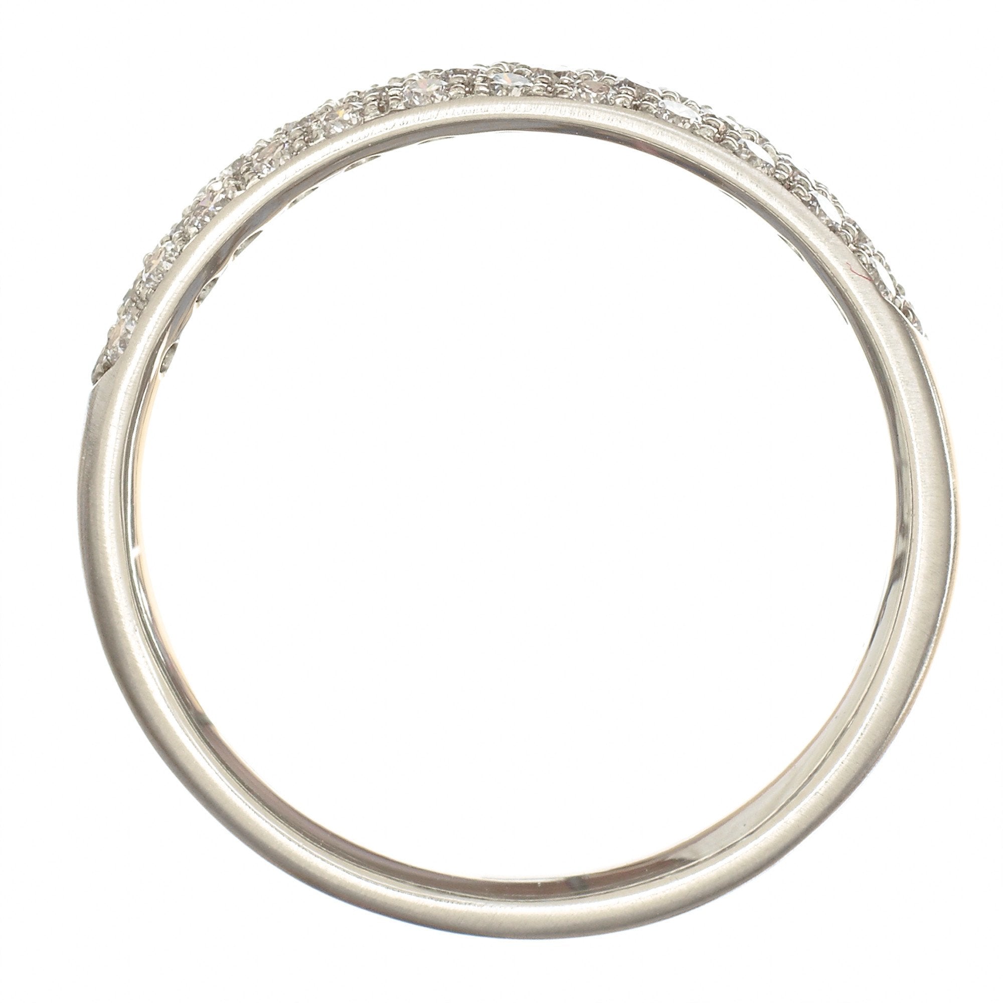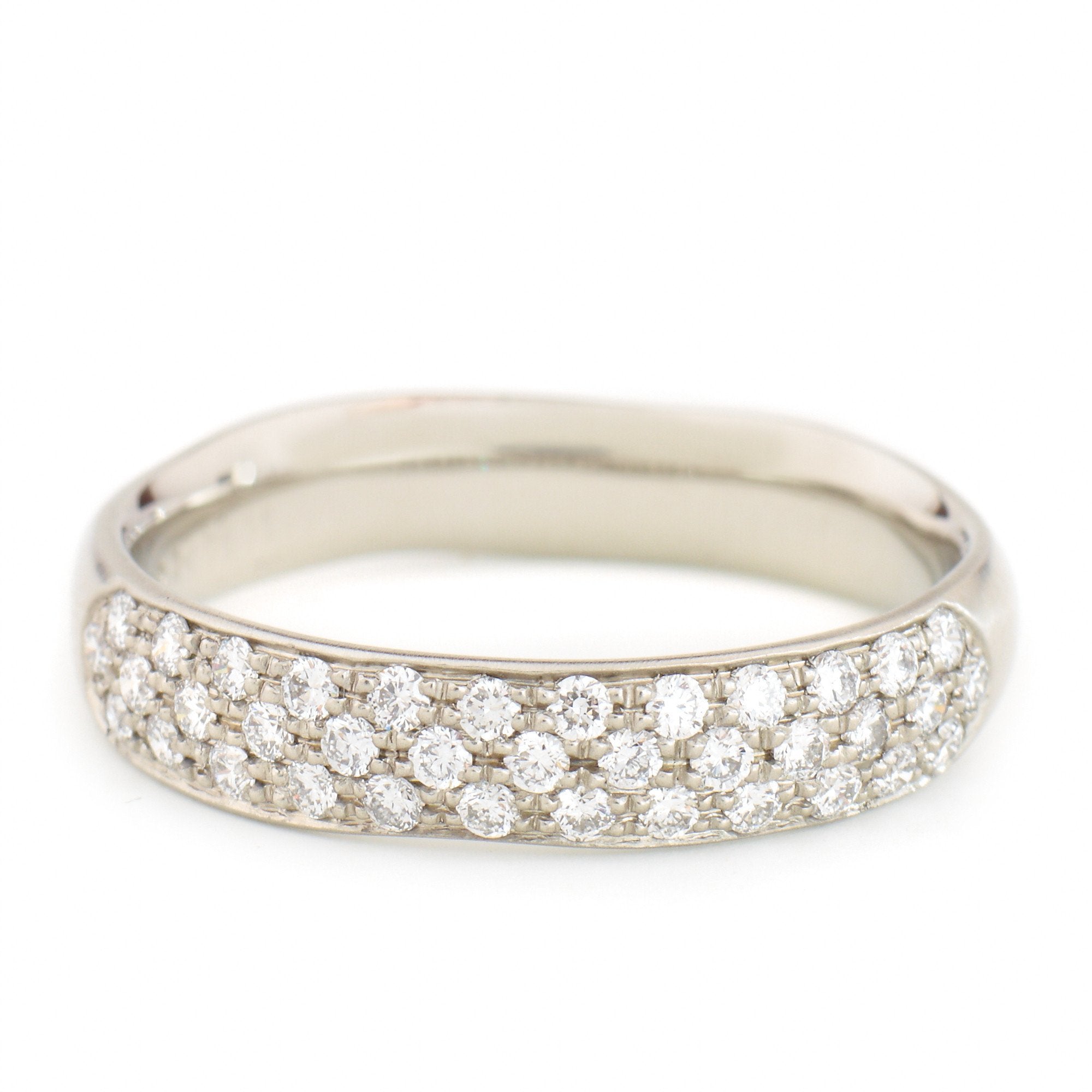 Gold band pave set half way around, or full way around with 3 rows of round brilliant cut G/VS diamonds.