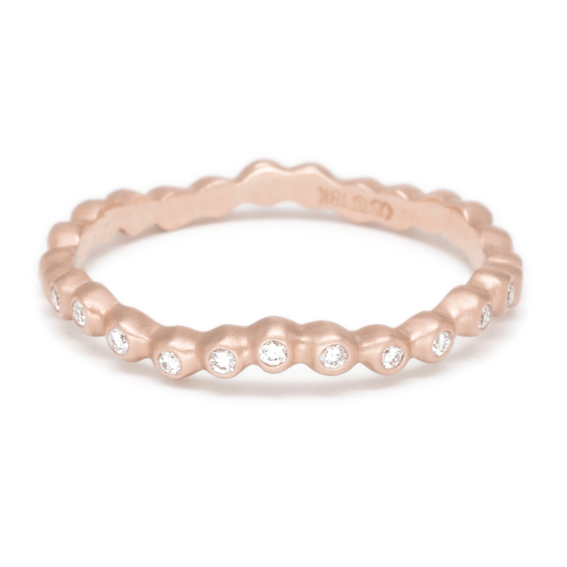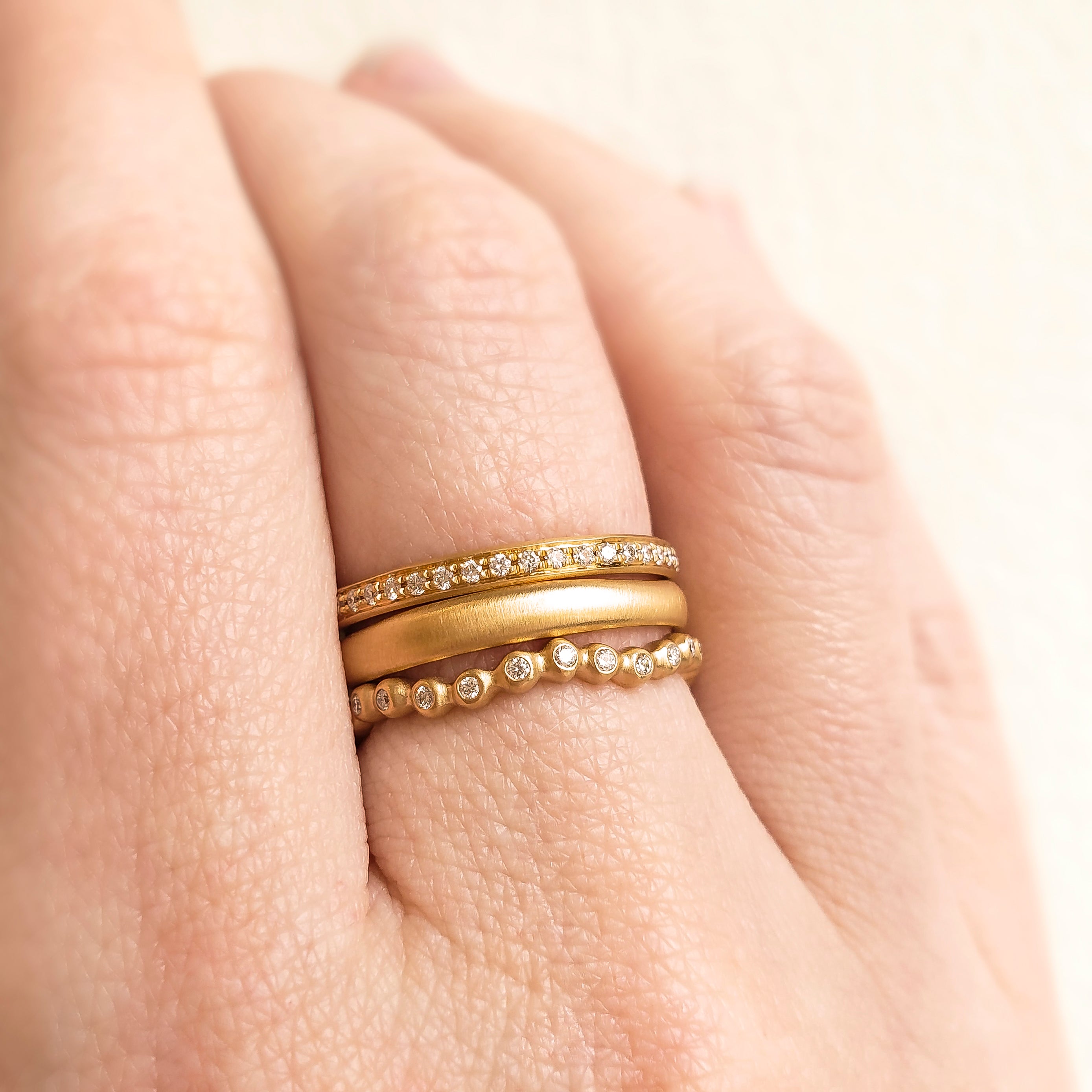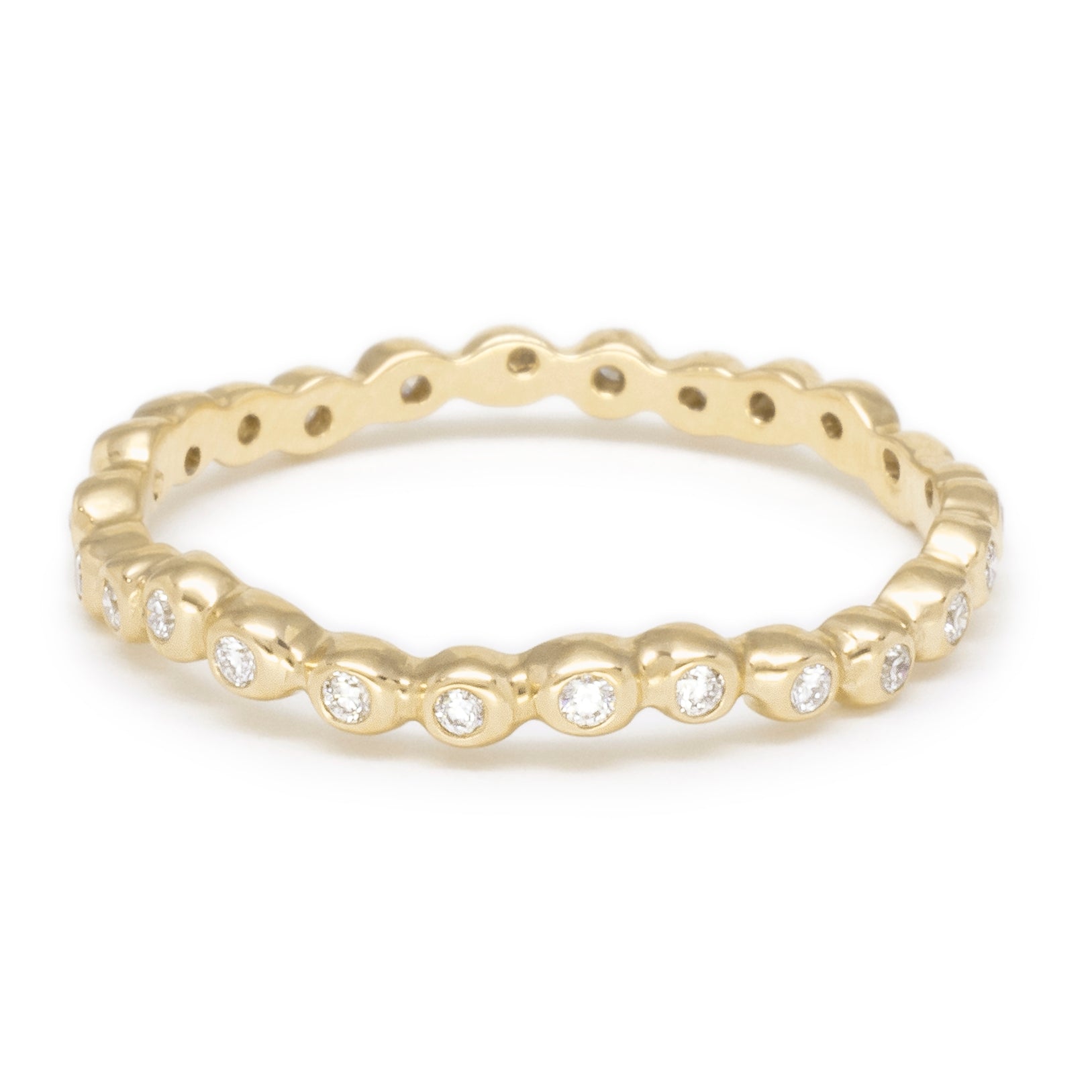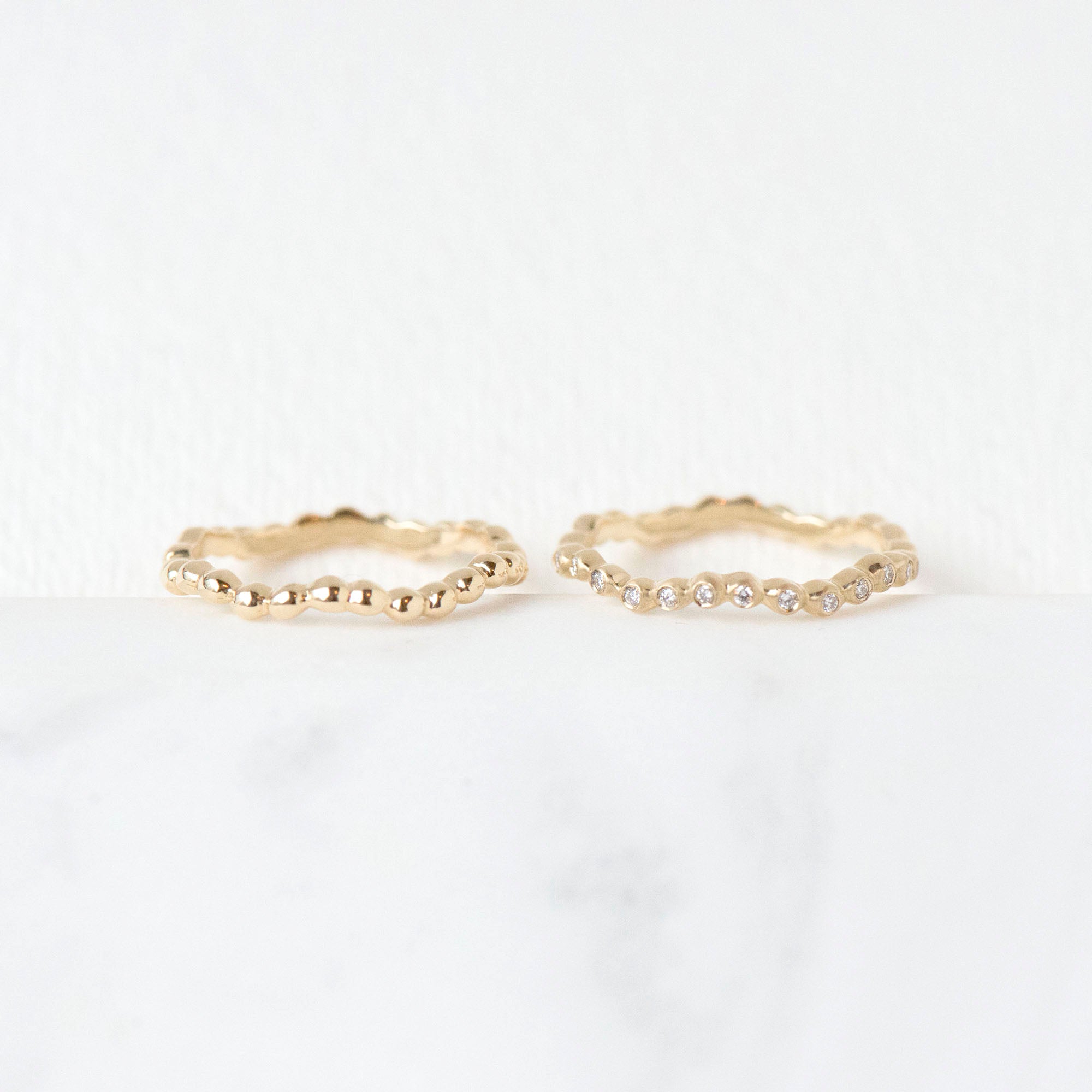 Gold wave seed band ring with round brilliant cut G-VS diamonds (0.006ct) either half way around or full way around. ~2mm wide band.