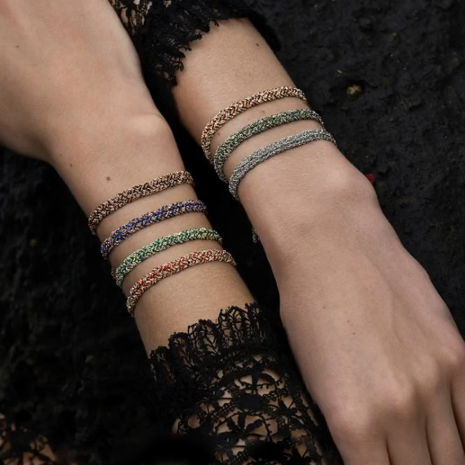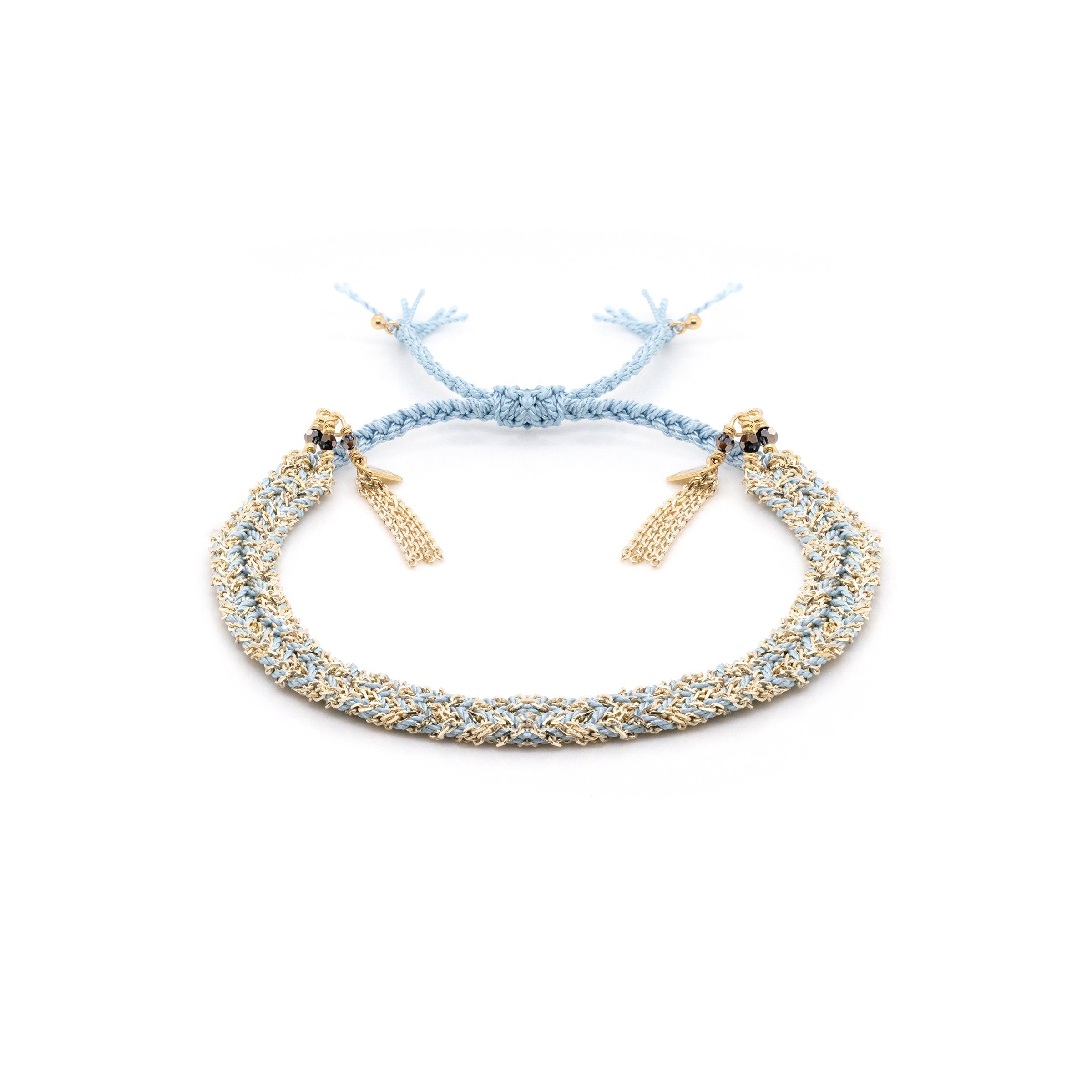 Hand-braided chain & aqua silk sliding knot bracelet finished on each end with crystal beads and chain fringe. Fits most wrists with the sliding knot closure and silk thread.