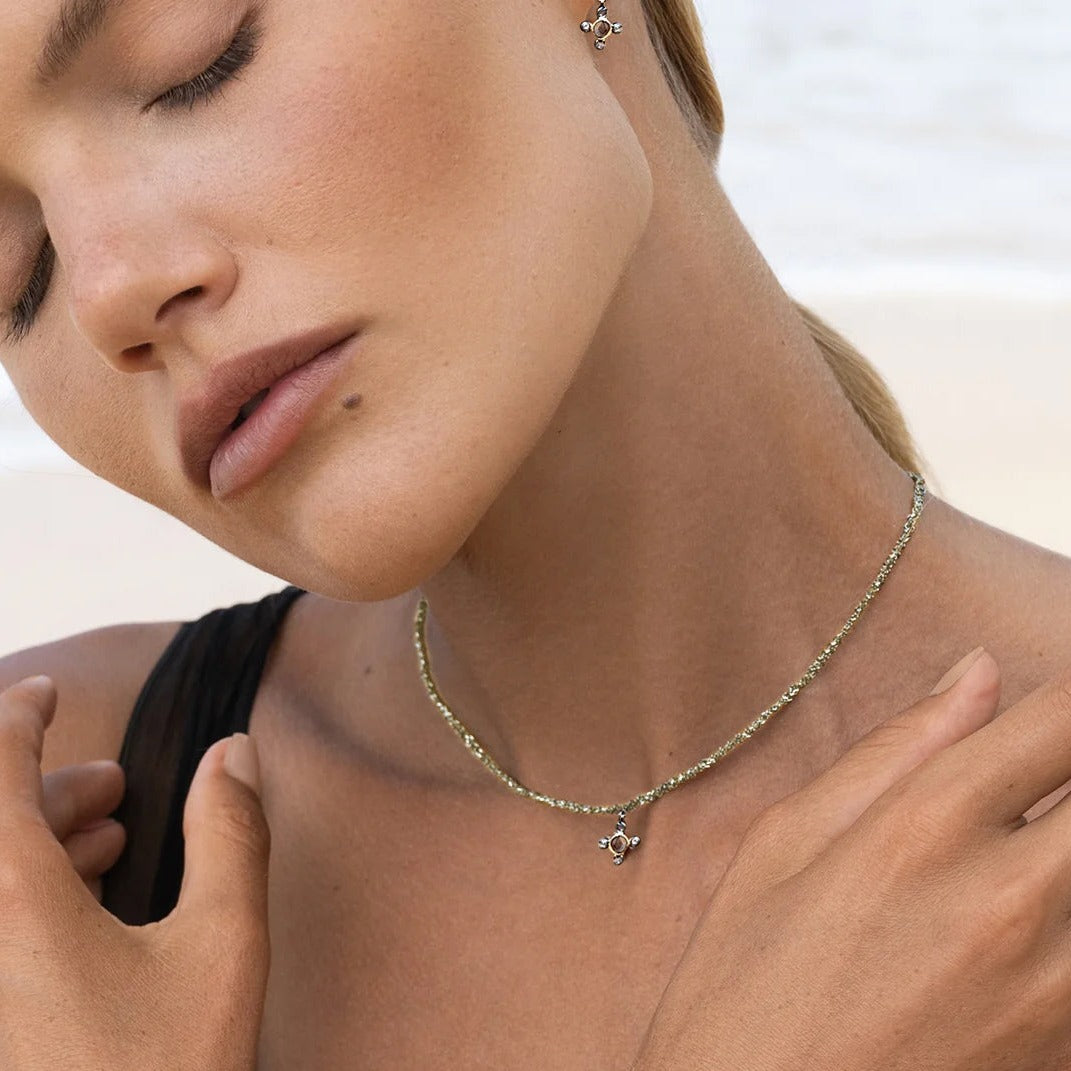 Braided 18k Gold dipped sterling silver woven fine chain, adorned with a 5 bezel set rose cut diamond charm.