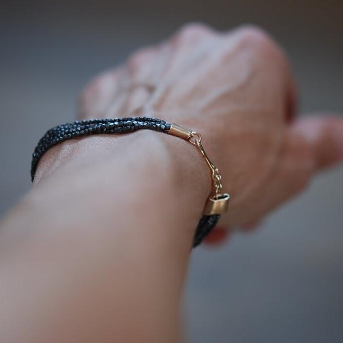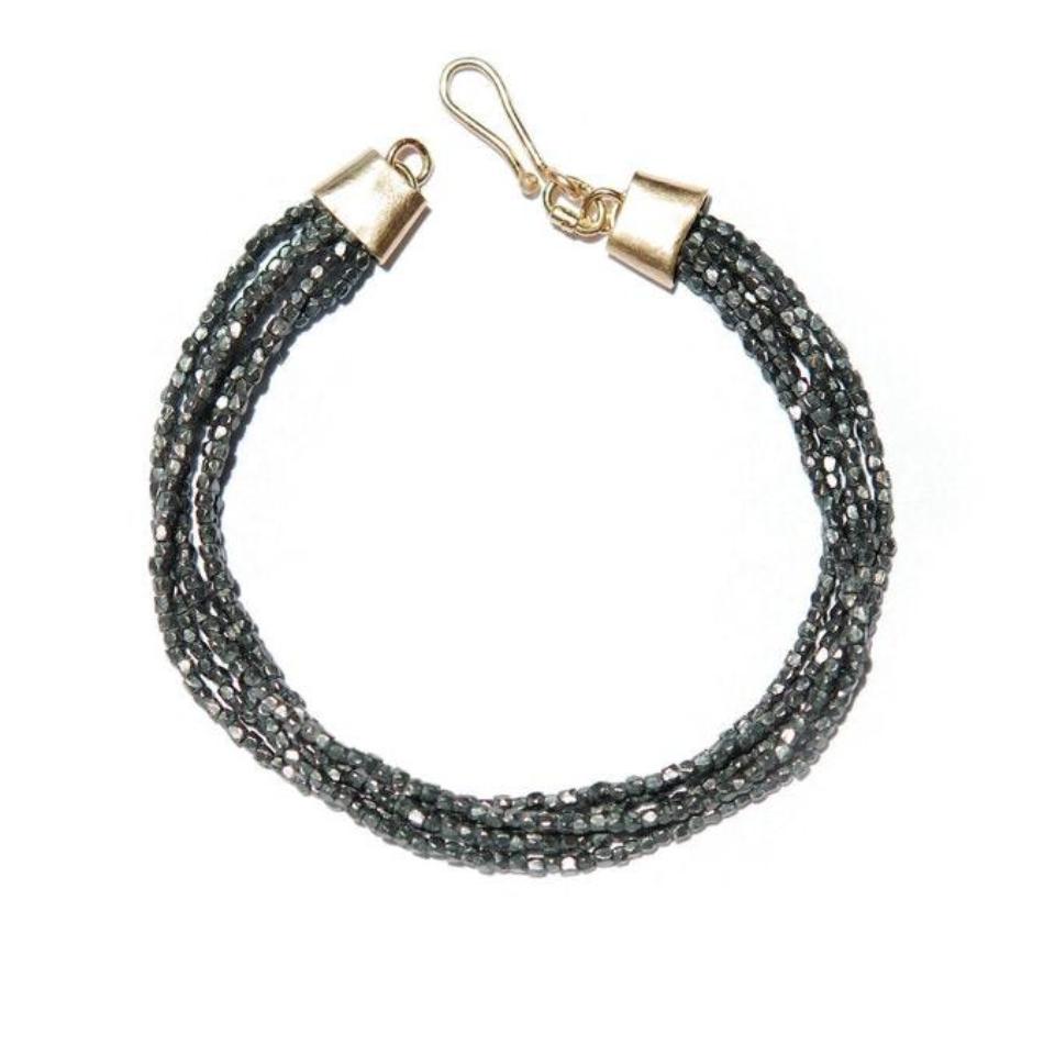 Five strands of oxidized silver Hill Tribe beads contrast with 14k gold elements and clasp. Earthy and refined, this is a bracelet for every day, for casual or dressed up.