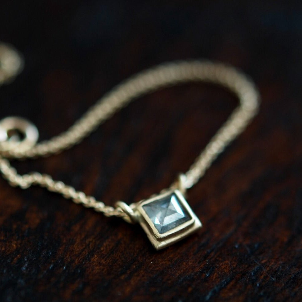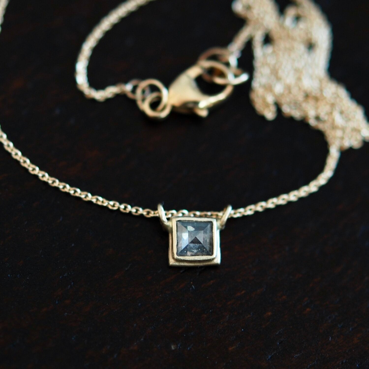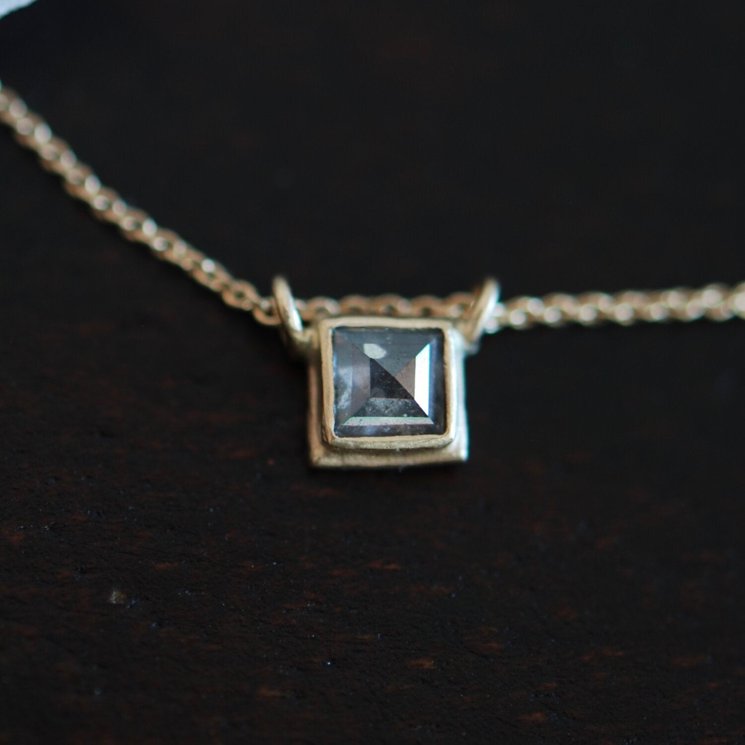 A square, rose cut salt-and-pepper diamond charm glides on a delicate gold cable chain. 14k yellow gold.