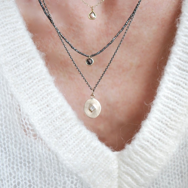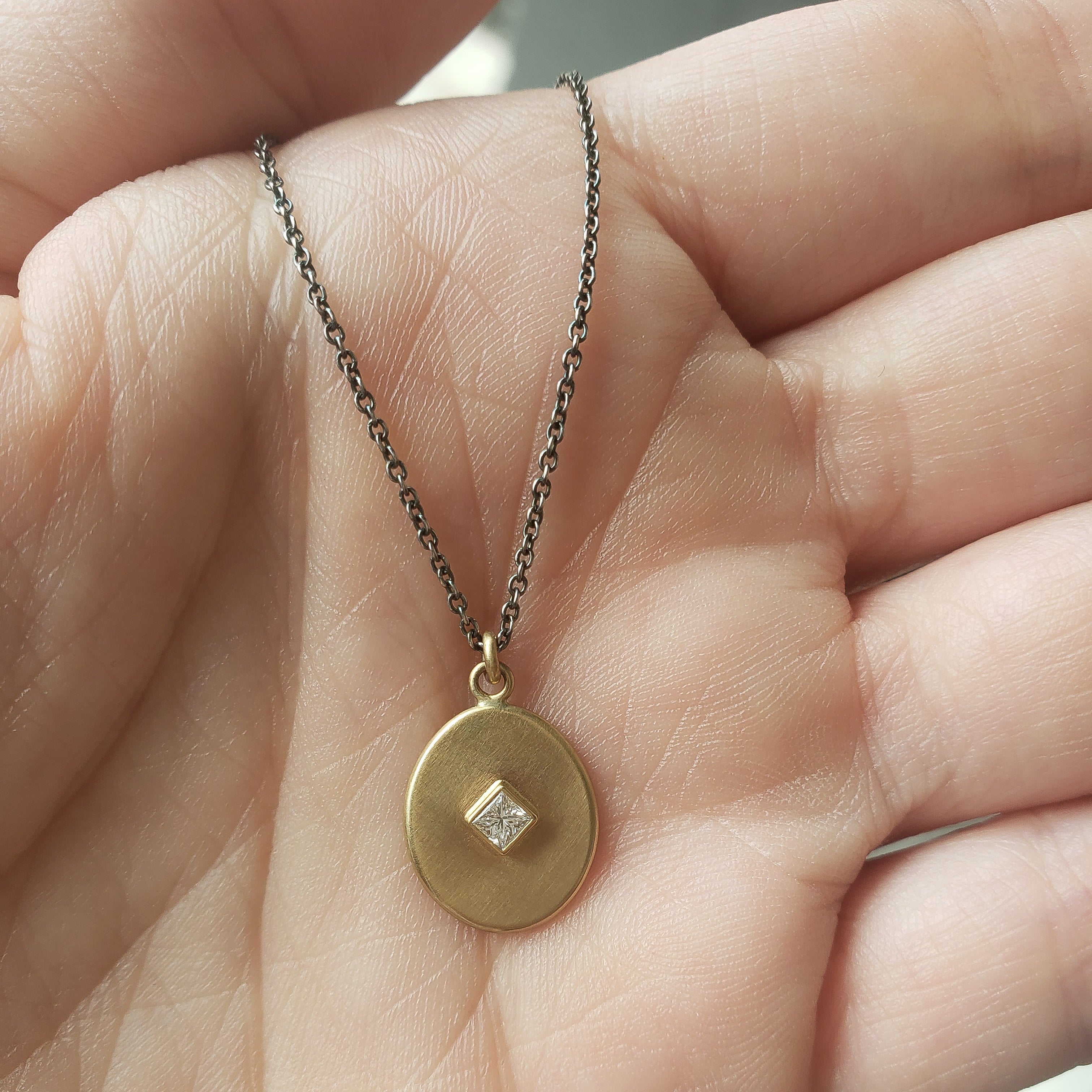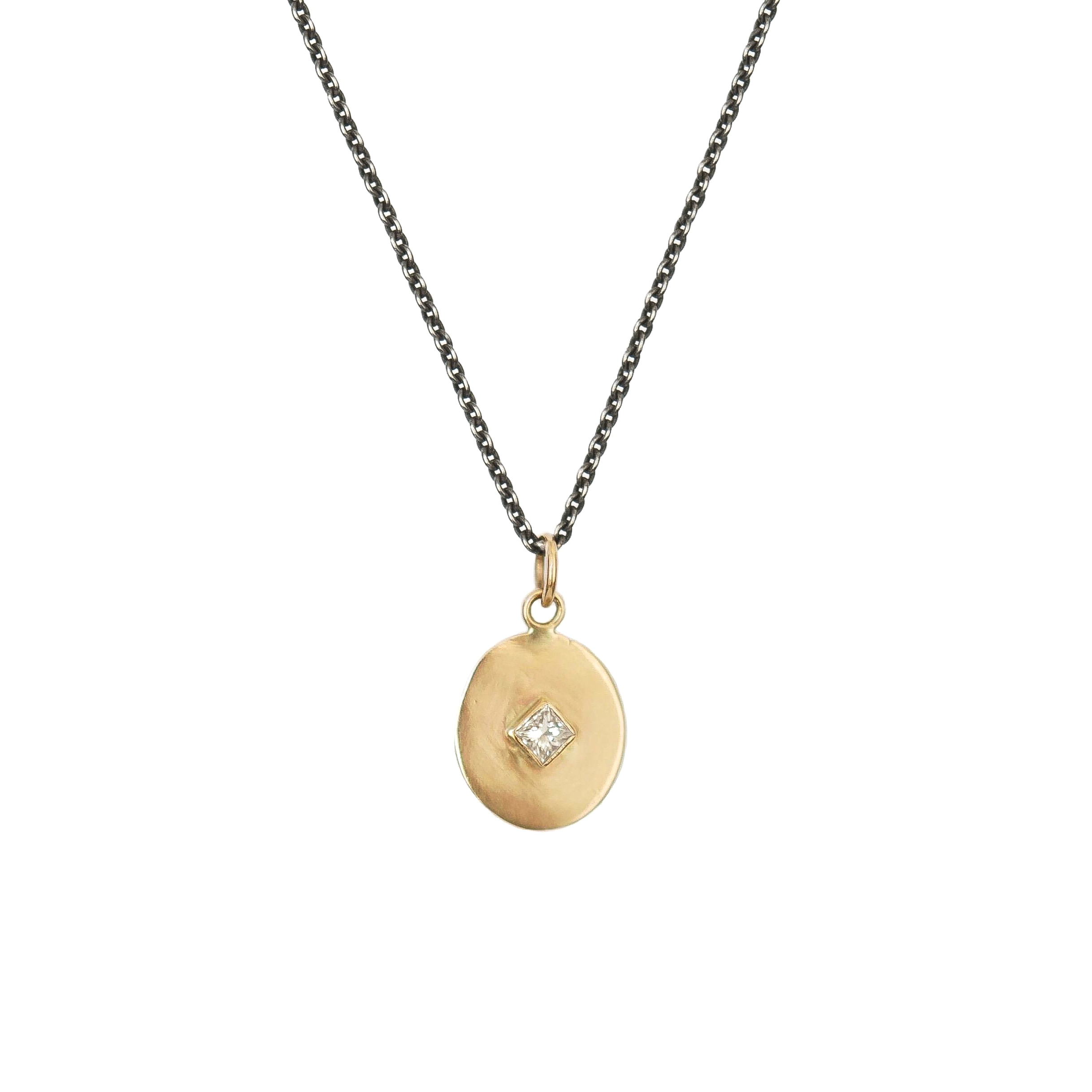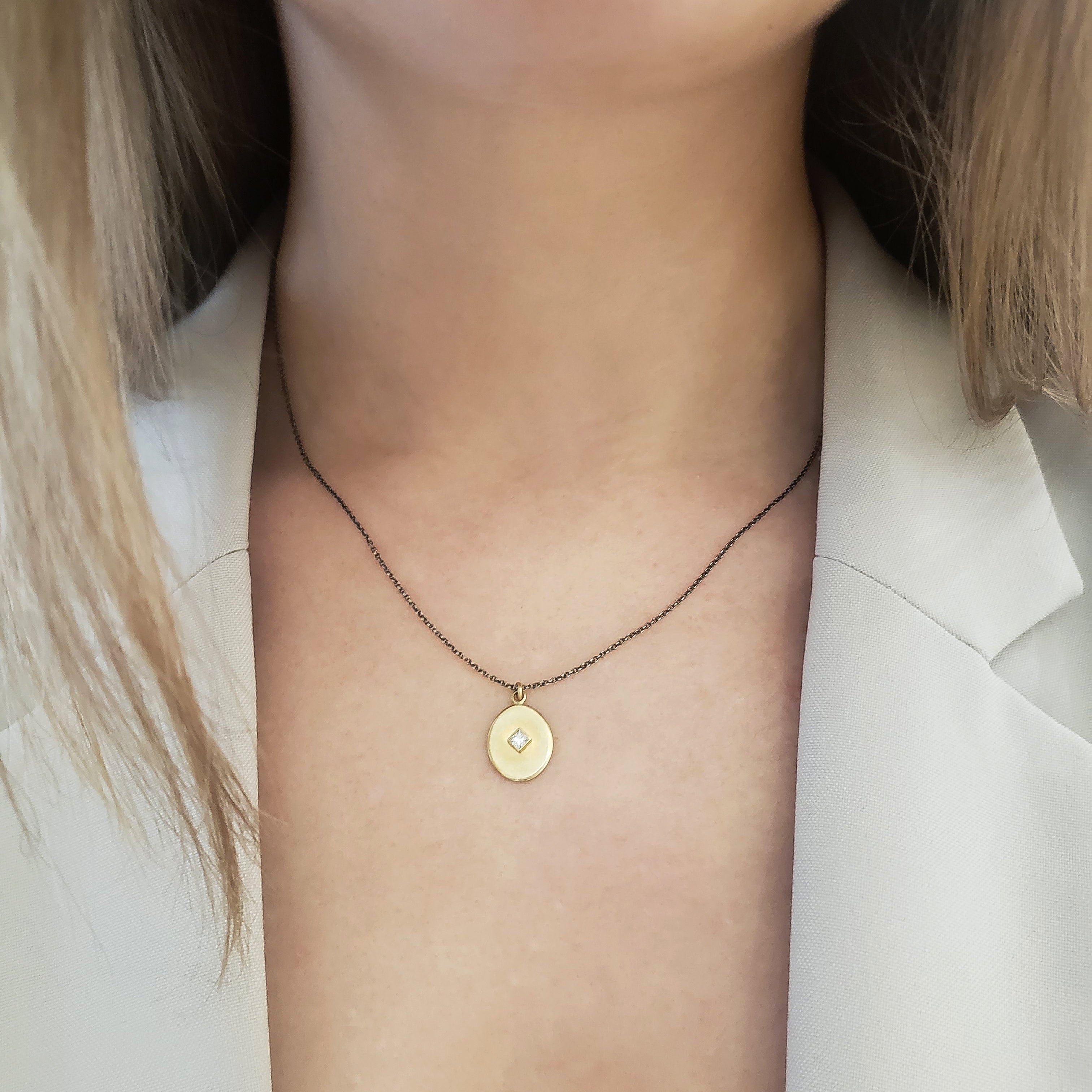 The oval pendant and square diamonds play off each other perfectly in this charming necklace.