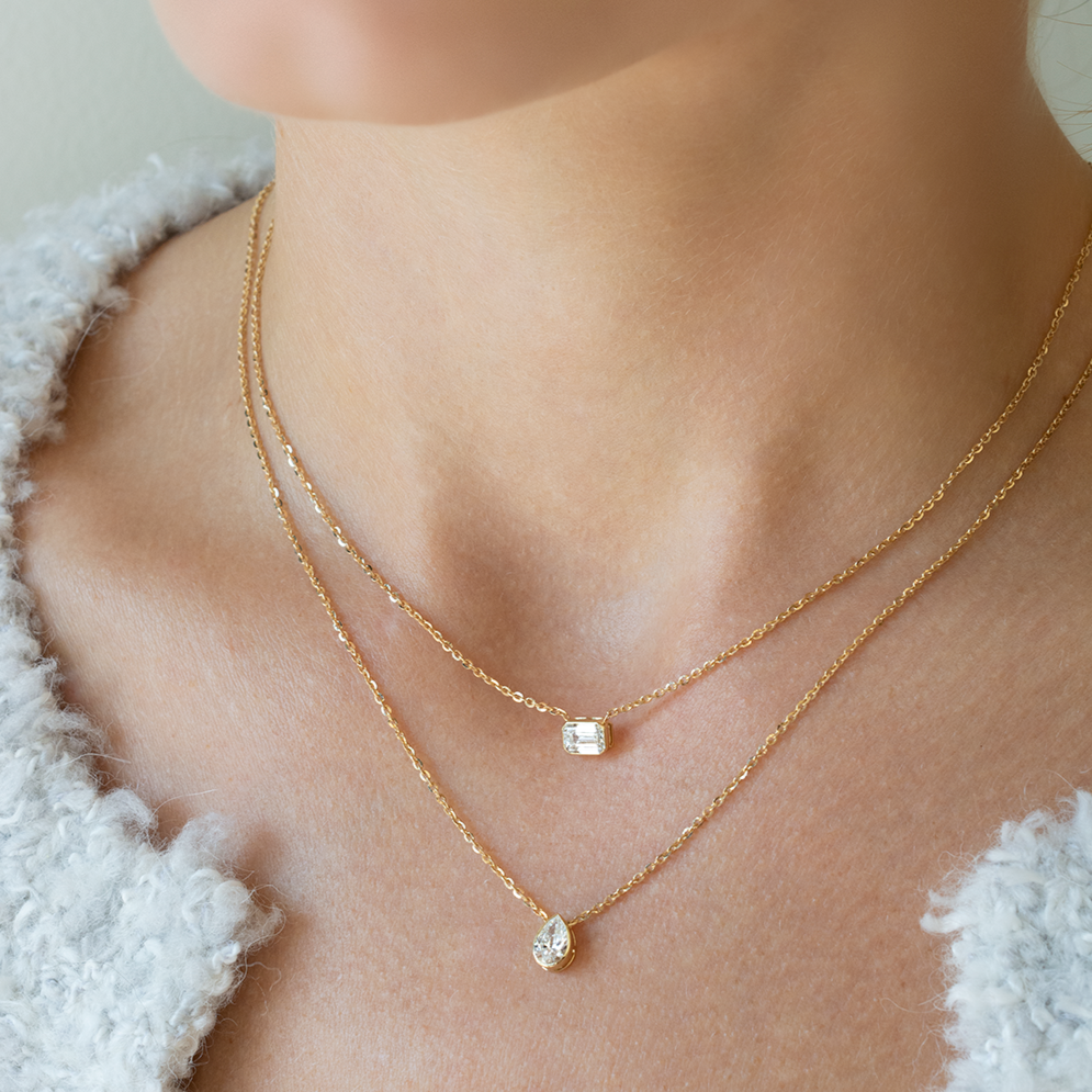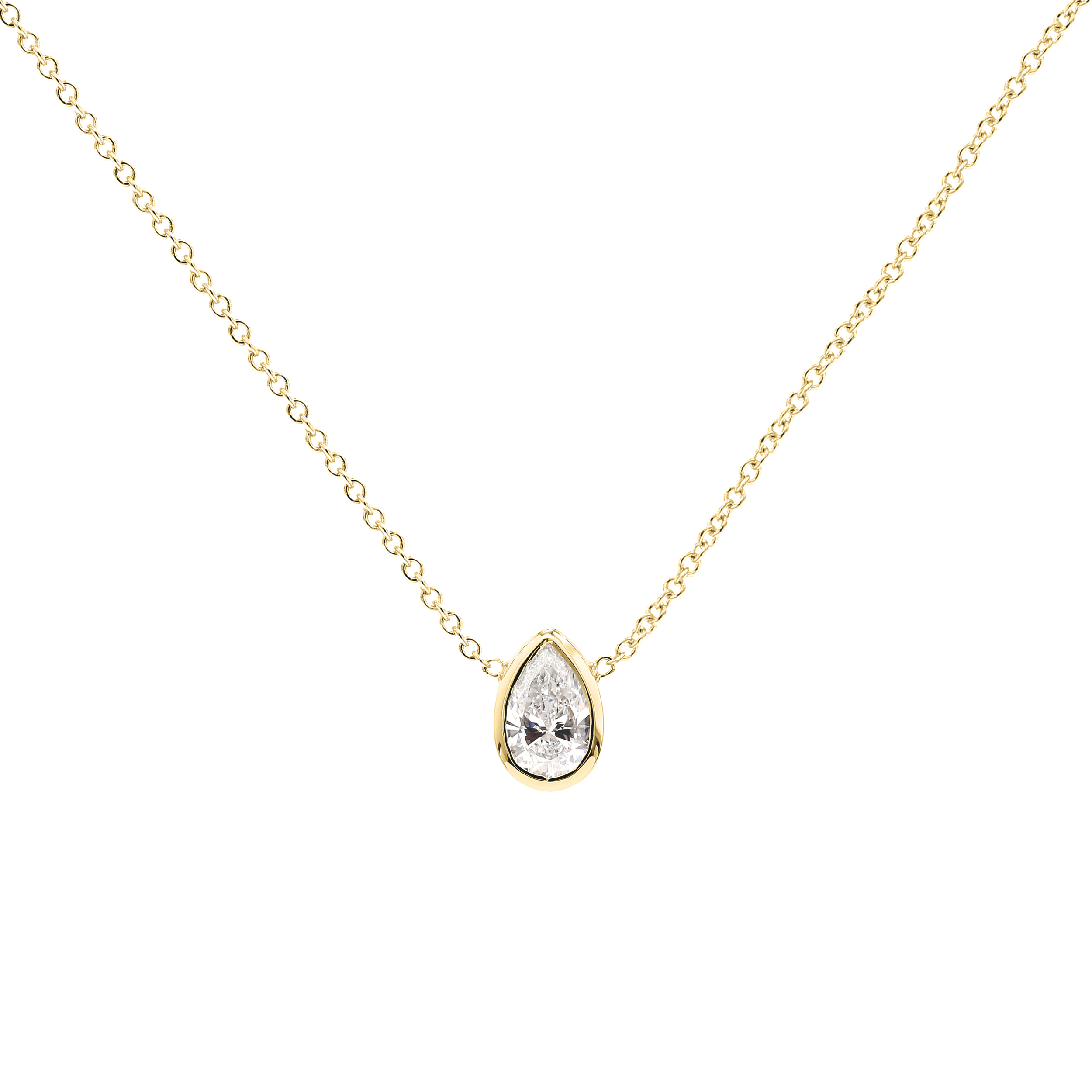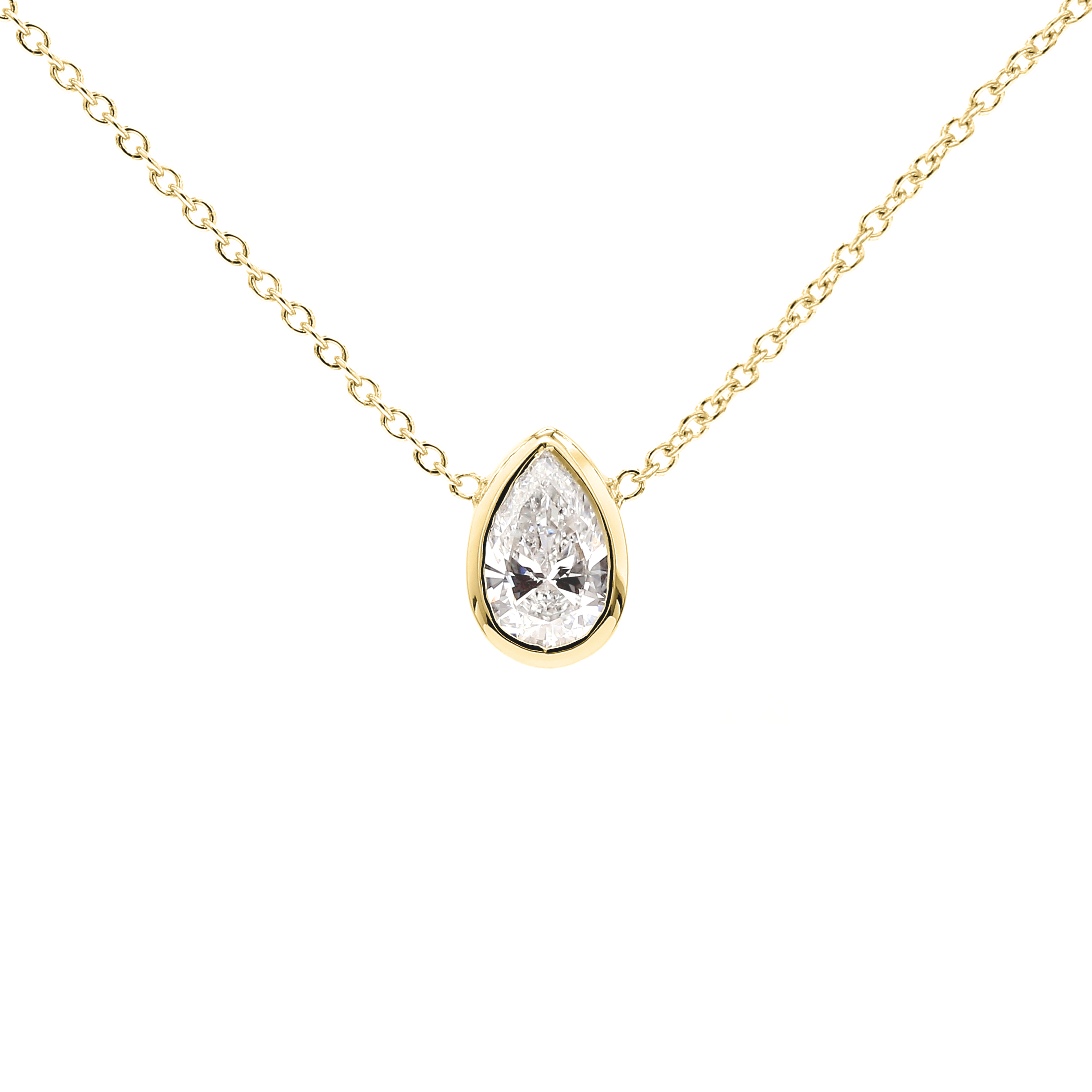 Timeless sophistication is this 0.50ct Bezel Set Pear Diamond Necklace. This luxurious necklace will become a treasured heirloom that you can pass down through generations.
