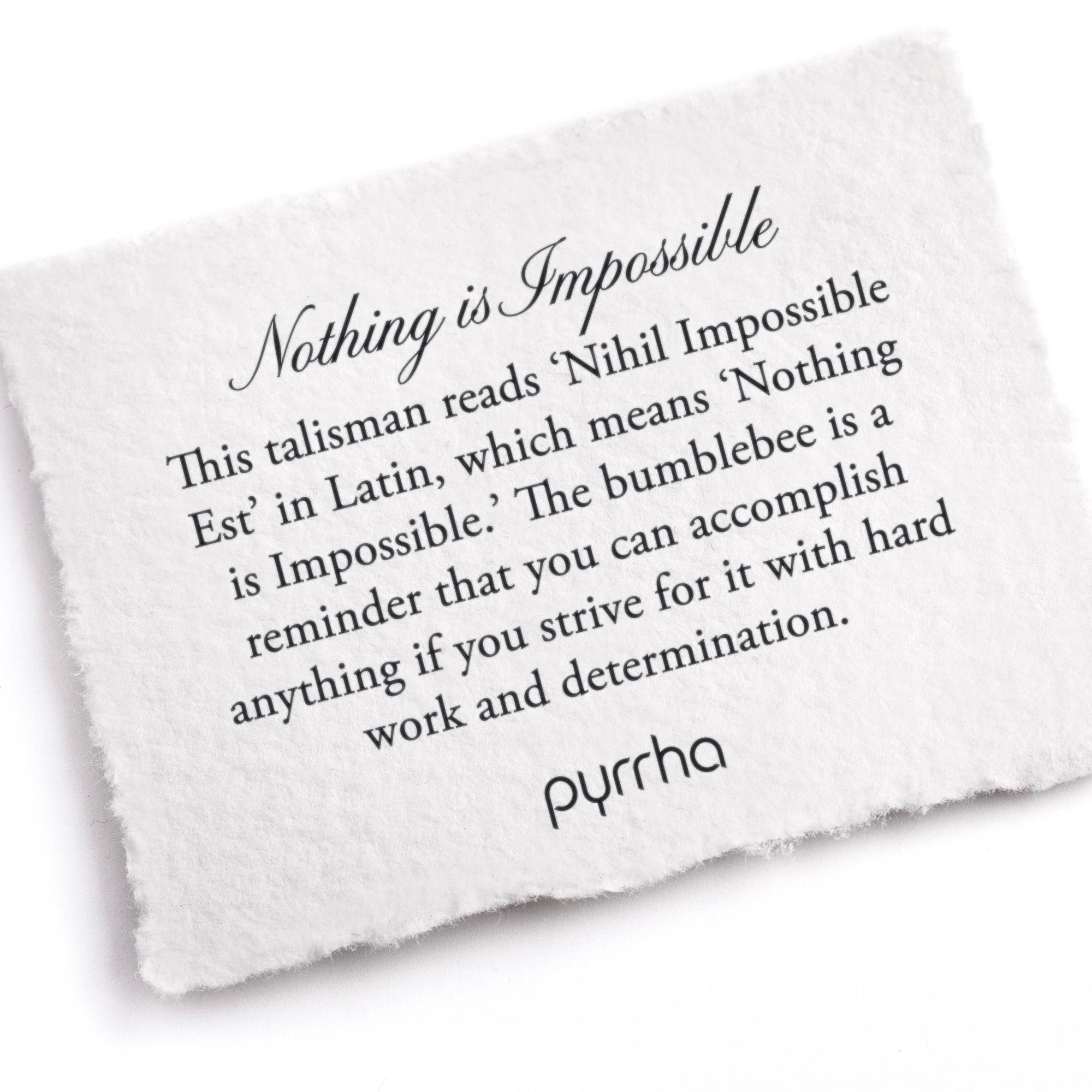 This talisman reads ‘Nihil Impossible Est’ in Latin, which means ‘Nothing is Impossible.’ The bumblebee is a reminder that you can accomplish anything if you strive for it with hard work and determination.