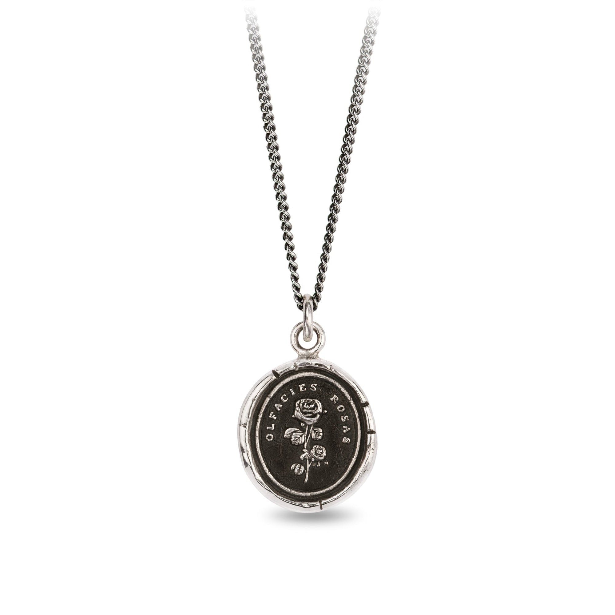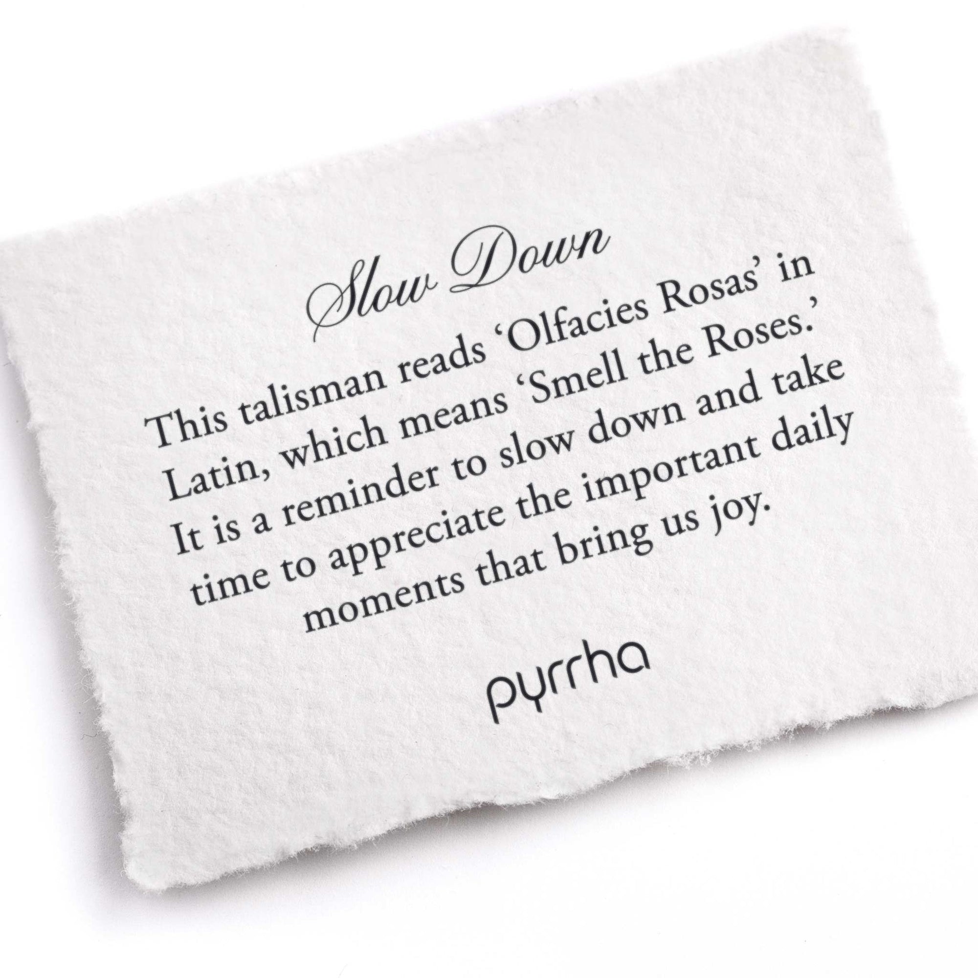 This talisman reads 'Olfacies Rosas' in Latin, which means 'Smell the Roses.' It is a reminder to slow down and take time to appreciate the important daily moments that bring us joy.