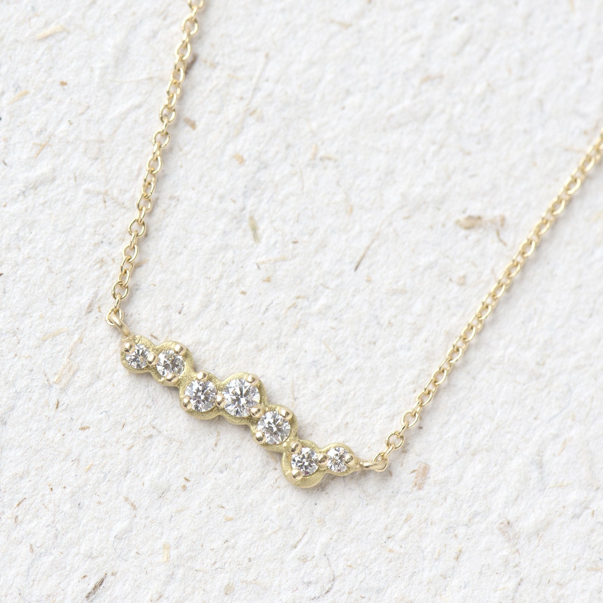 Gold 'Festival' fine cable chain necklace with pendant of varying sizes round brilliant cut diamonds in uneven pattern, ~0.18 total carat weight.