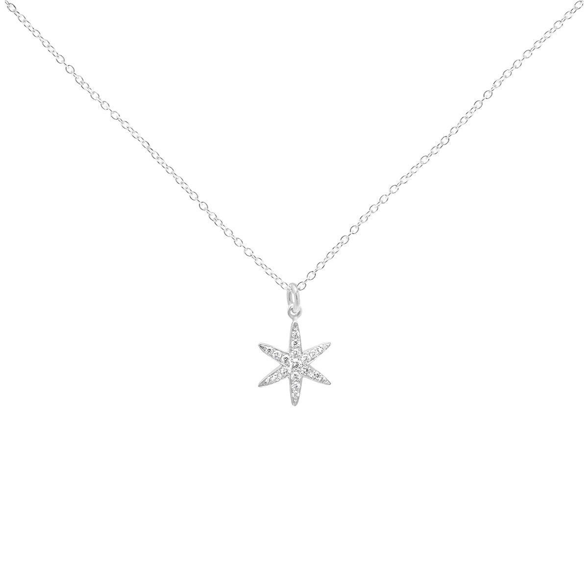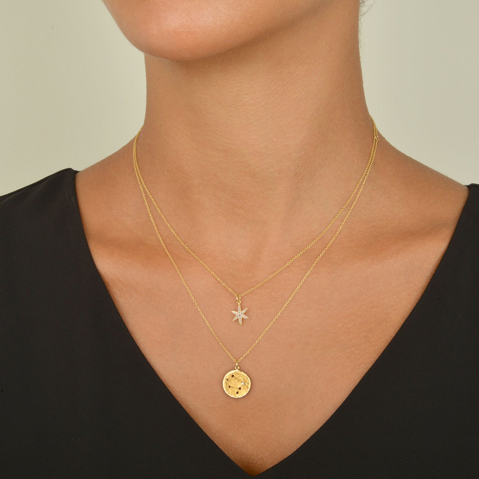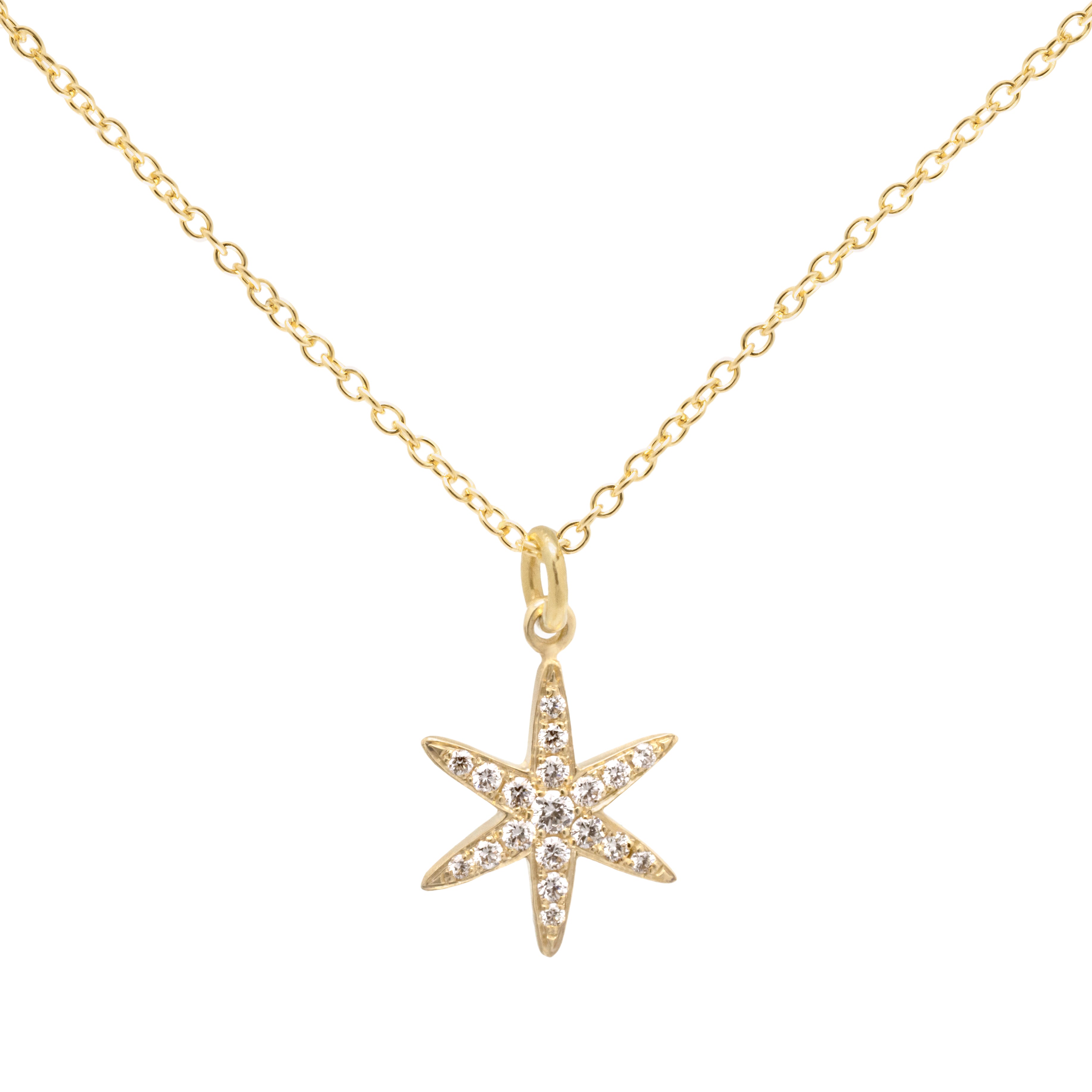 Gold star pendant with graduating diamonds paved on one side, on 16-18" fine cable chain. ~0.097 Diamond total carat weight.