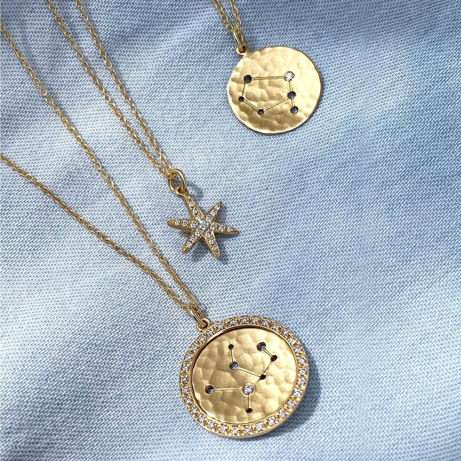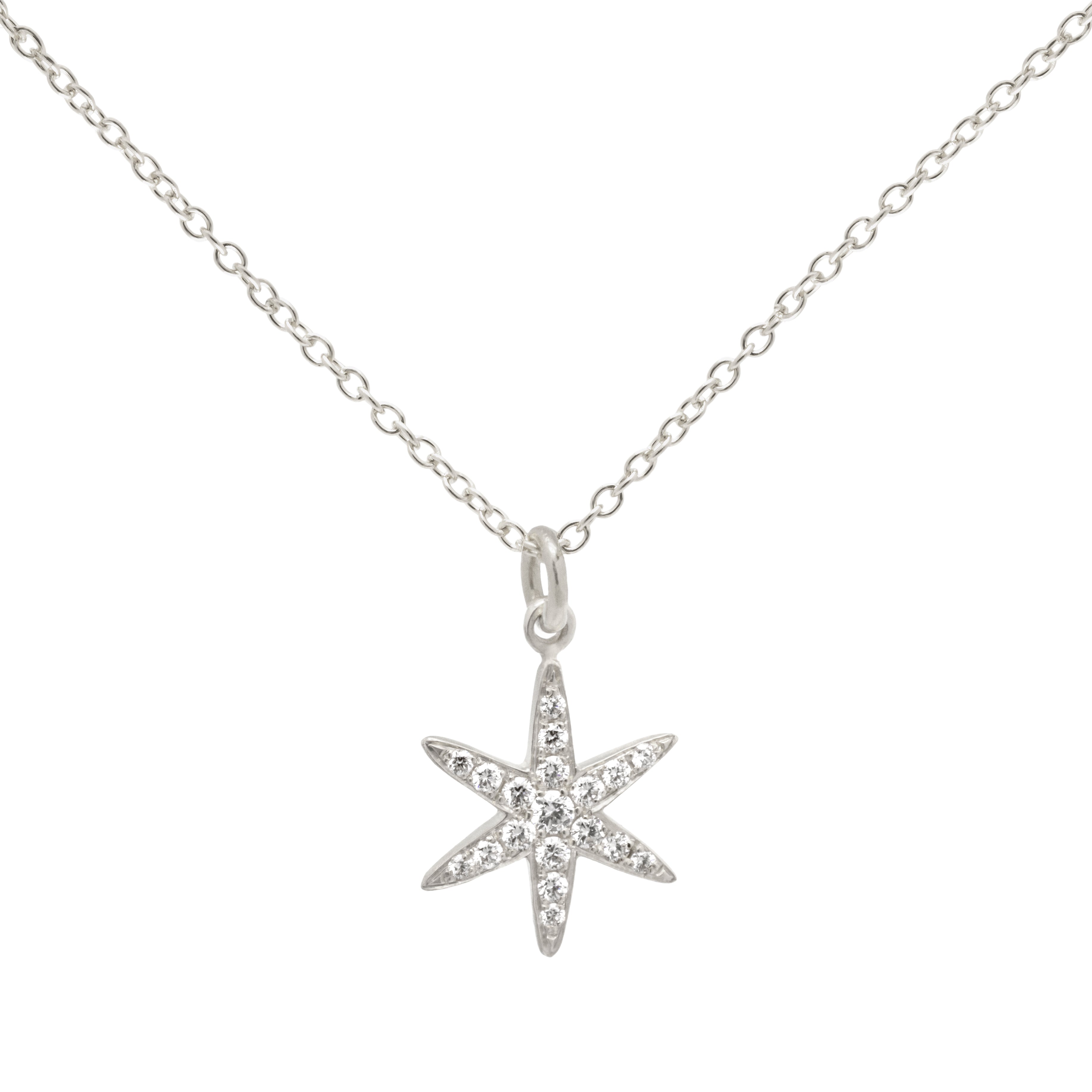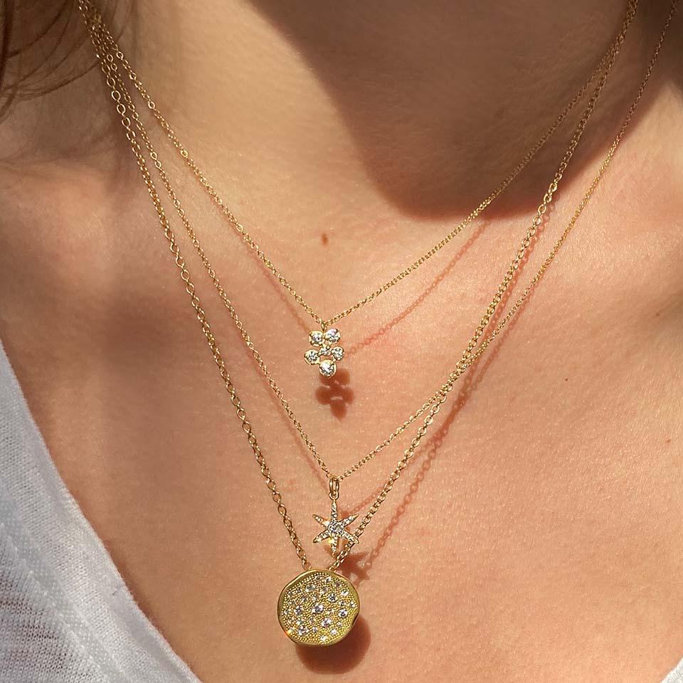 Gold star pendant with graduating diamonds paved on one side, on 16-18" fine cable chain. ~0.097 Diamond total carat weight.