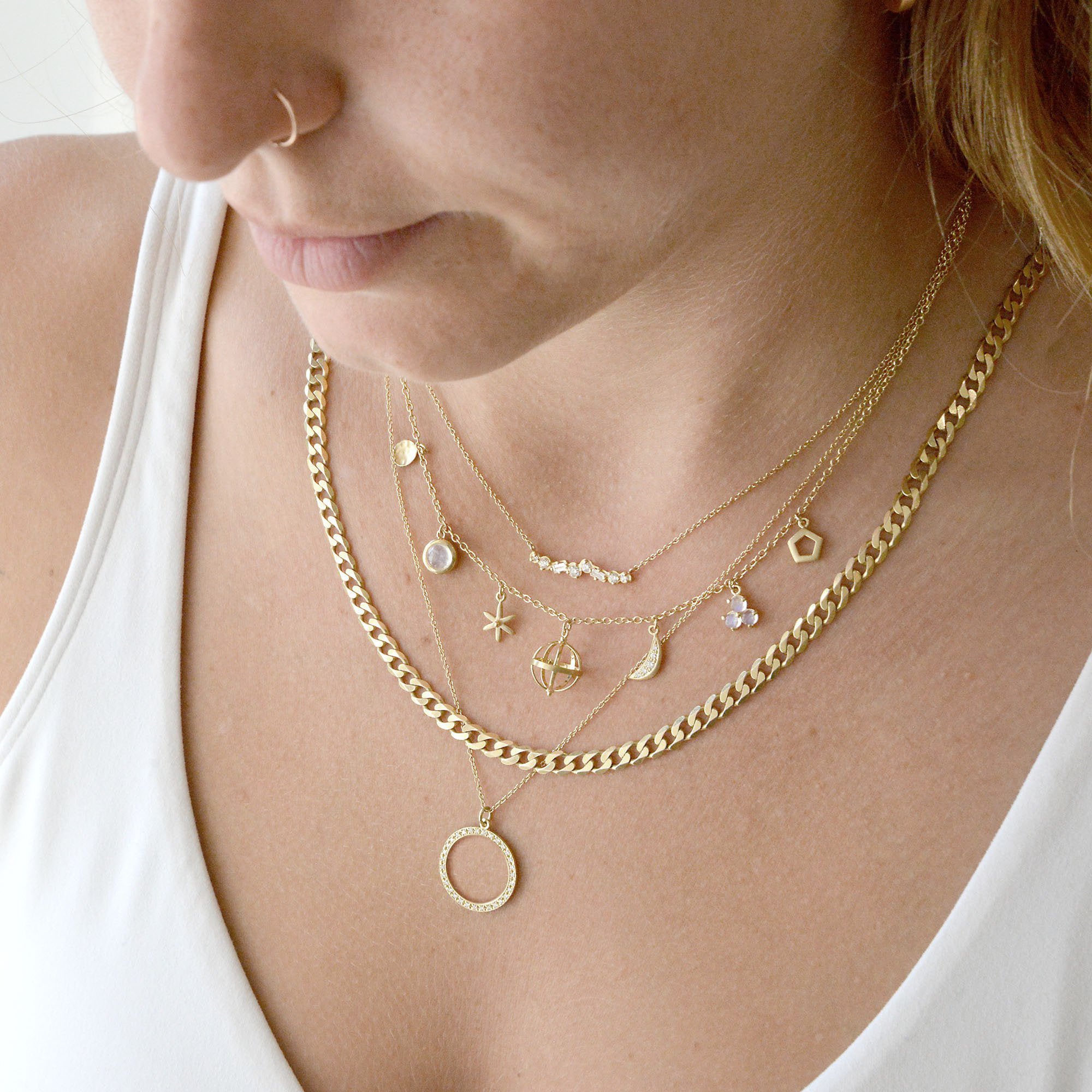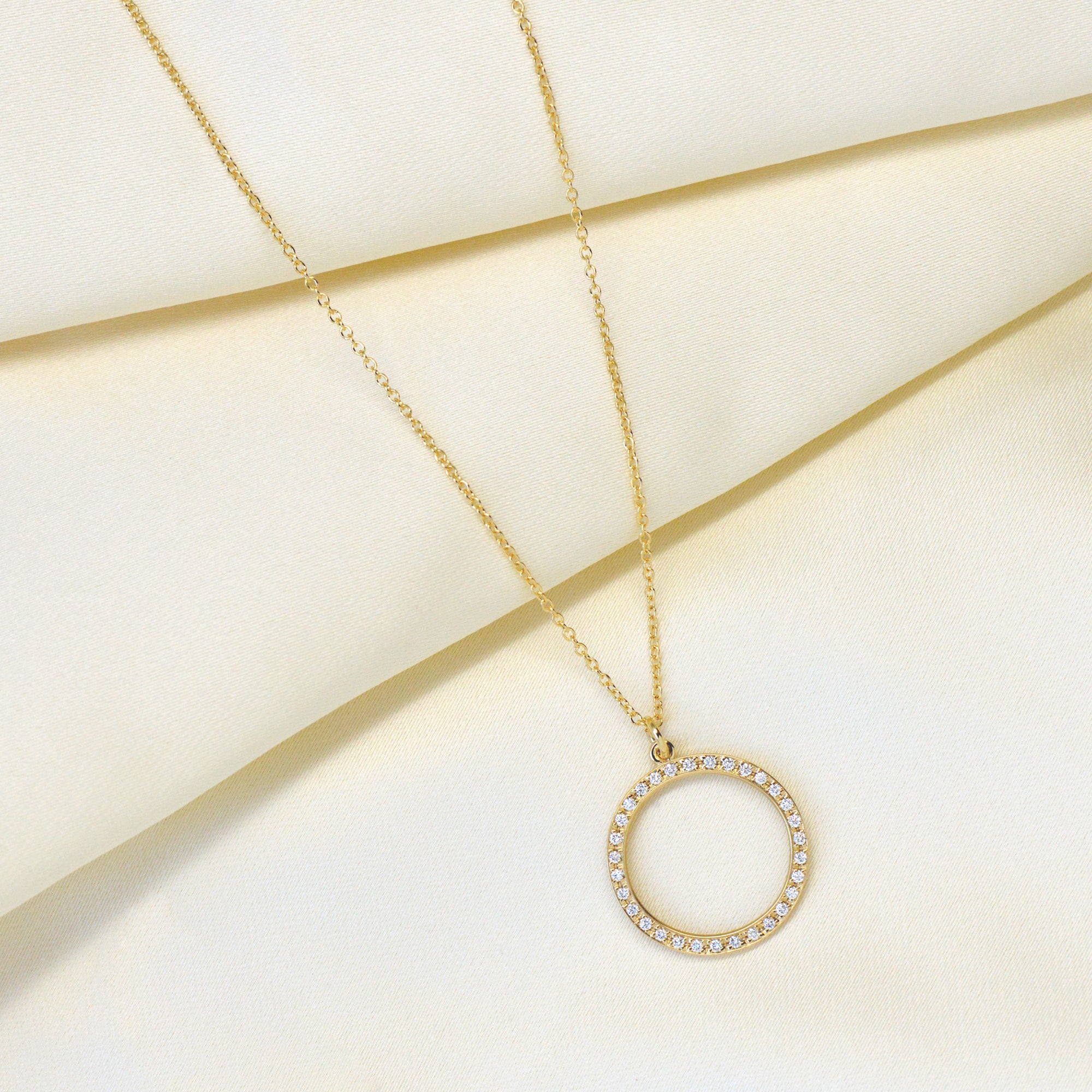 Gold "Celestial" Halo open circle paved with 1mm round brilliant cut G/VS diamonds, on fine cable chain, 16-18" length.