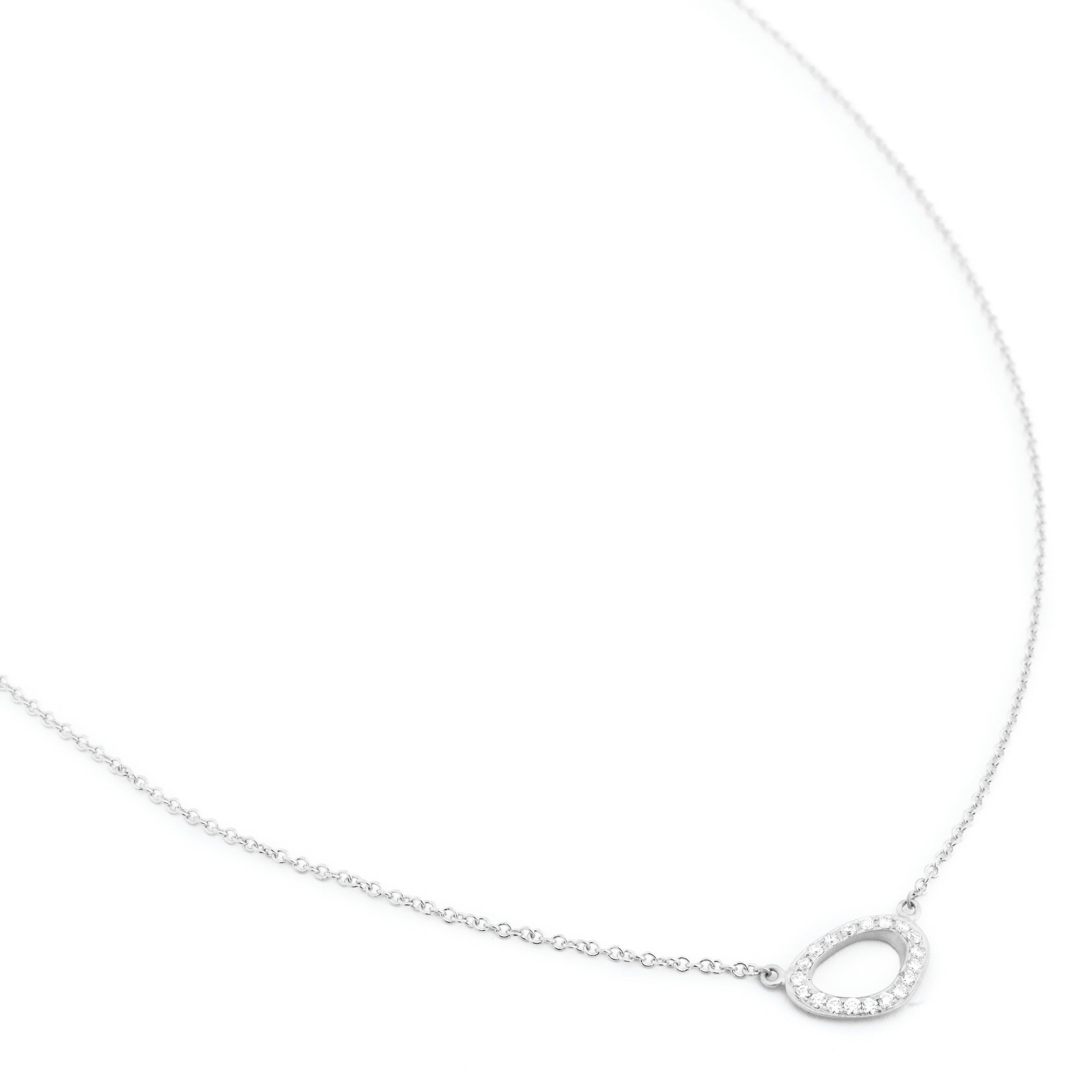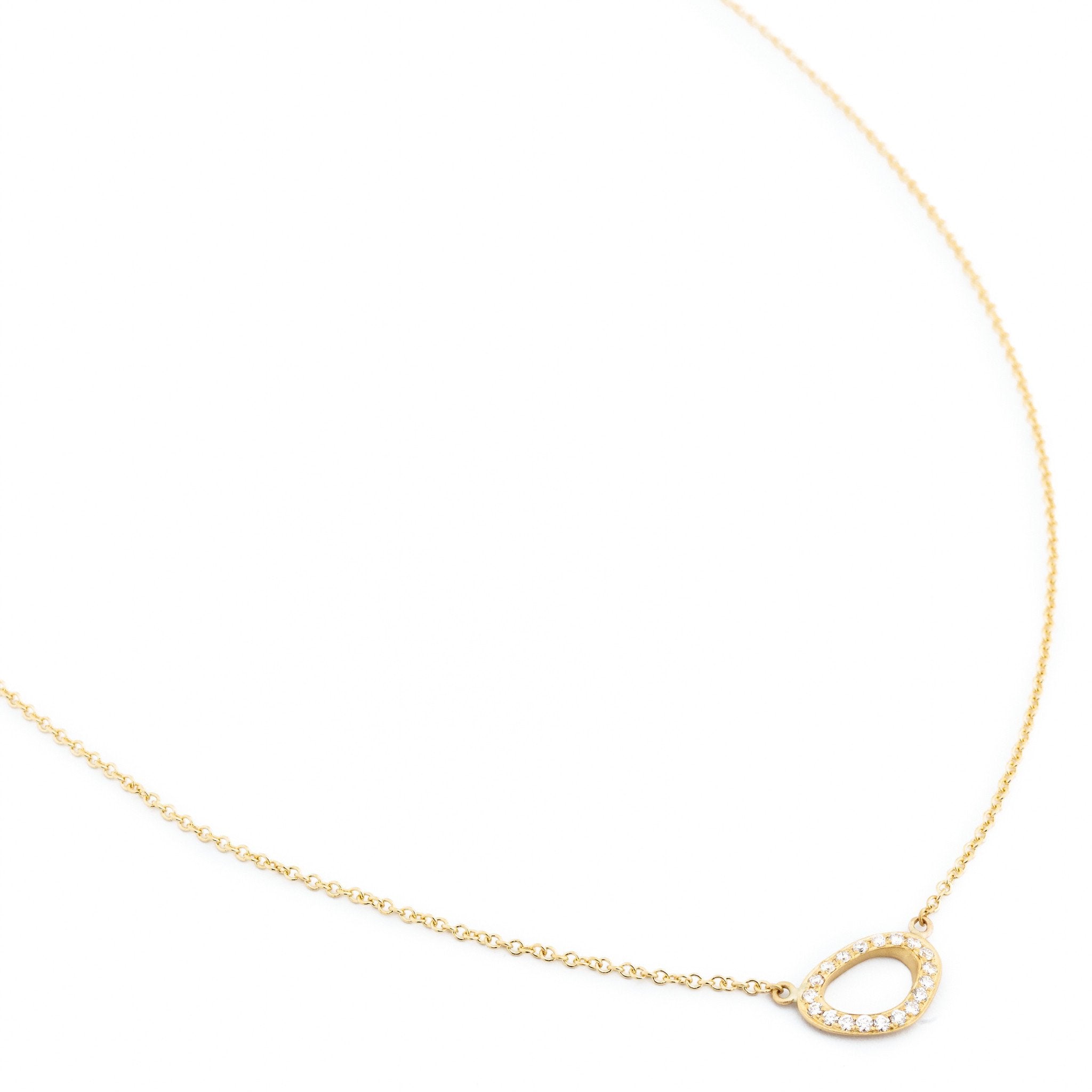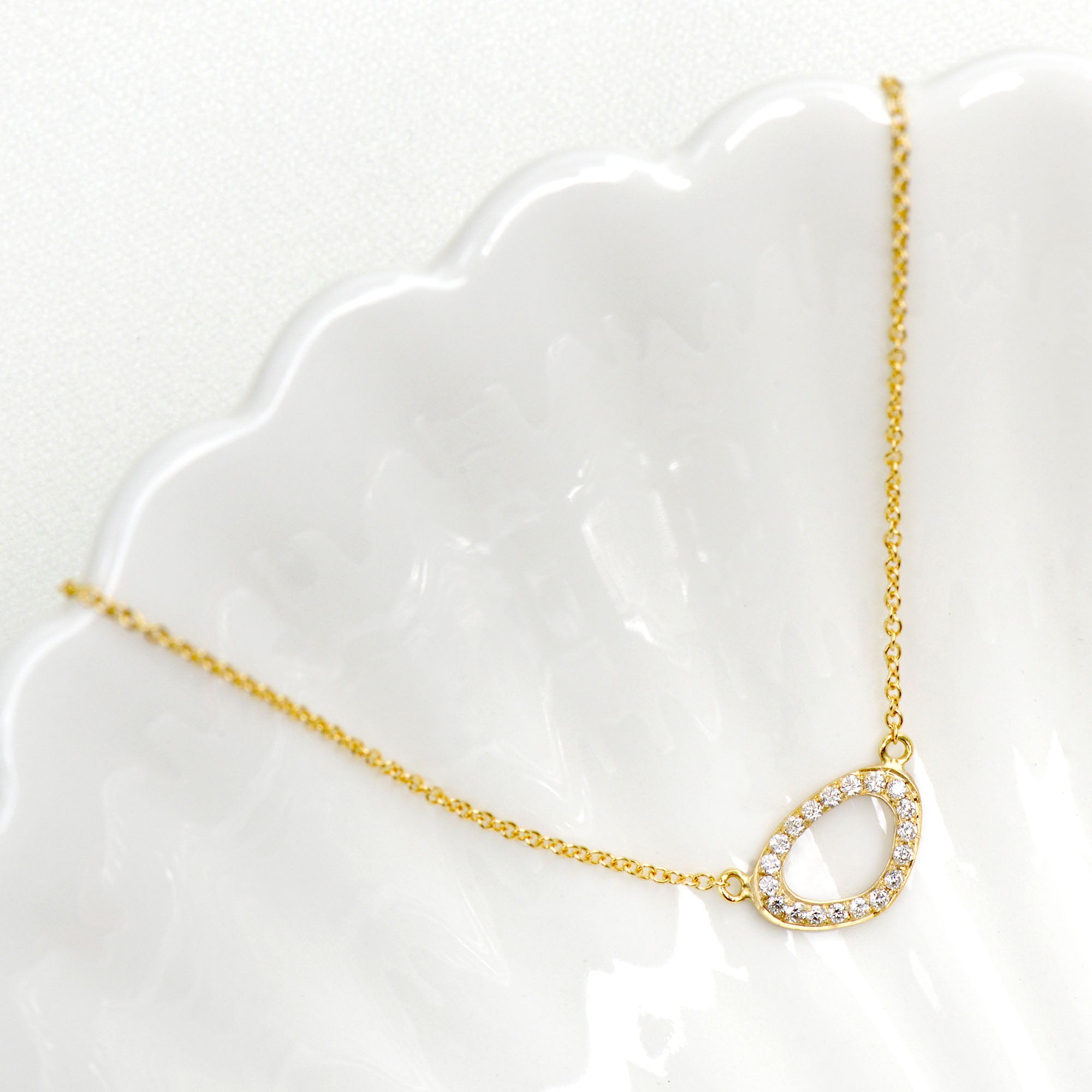 18k yellow gold or 14k white gold "Lilydust" necklace with horizontal small organic open kidney shape (7.5x11mm) edged in ~19 x 0.005 carat diamonds, 16-18" adjustable fine cable chain, ~0.09 total carat weight.