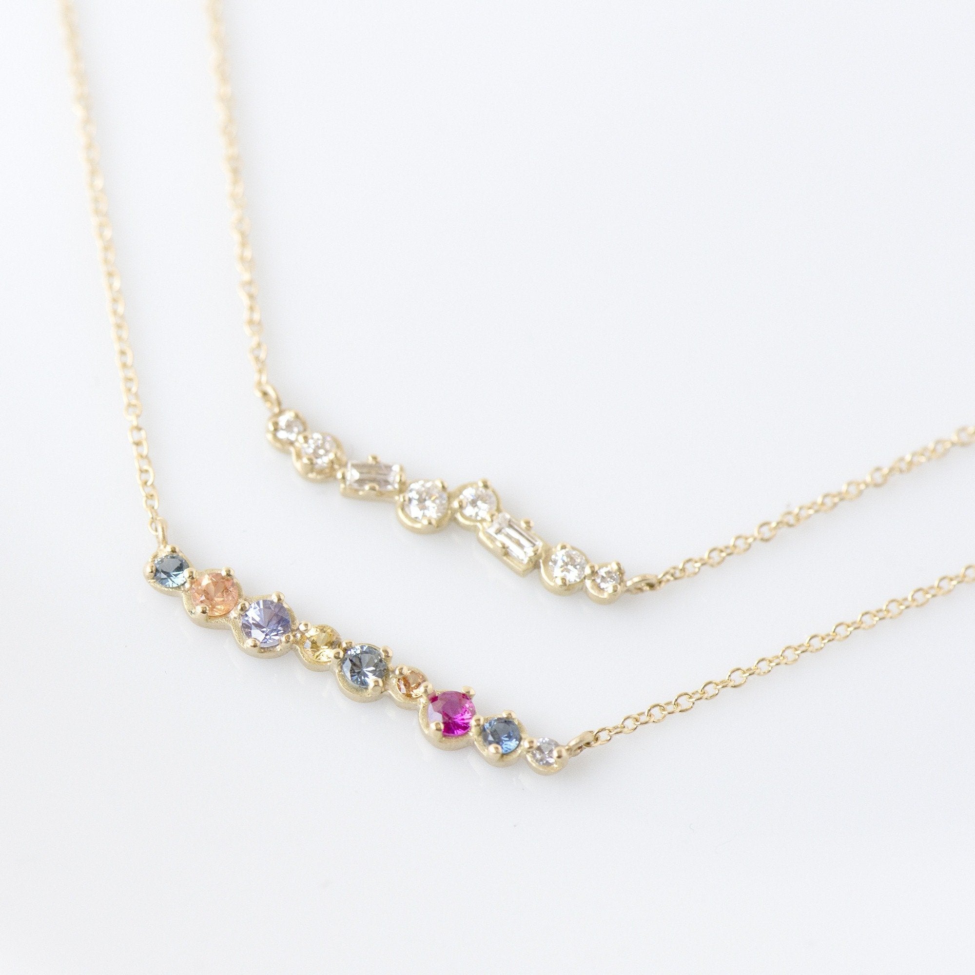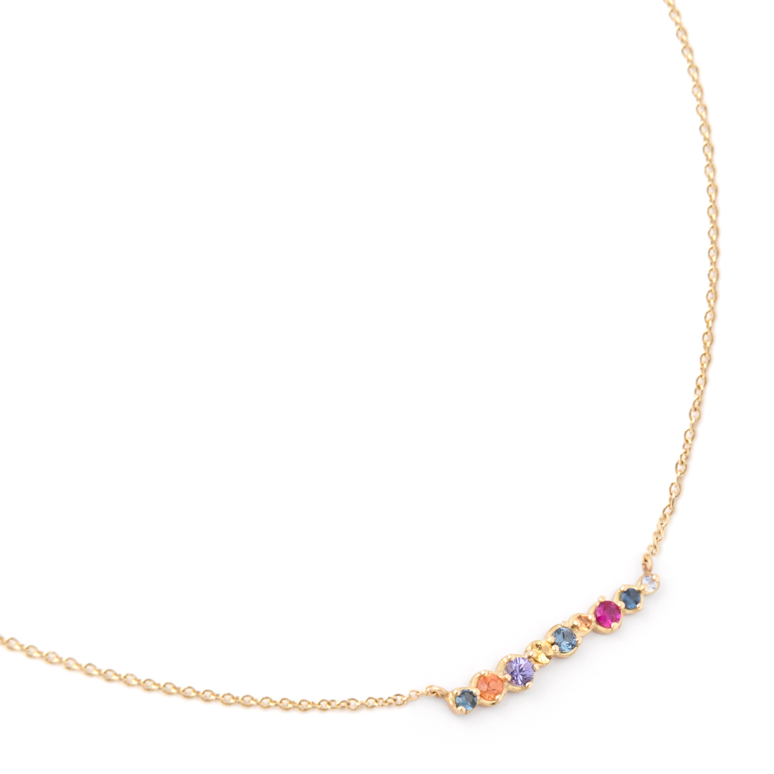 Pretty & Playful, fall for our 'Festival' Collection gold necklace with bar pendant of round multi-colored sapphires (of varying sizes) on 16" fine cable chain.