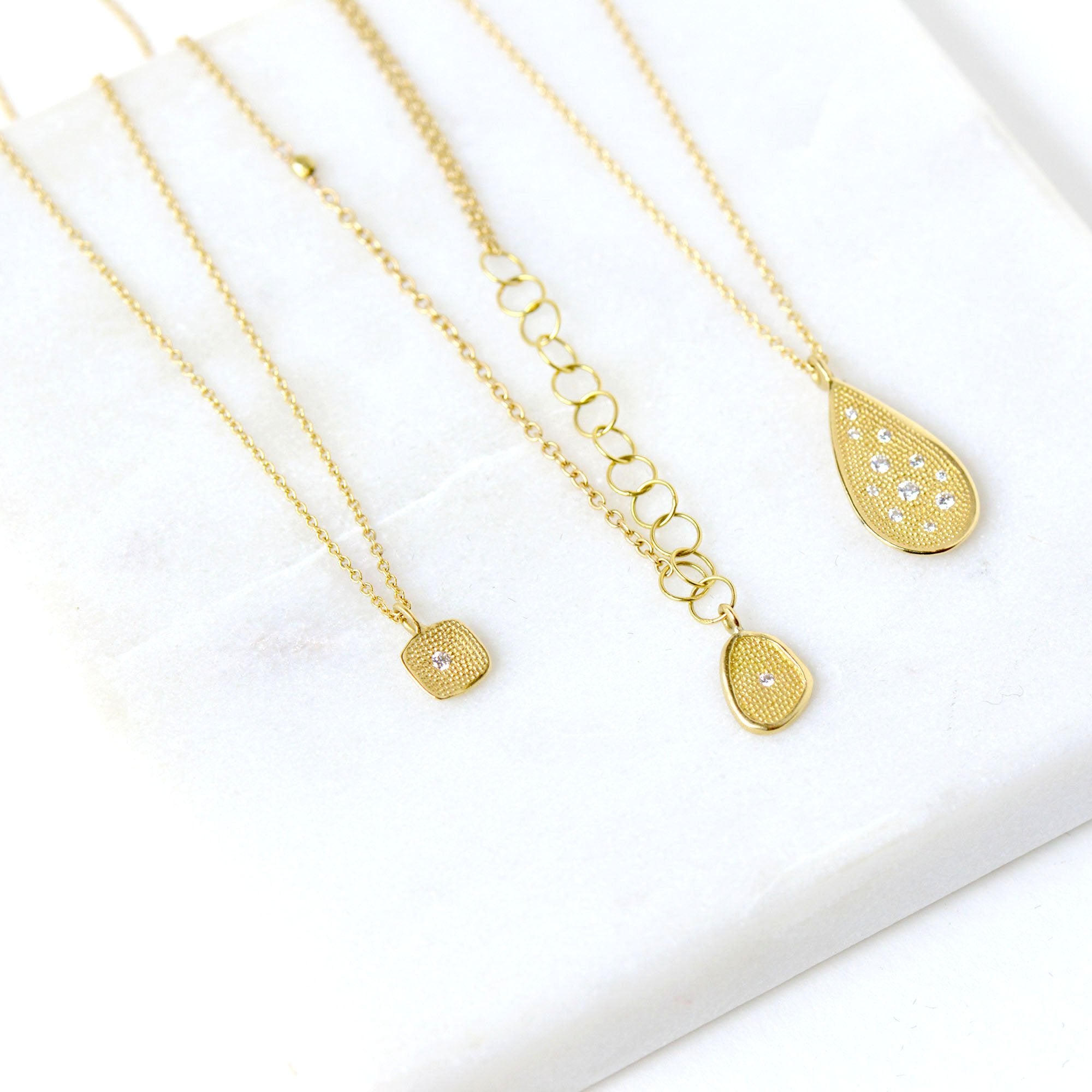 Small gold ' Stardust' organic charm on multi-style gold chain and hex bead necklace.