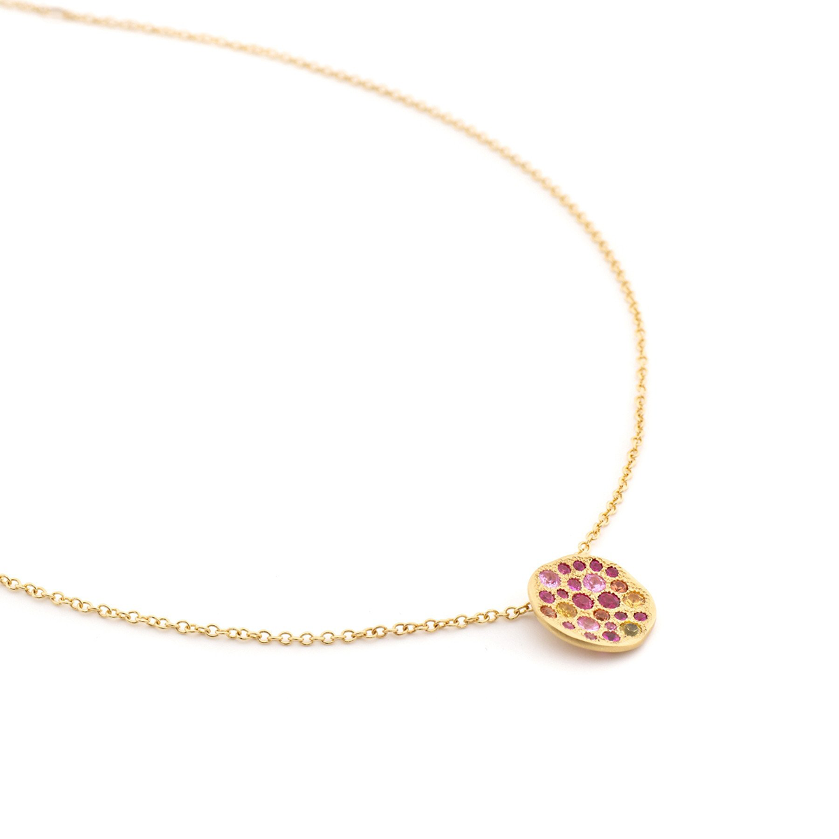 This exclusive Sunburst Sapphire Pendant & Cable Chain is a work of art with its radiant gold cable chain and glittering 14mm medium round Sunburst pendant with vibrant pink, red, orange and yellow Sapphires. Perfect for adding luxury to any occasion.