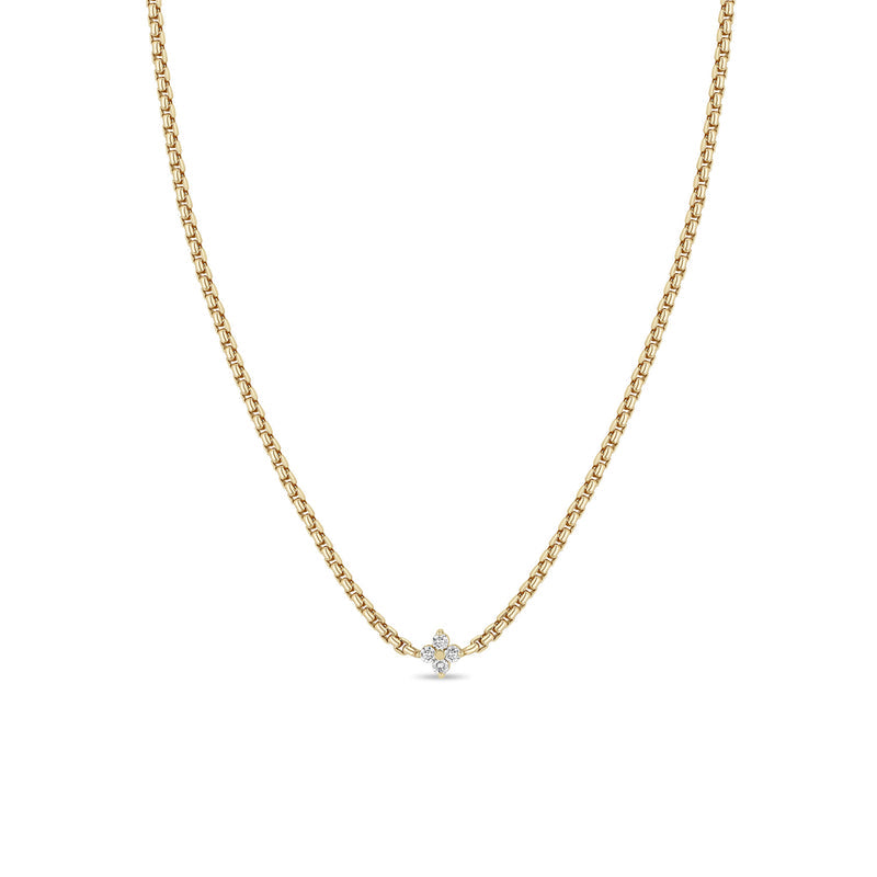 14k gold small box chain necklace with a small quad cluster of prong set round diamonds