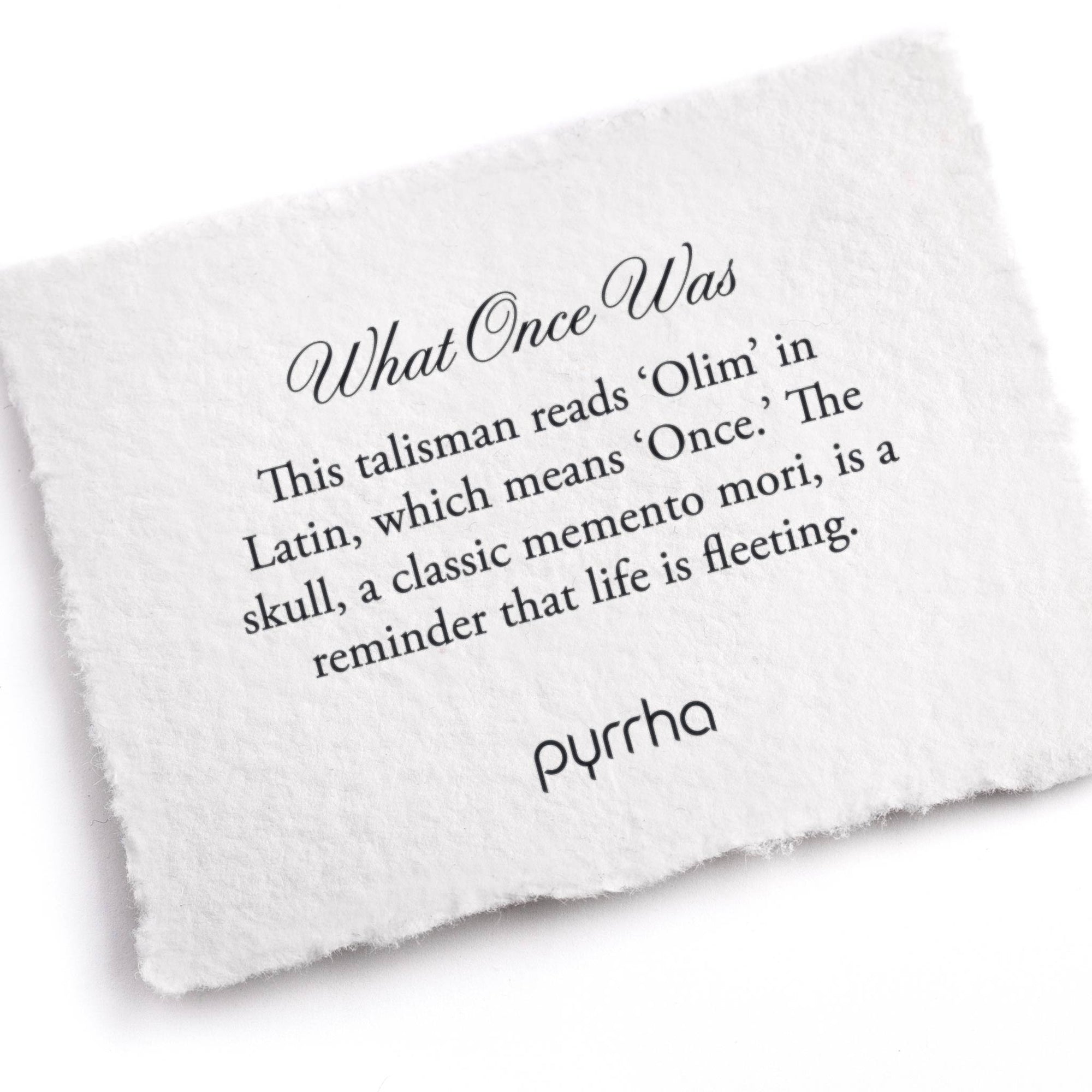 This talisman reads 'Olim' in Latin, which means 'Once.' The skull, a classic memento mori, is a reminder that life is fleeting.