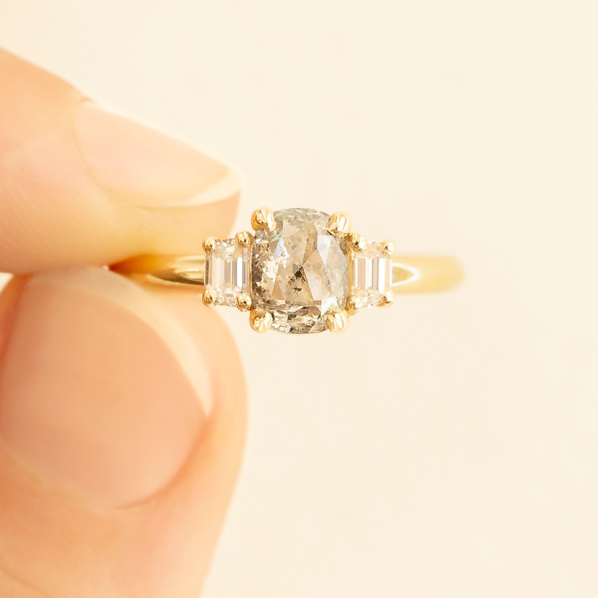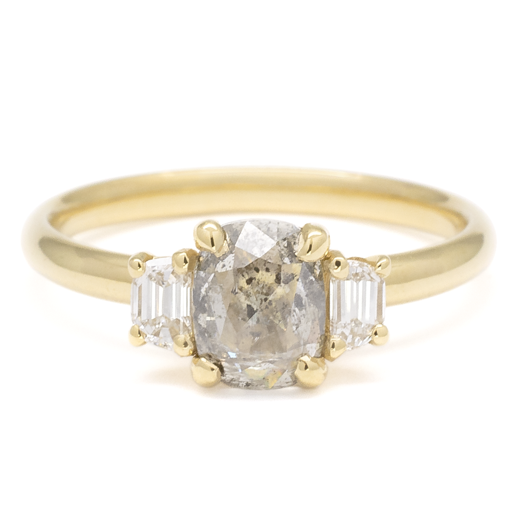 - Center Diamond: 0.77ct Elongated Cushion Salt + Pepper Diamond. 6.58mm x 5.1mm