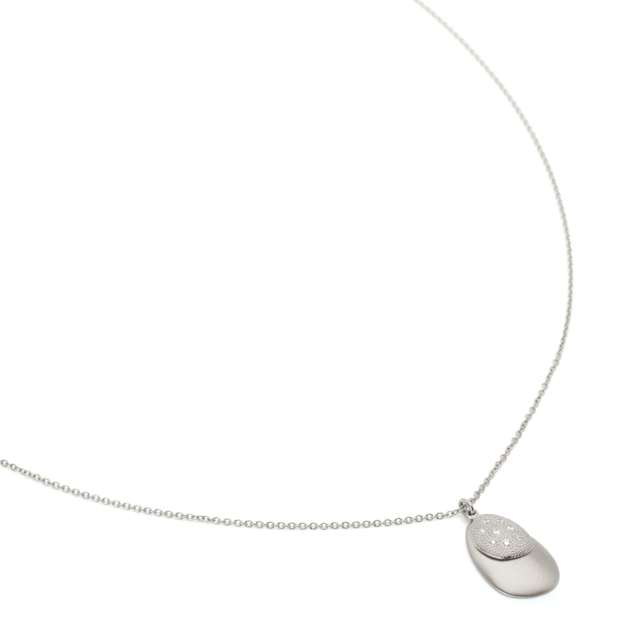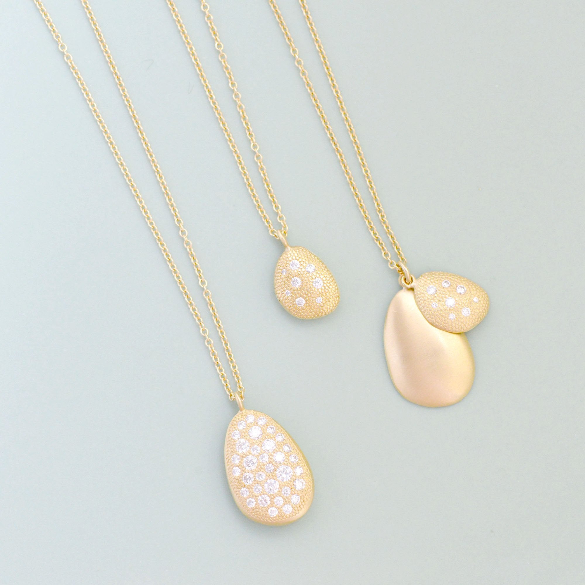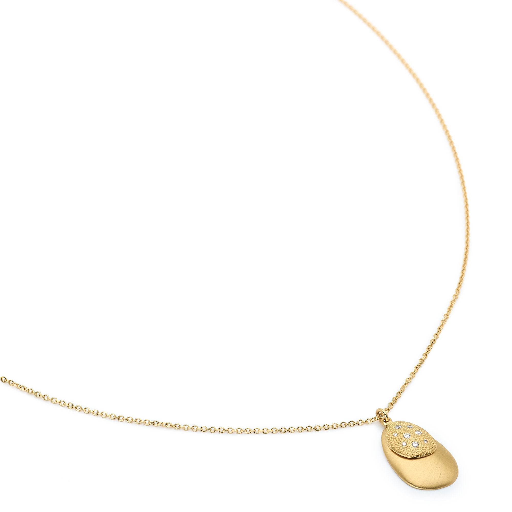 Gold and diamond ‚Double Petal necklace features an overlapping petal pendant with the top petal set with 8 round brilliant cut diamonds weighing a total of 0.074 carats, all G in color and VS in clarity. The petal elements have a matte brushed finish. The necklace chain measures 18-20" with a circle spring clasp.
