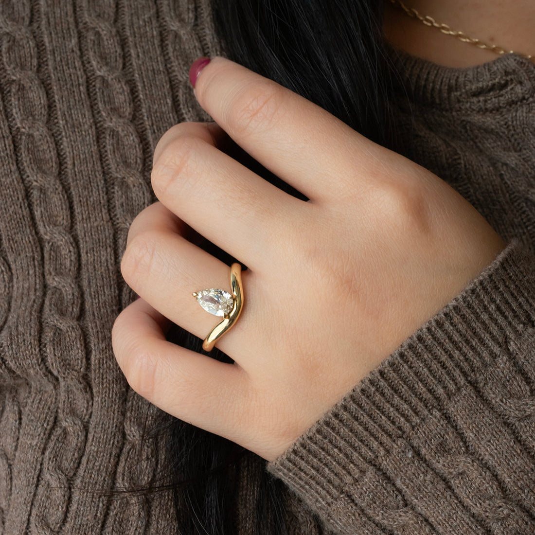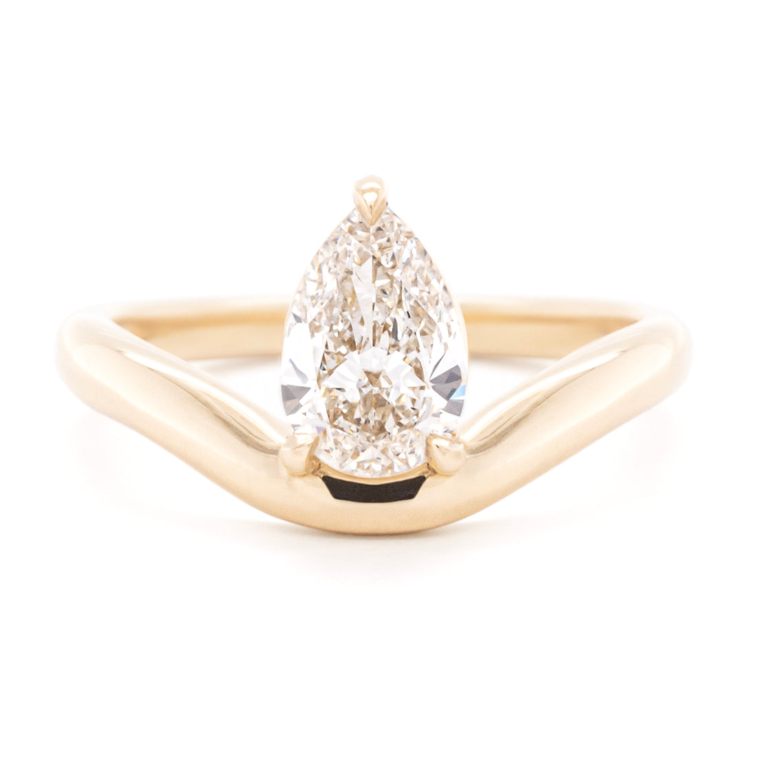 The pale champagne pear diamond nestles perfectly in the wave of this unique hand carved mount.