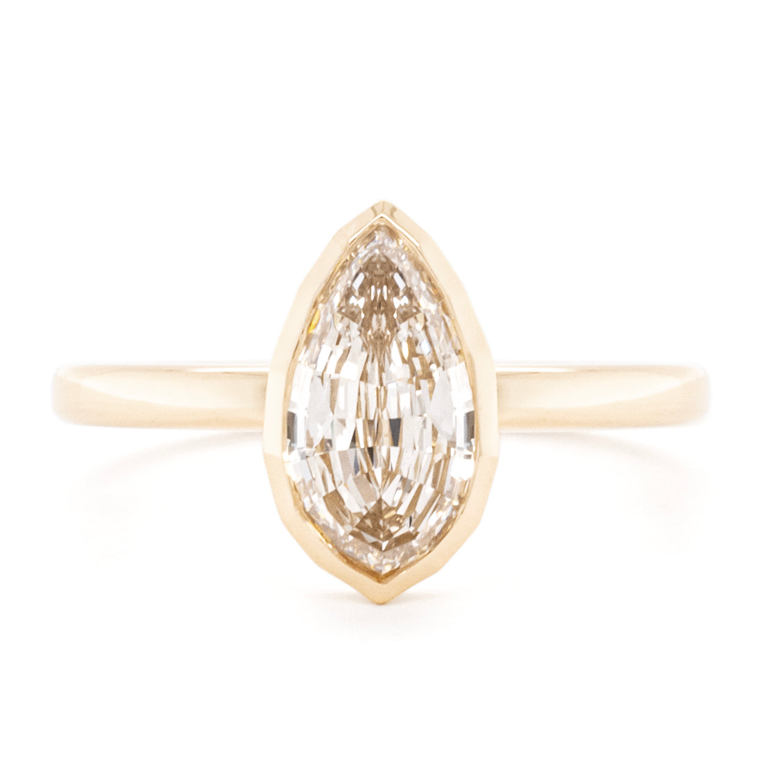 Slightly warm in color, this unique modern 'Geo' cut Pear diamond is set in 'Piper' mount.