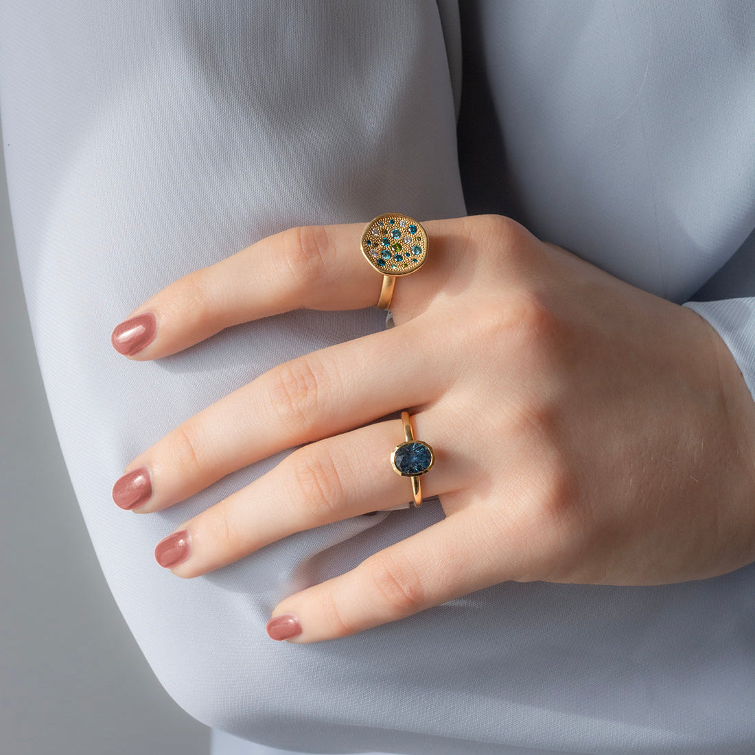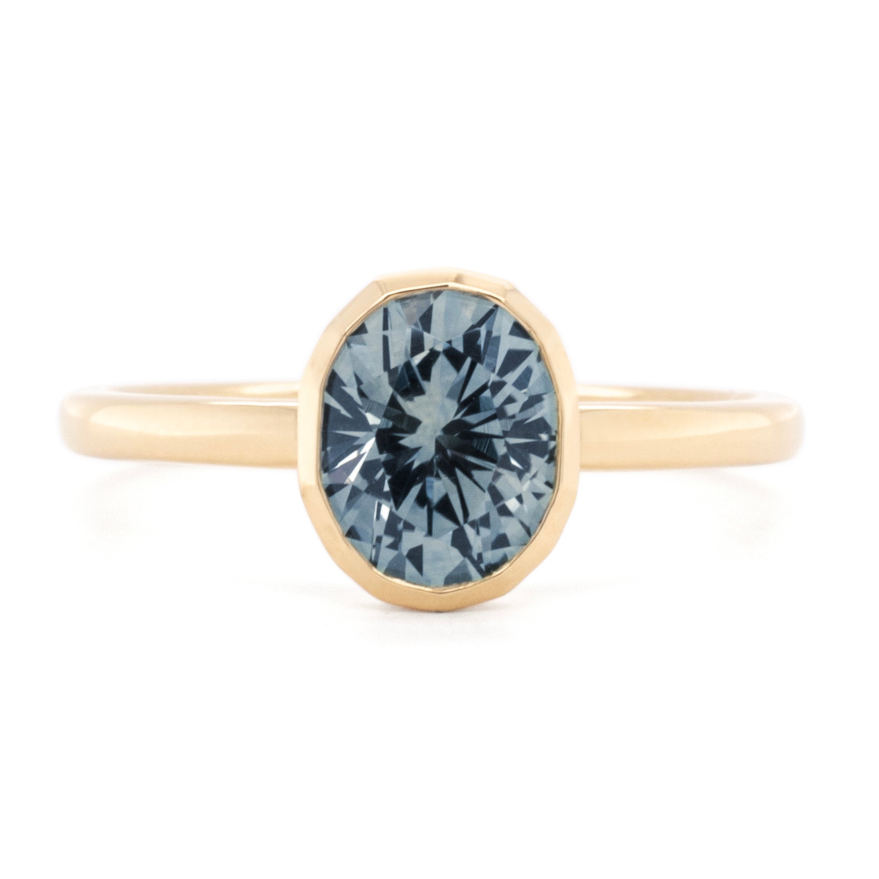 Micro Bezel open piper mount, following the modified oval shape of the stone. 18k yellow gold. 2mm Band