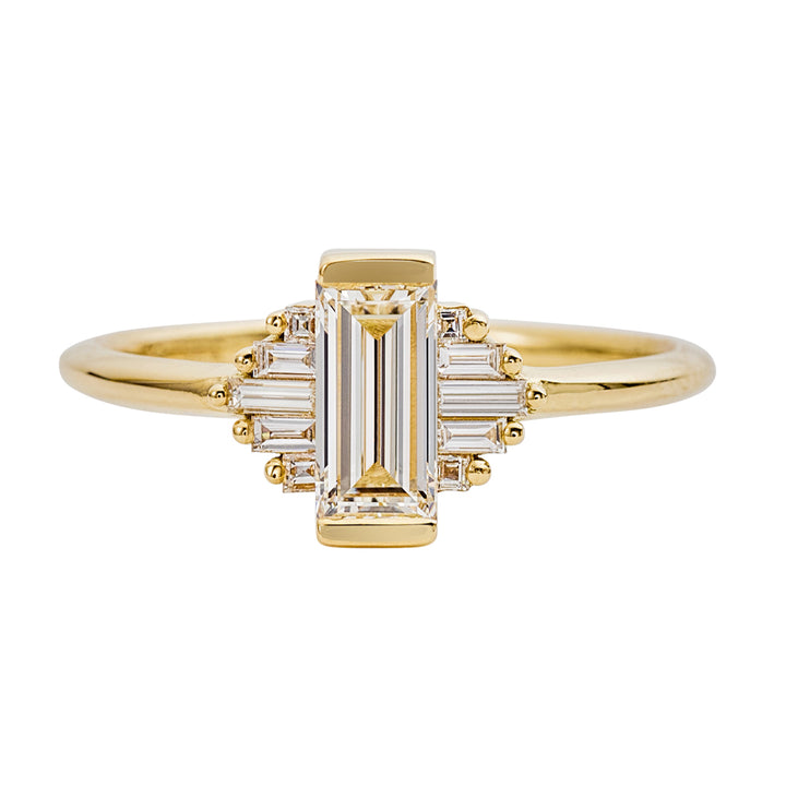 The classic art deco engagement ring with baguette cut diamonds is architectural and modern. This ring exemplifies the art deco era which combined modern style with fine craftsmanship and rich materials.
