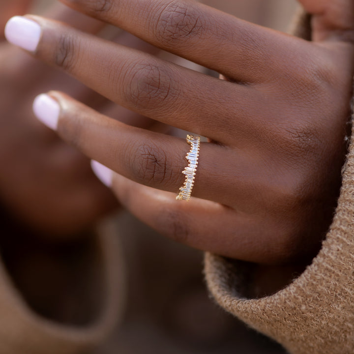The cityscape eternity ring with needle baguette diamonds creates a sparkling panorama with diamonds and gold. This ring features an assortment of needle baguette diamonds that wrap all the way around your finger; resembling a glamorous and futuristic city block.