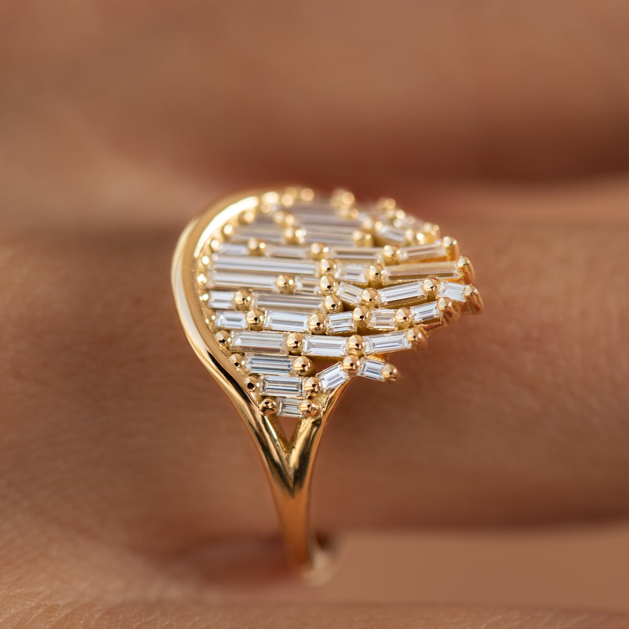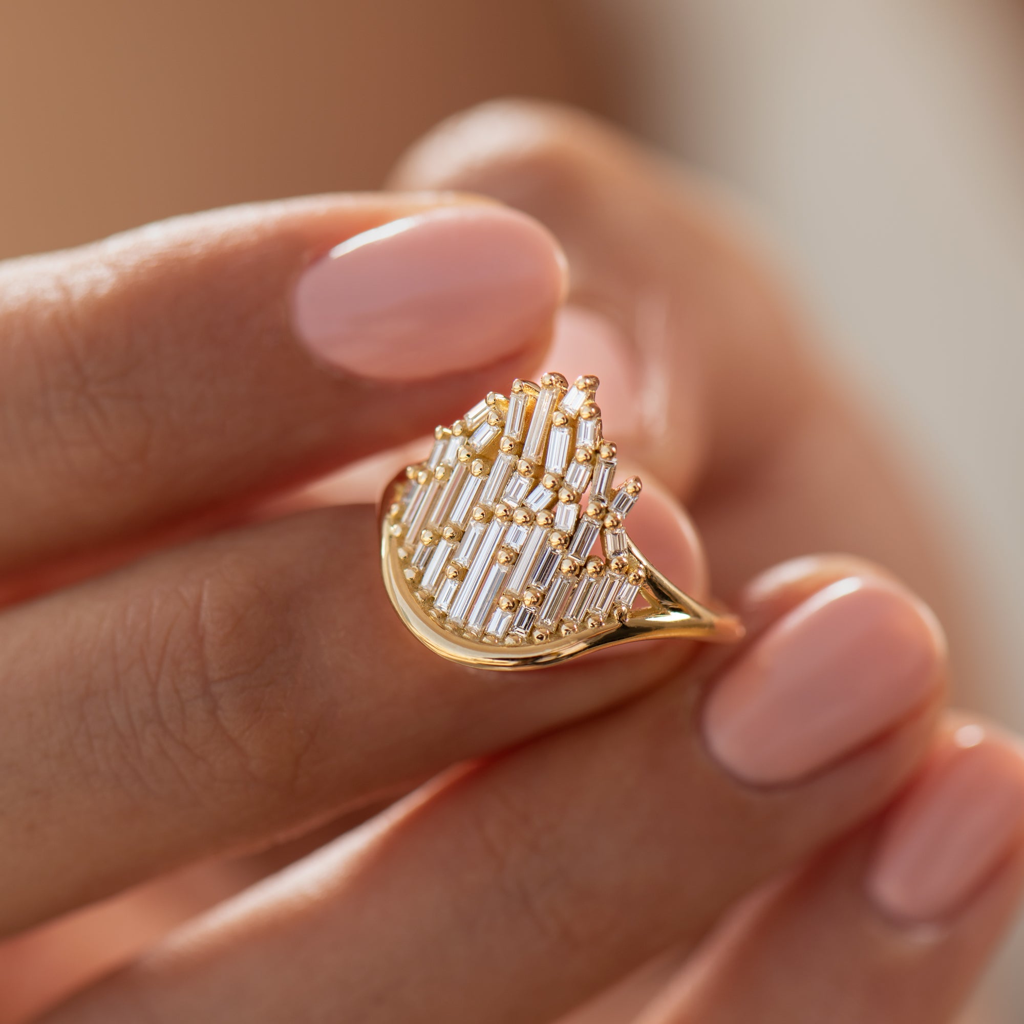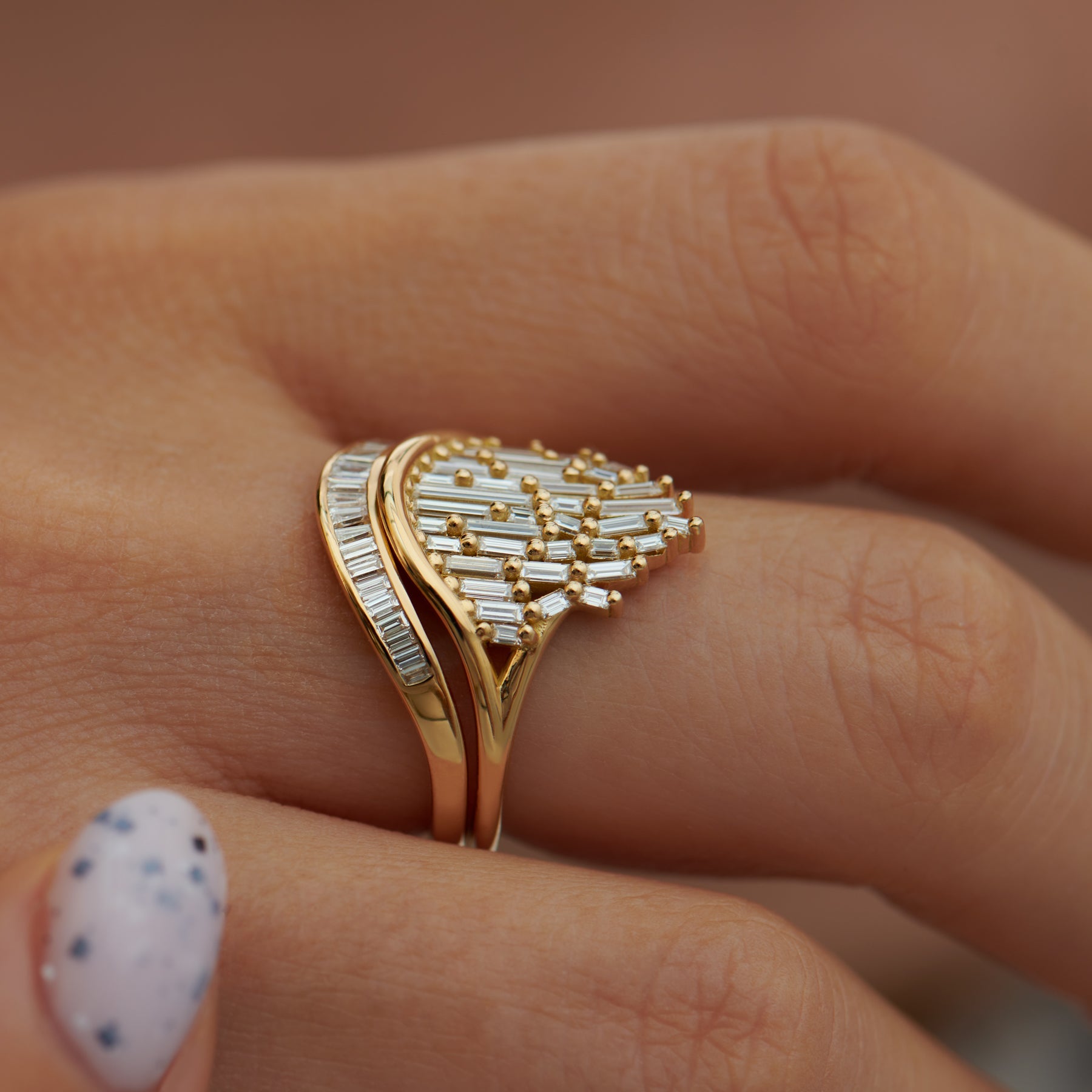 The assortment of white needle cut baguette diamonds climb up your finger stunningly with its glitter and sparkle. The Gentle Wave Baguette Diamond Ring's soft elegance is sure to catch your attention.