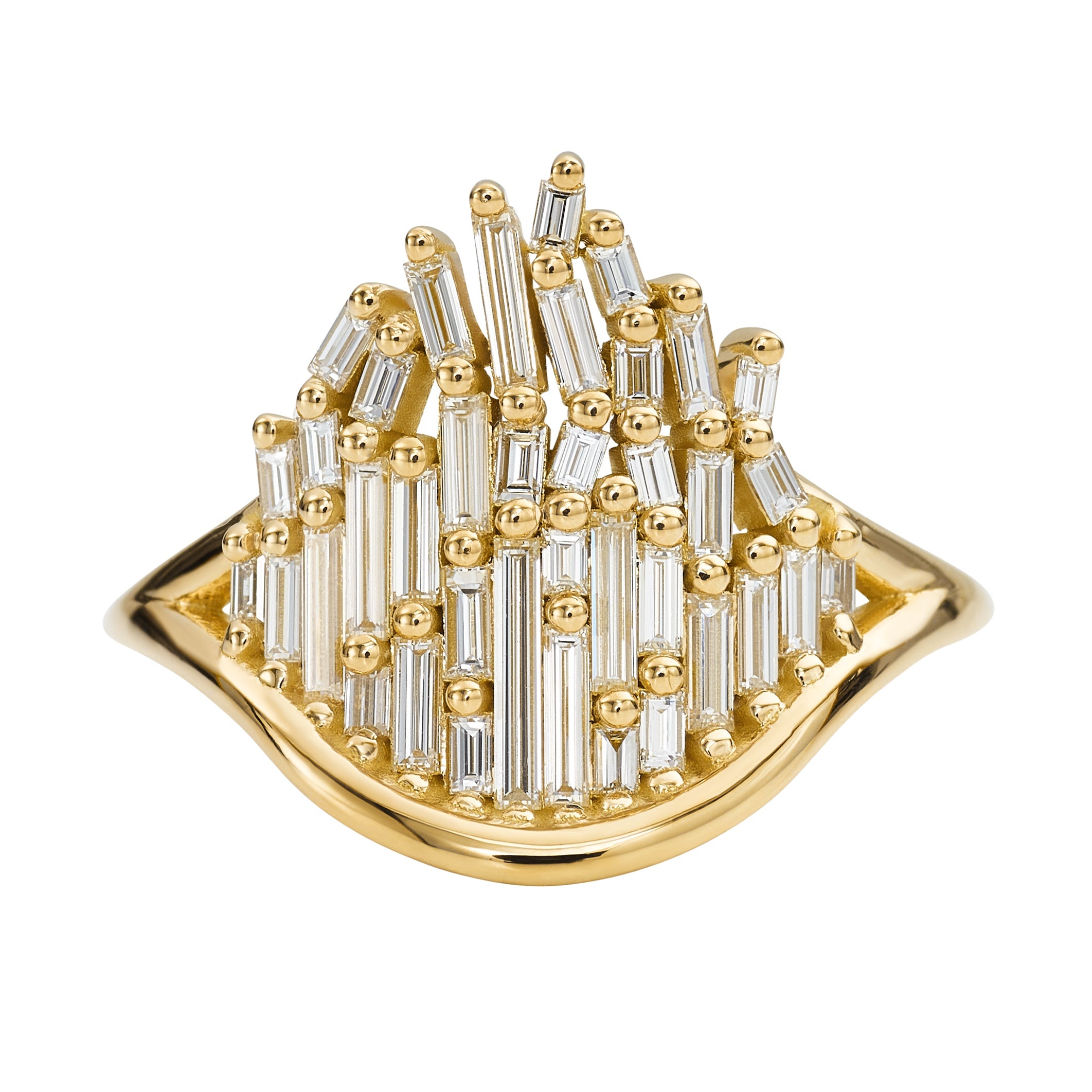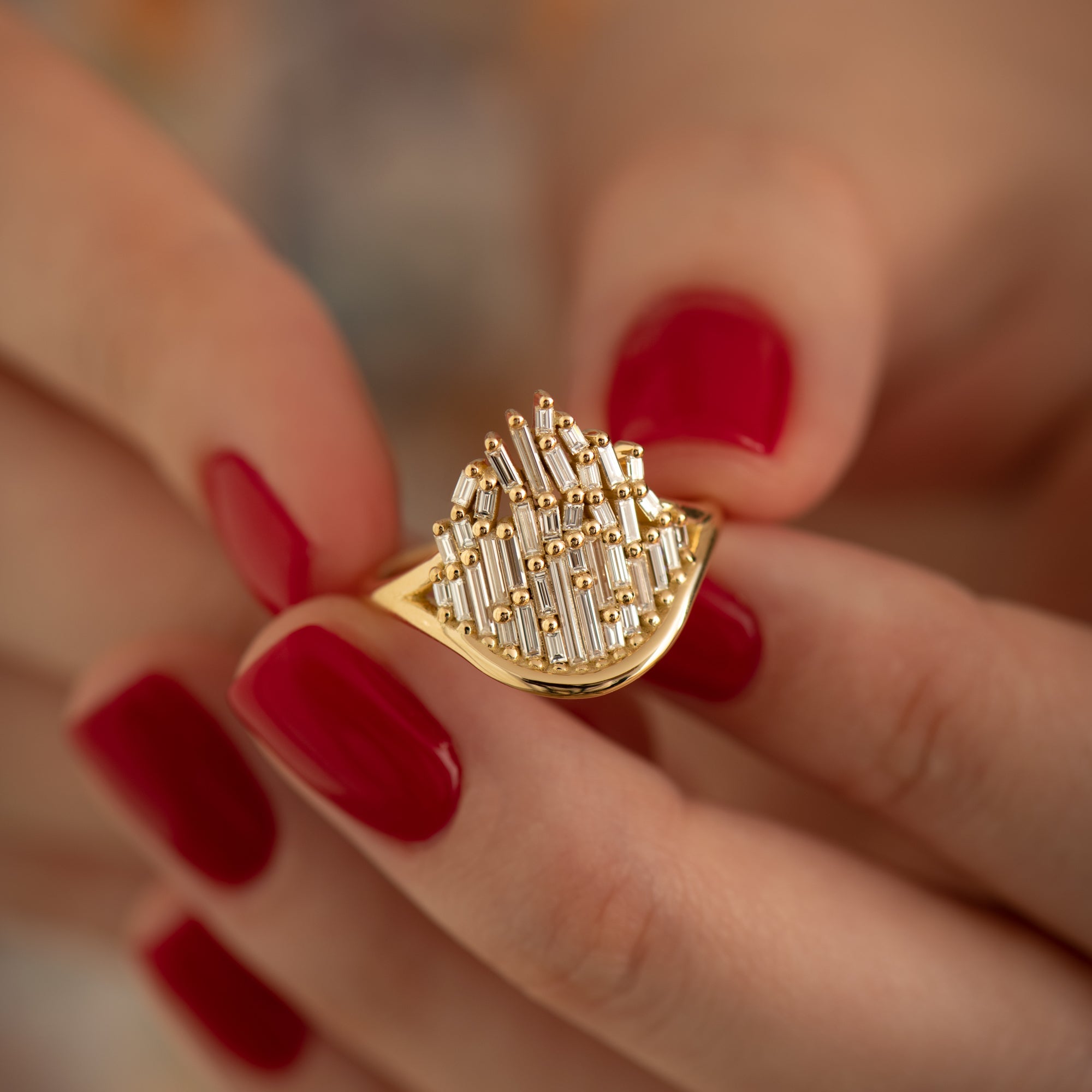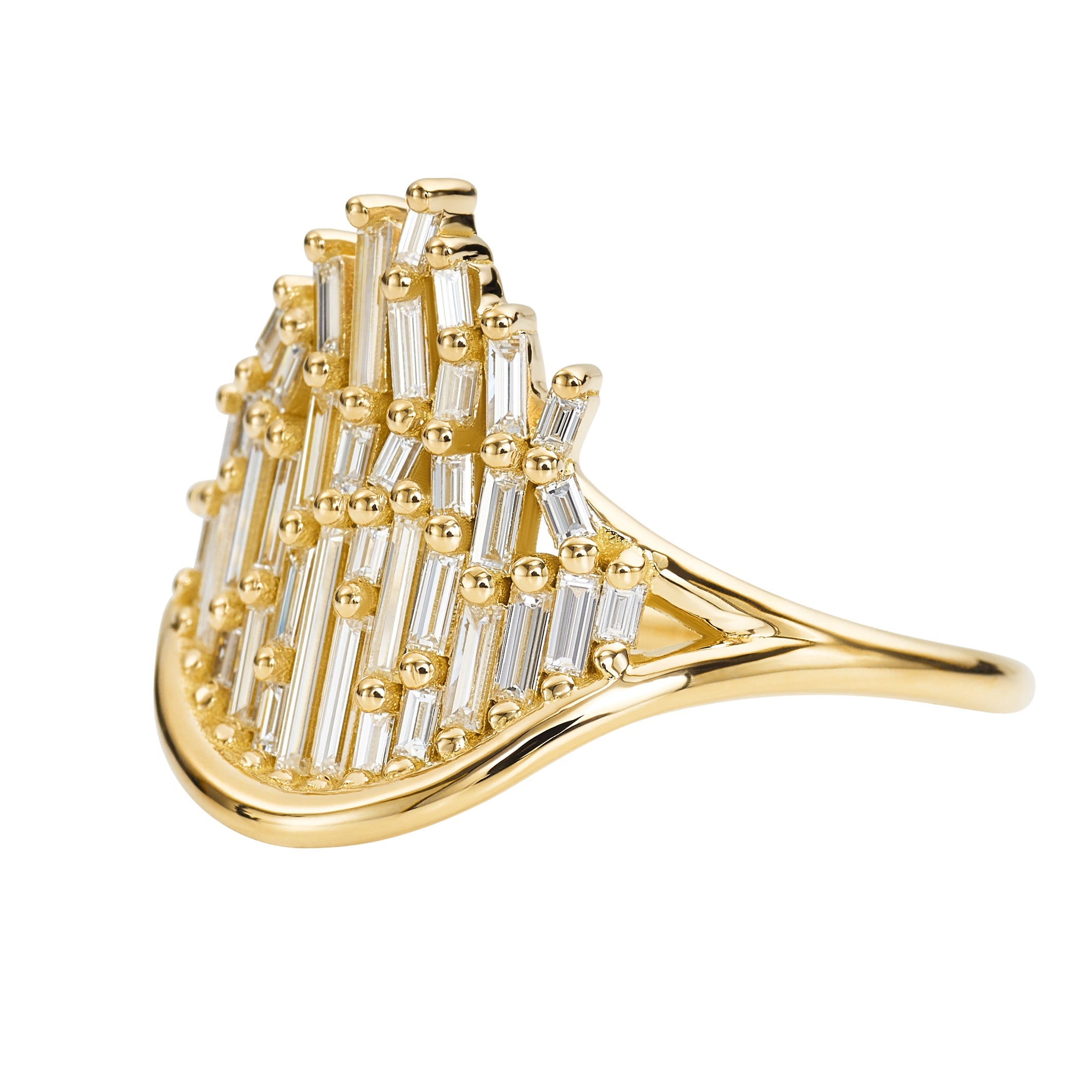 The assortment of white needle cut baguette diamonds climb up your finger stunningly with its glitter and sparkle. The Gentle Wave Baguette Diamond Ring's soft elegance is sure to catch your attention.